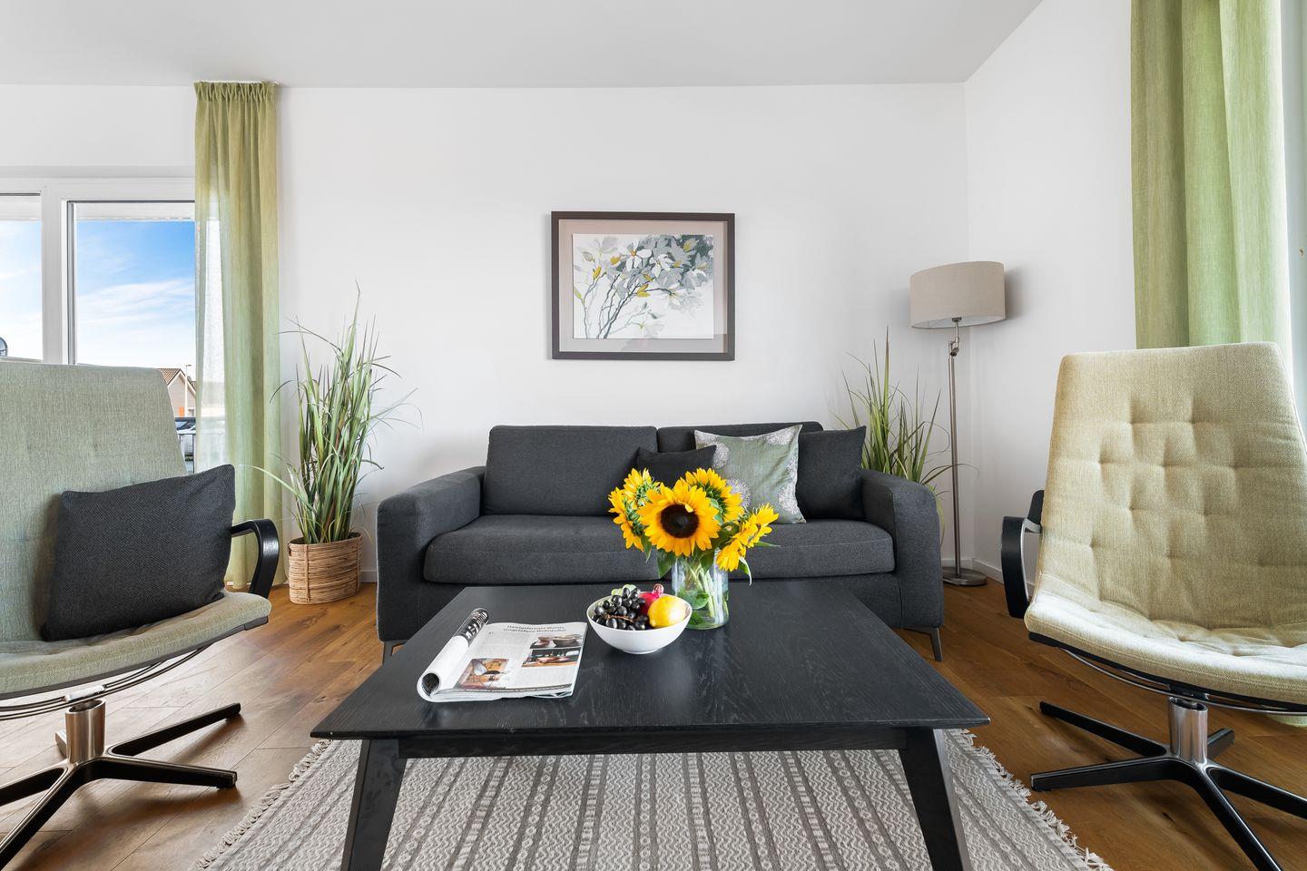 Die nordisch, elegante Einrichtung macht den Wohnbereich zu einem wahren Wohlfühlort. Bequeme Sitzmöbel, Kaminofen und ein Flatscreen laden zum Entspannen ein. Ein abendlicher Rotwein zu knisterndem Kaminfeuer - was gibt es Schöneres.