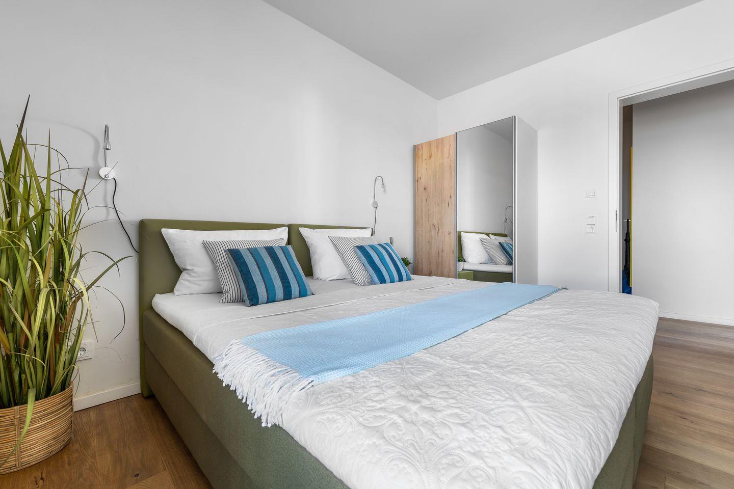 Die Schlafzimmer erwarten unsere Gäste mit hellen Erd- und Grüntönen. Große Boxspringbetten und bodentiefe Fenster, die sich durch Gardinen abdunkeln lassen, versprechen hier geruhsame Nächte.