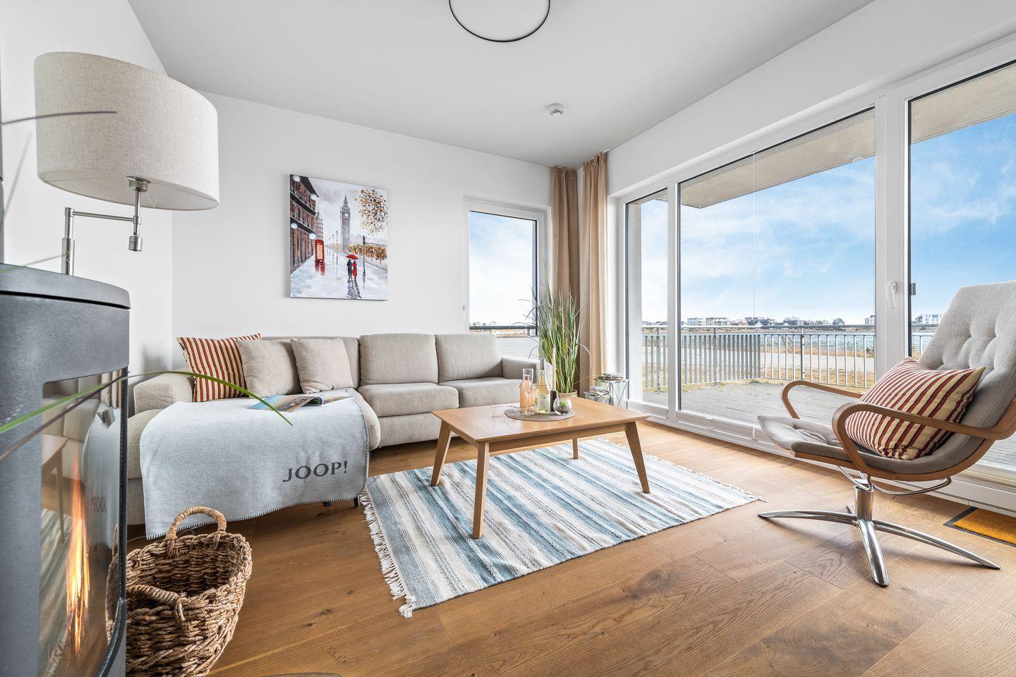 Der Wohnbereich erwartet unsere Gäste mit maritimem Flair, hell-nordischer Einrichtung und Gemütlichkeit. Durch die großzügige Panoramawand ist die Wohnung immer lichtdurchflutet und bietet einen traumhaften Blick auf Ostsee und Schlei. Kaminofen, gemütliche Sitzmöbel und ein Flatscreen laden zur Urlaubsentspannung ein!