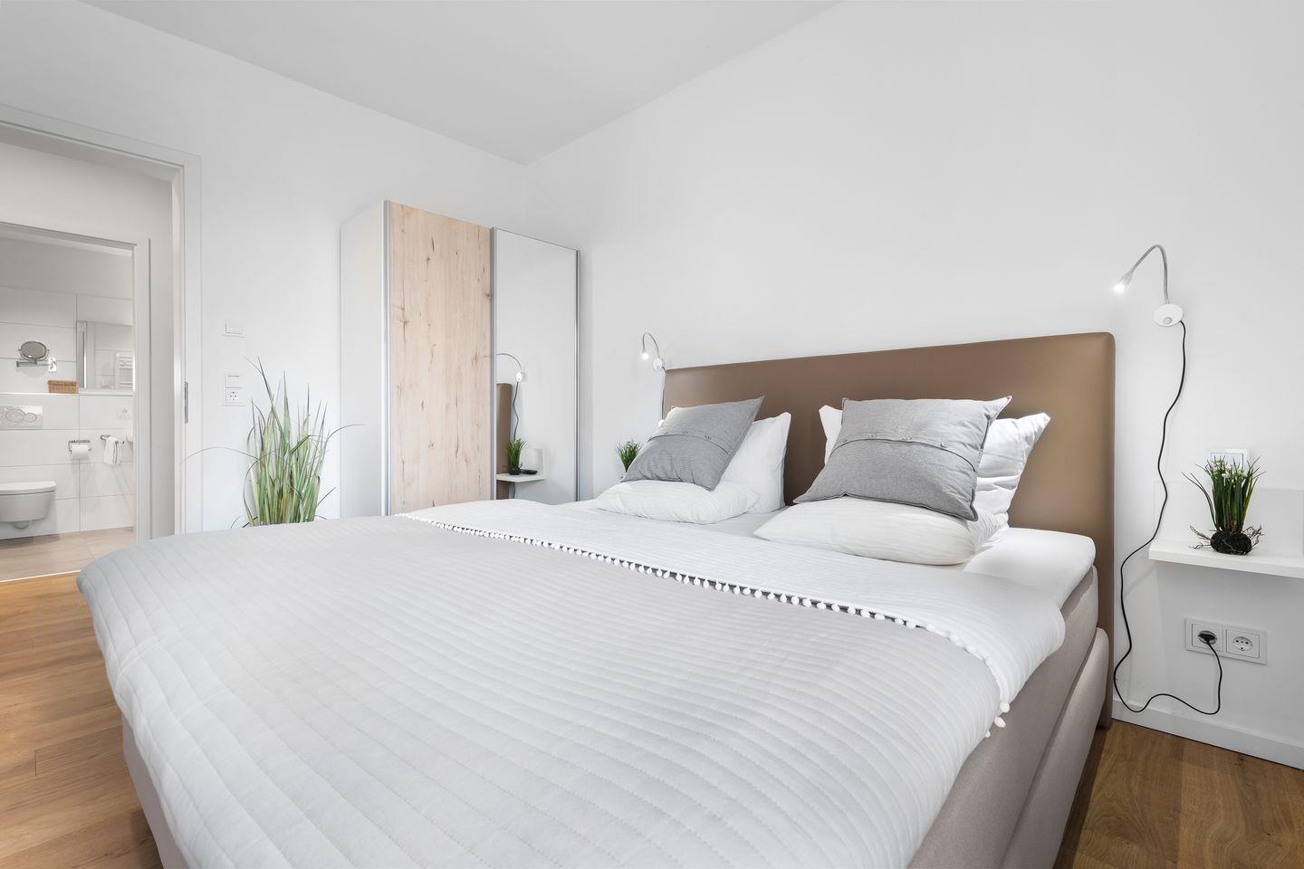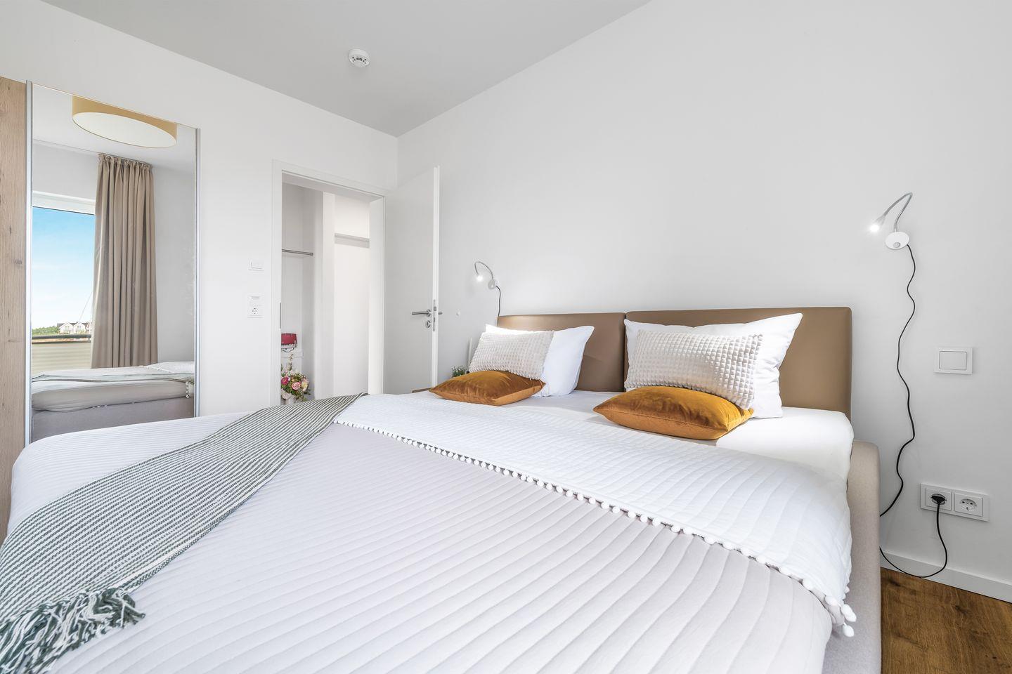 Die zwei Schlafzimmer bieten Platz für vier Personen und verfügen über hochwertige Boxspringbetten, Kleiderschränke und bodentiefe Fenster. Für gemütliche Filmabende steht in einem der Schlafzimmer ein Smart-TV bereit.