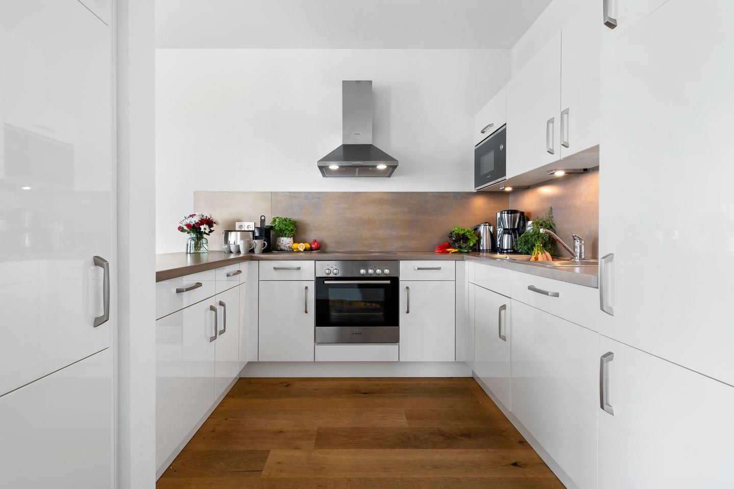 In den Wohnbereich ist eine voll ausgestattete Einbauküche integriert, die die Herzen aller Hobbyköche höherschlagen lässt. Kochen mit Blick ins Blaue - was will man Meer?
