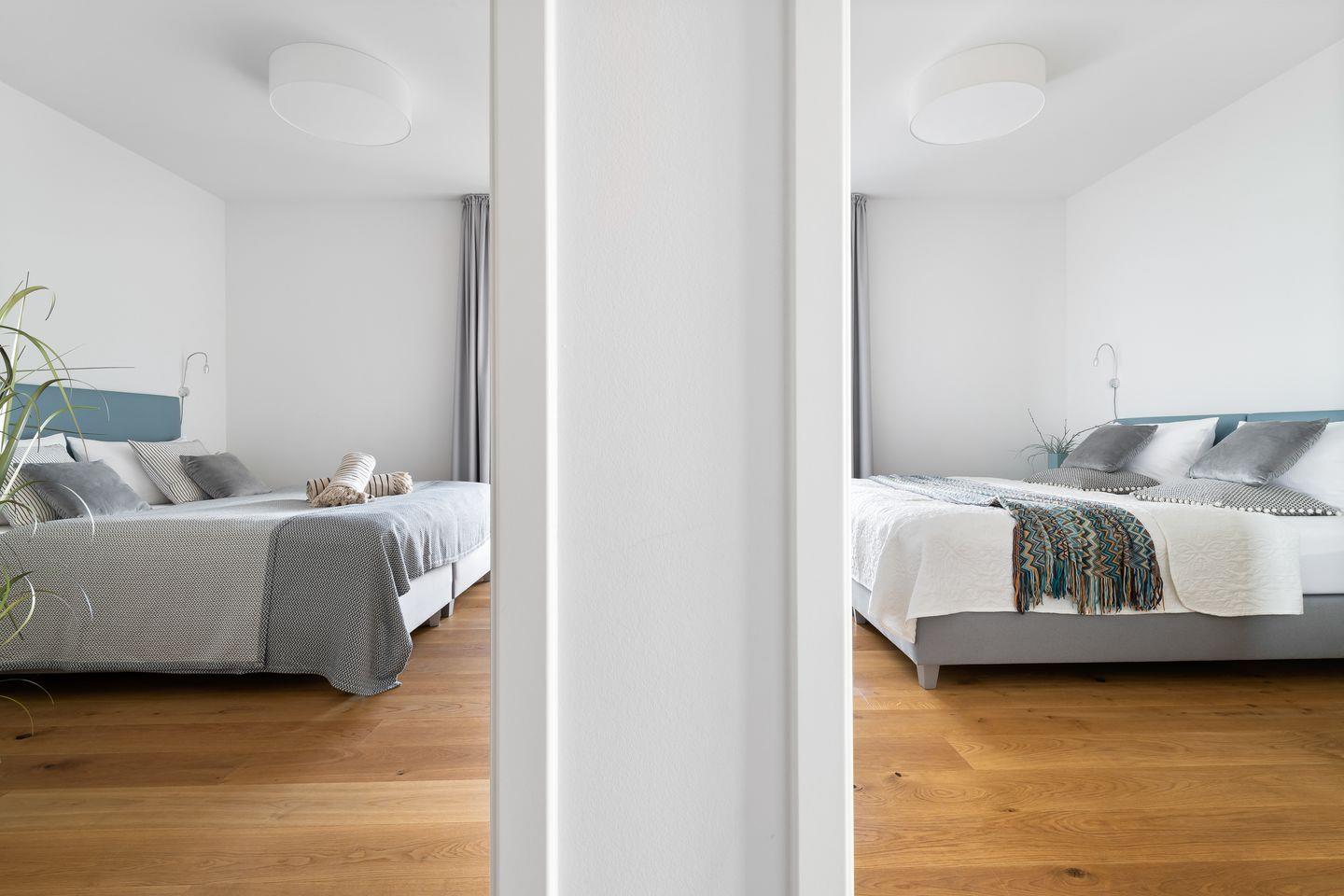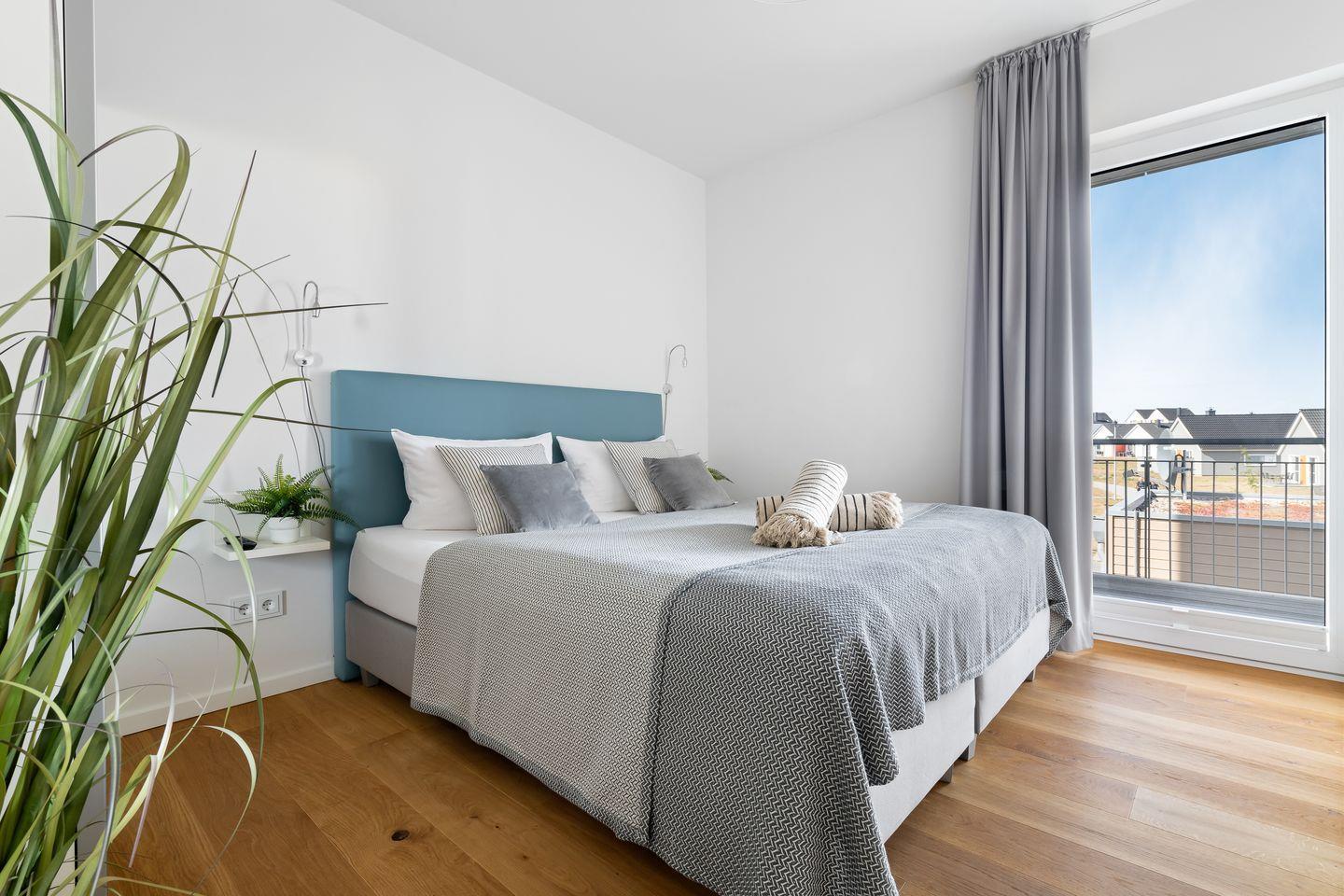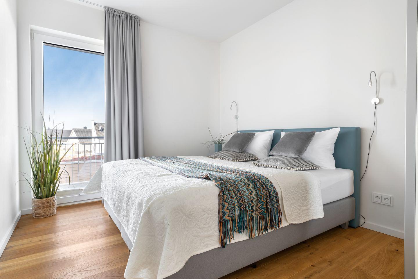 Beide Schlafzimmer verfügen über bodentiefe Fenster, die sich durch Gardinen abdunkeln lassen und bequeme Boxspringbetten sorgen für einen erholsamen Schlaf und geruhsame Nächte.