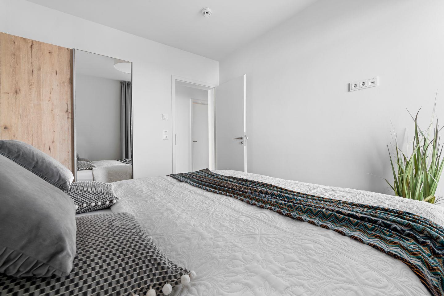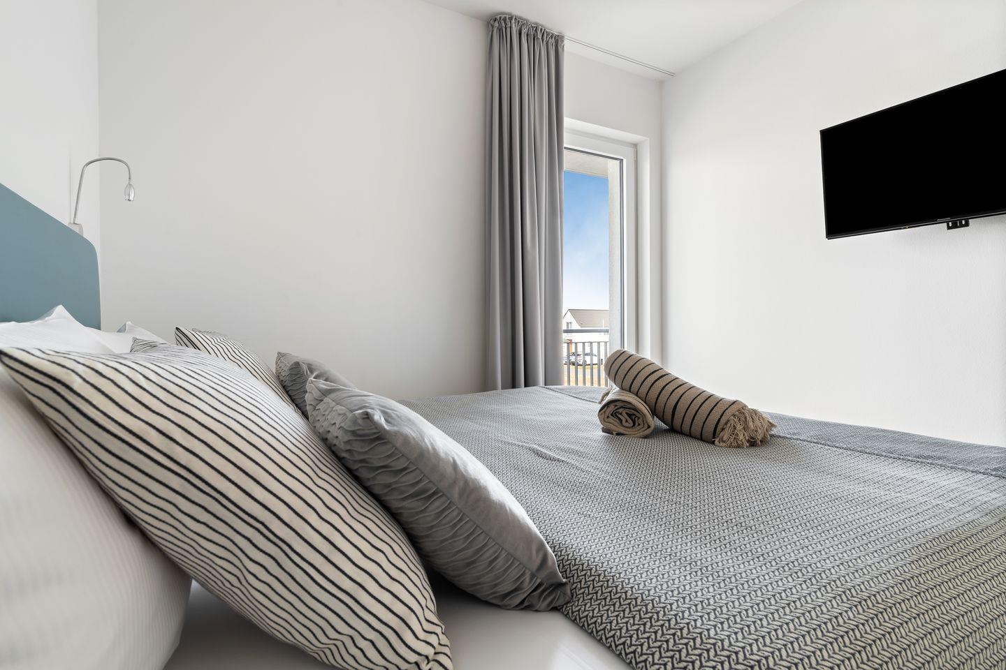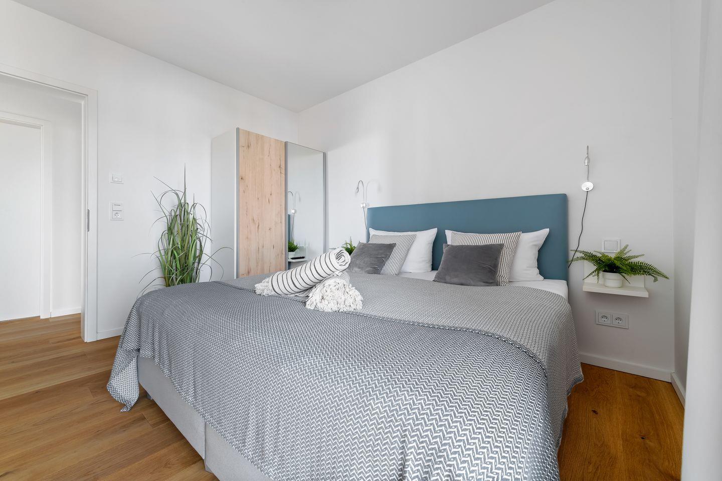Beide Schlafzimmer verfügen über bodentiefe Fenster, die sich durch Gardinen abdunkeln lassen und bequeme Boxspringbetten sorgen für einen erholsamen Schlaf und geruhsame Nächte.