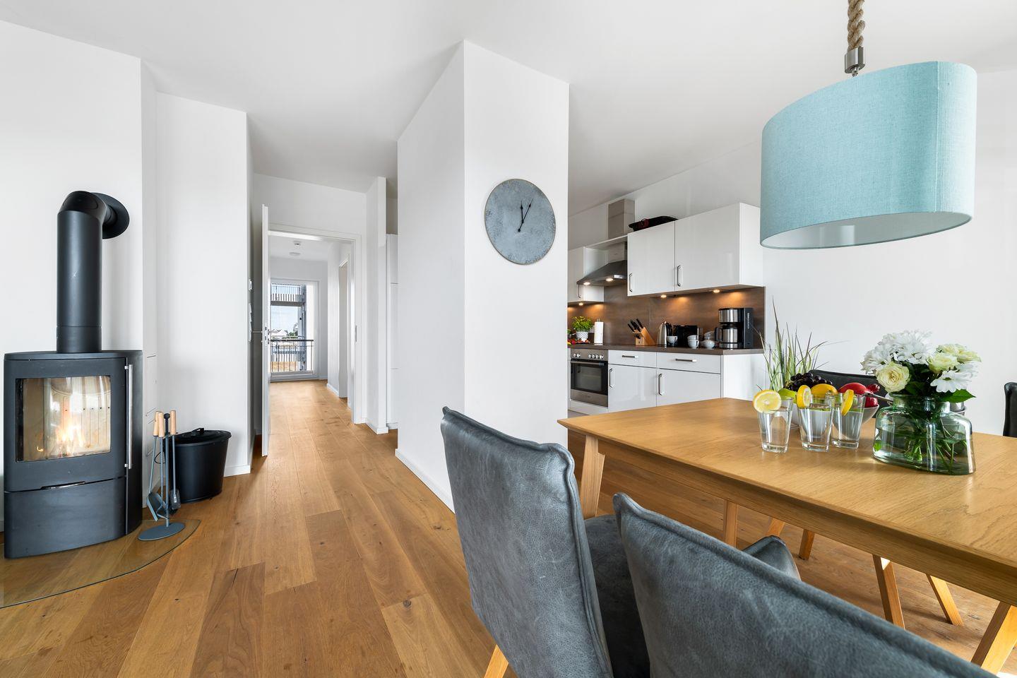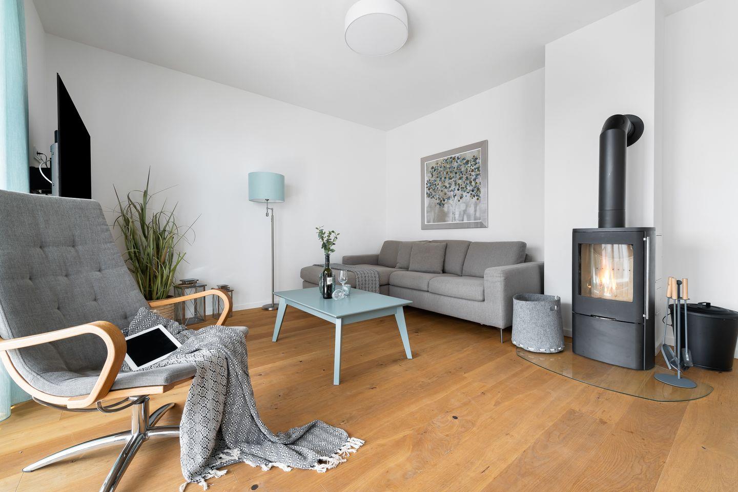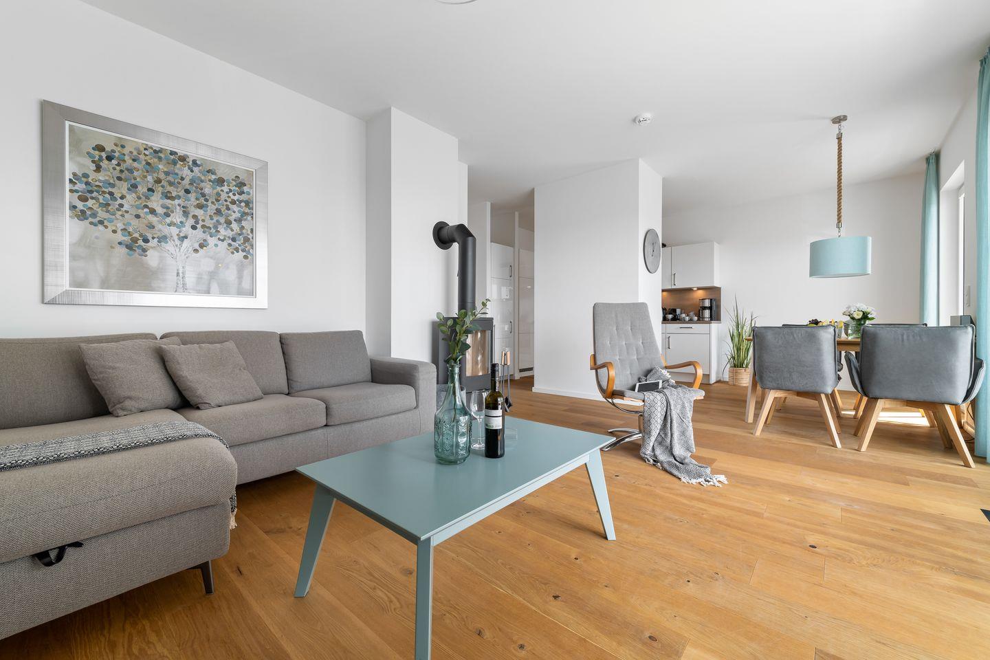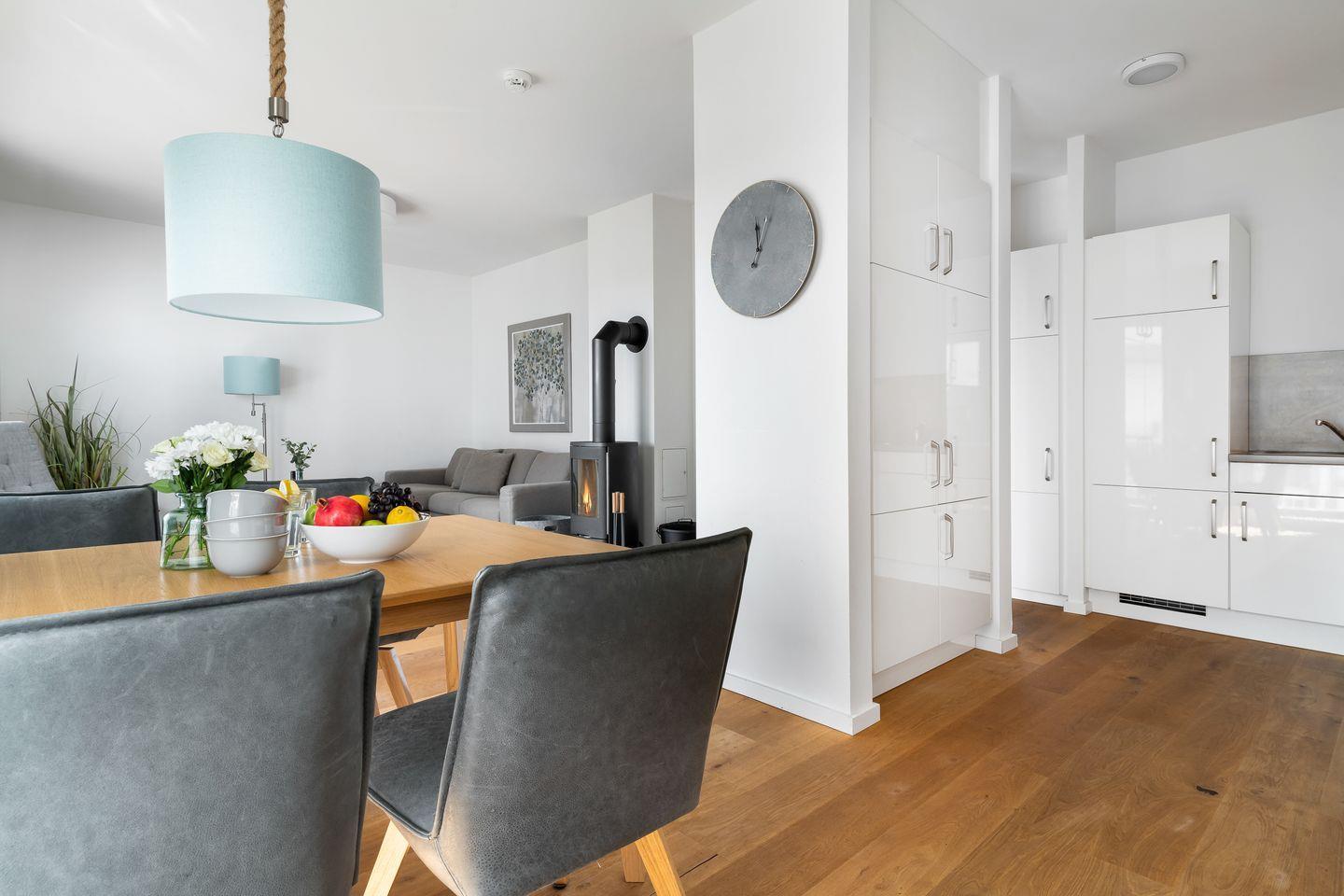 Das im skandinavisch-maritimen Stil gehaltene Interieur erhält durch seine Farbgestaltung eine zeitlos elegante Note, sodass man sich gleich wie zu Hause fühlen kann. Eine bequeme Sofalandschaft, Parkettfußböden, eine Fußbodenheizung in allen Bereichen sowie ein Kamin tragen hierzu mit bei.