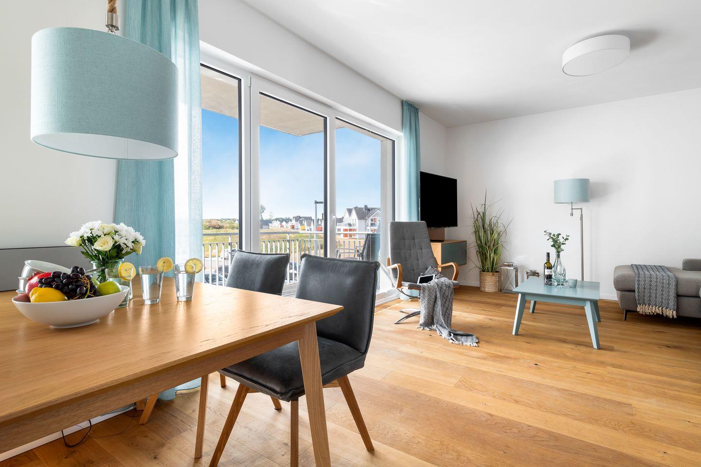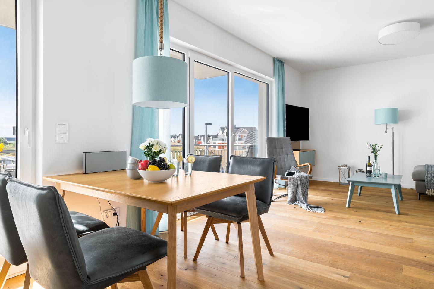 Über einen Flur gelangt man dann in den großzügig gestalteten Wohn- und Essbereich. Durch die bodentiefe Fensterfront wird das Apartment mit Licht durchflutet.