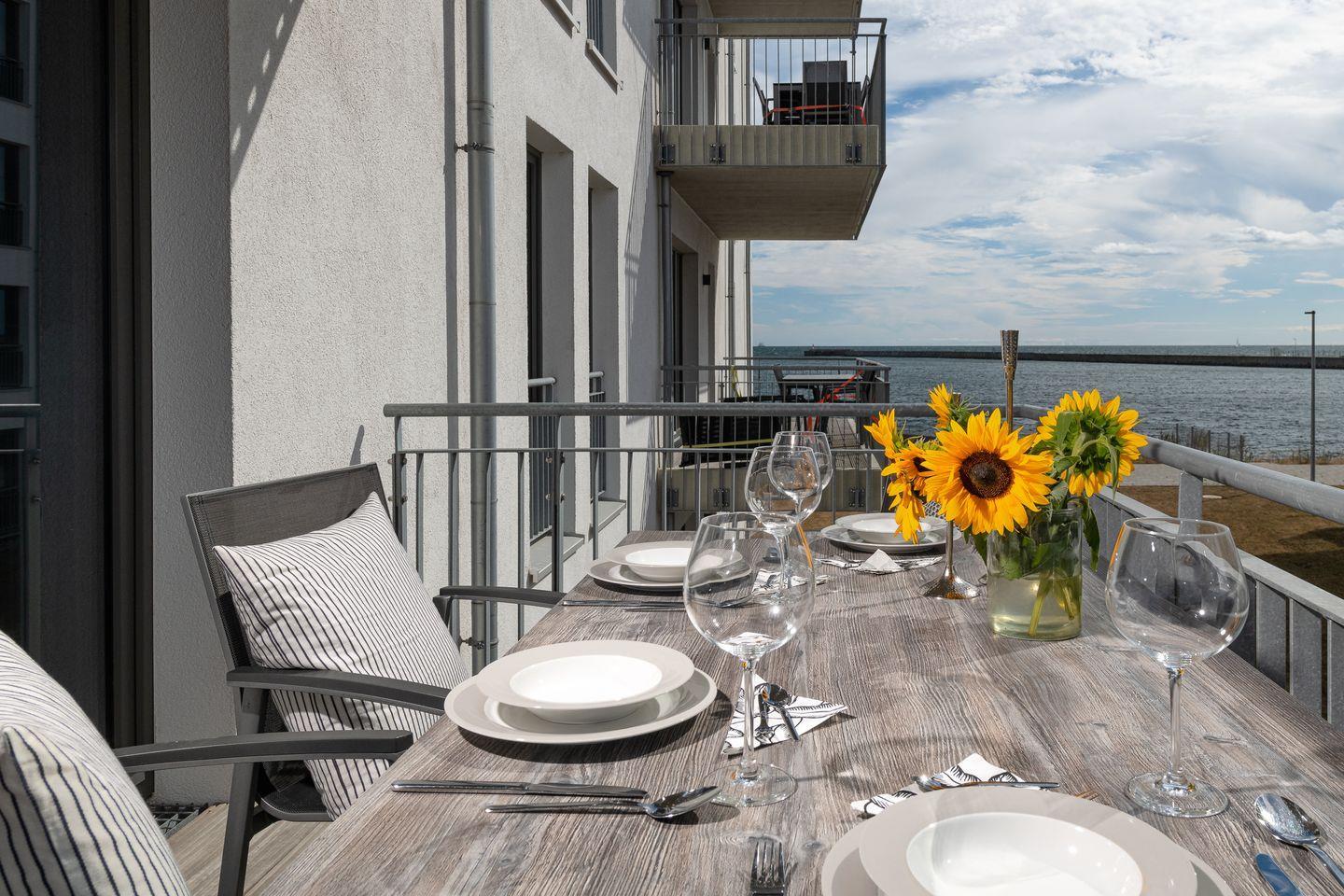 Das Apartment verfügt über zwei Balkone. Einer, der sich über die komplette Wohnzimmerbreite erstreckt und der andere ist von den Schlafzimmern aus beidseitig zugänglich. Von hier aus bietet sich eine seitliche Aussicht auf den Hafen, die vorbeiziehenden Segelschiffe und Ausflugsdampfer. Hochwertige Außenmöbel und Sonnenliegen laden zum längeren Verweilen ein. Mahlzeiten hier eingenommen sorgen für ein unvergleichliches Urlaubsfeeling.