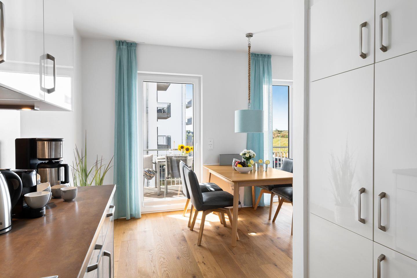 Die Einbauküche ist voll ausgestattet und lässt nicht nur die Herzen von Hobbyköchen höherschlagen. Durch die offene Gestaltung des Wohn-/Essbereichs ist ein gemütliches Beisammensein jederzeit möglich - sei es beim Zubereiten von lukullischen Köstlichkeiten, Klönschnack oder beim Spielen.