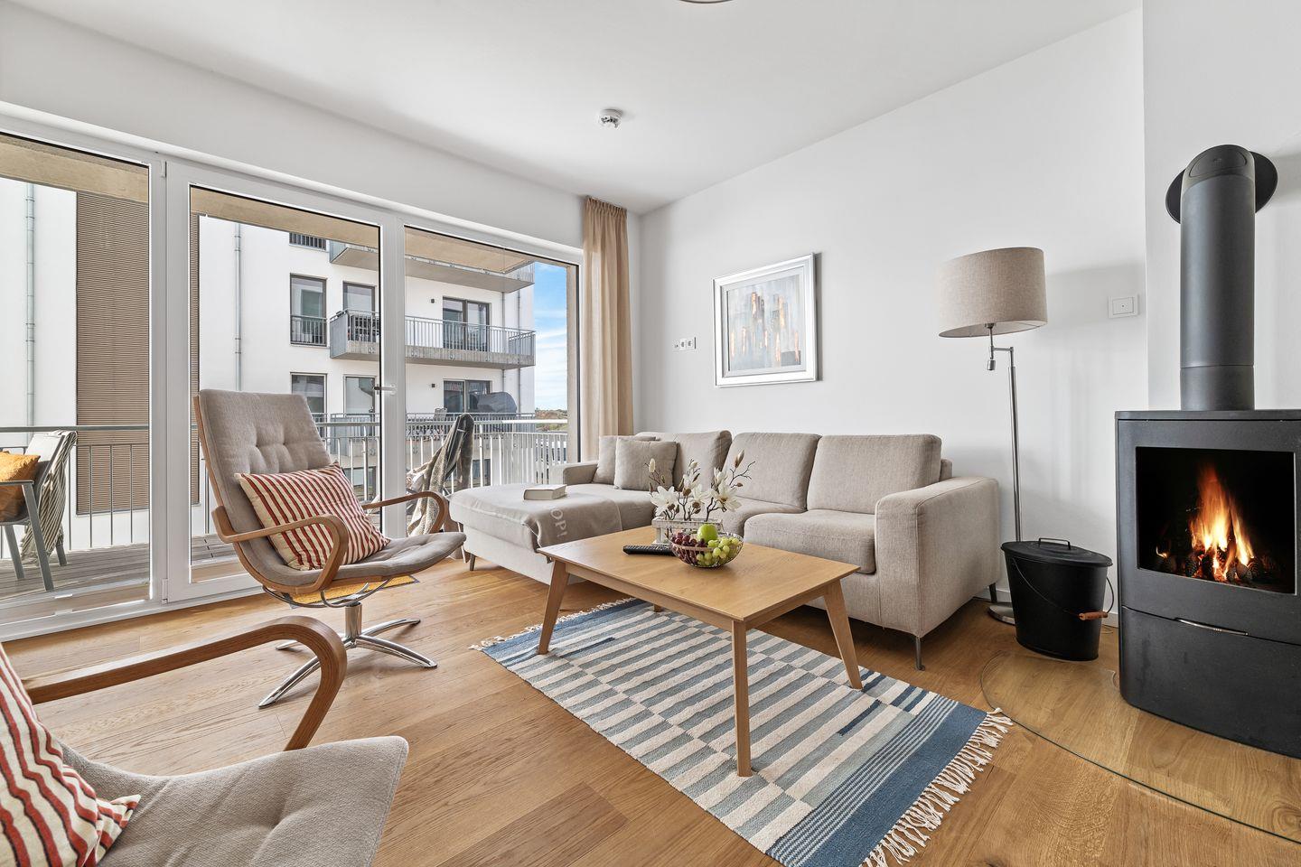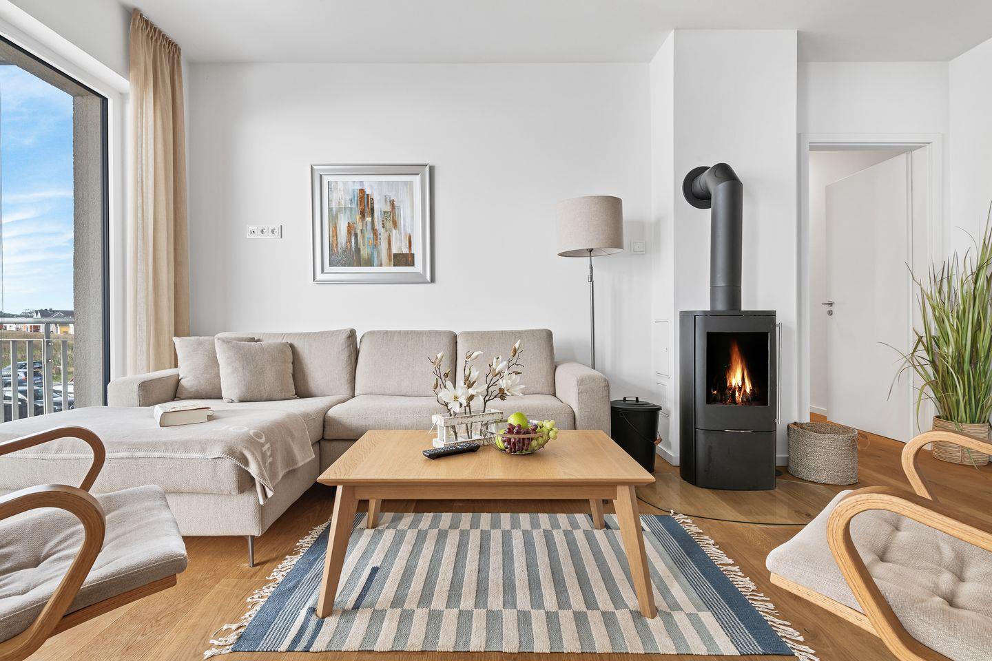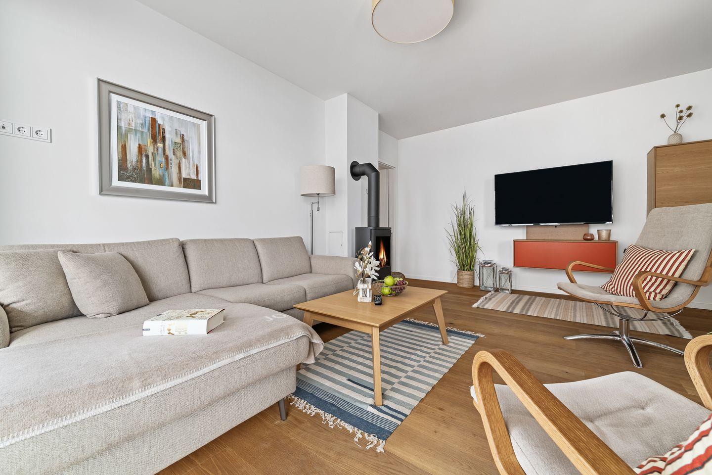 Der Wohnbereich ist mit hellen Möbeln und hochwertigem Parkettboden ausgestattet, sodass das Apartment ein nordisch, elegantes Flair versprüht. Bequeme Sitzmöbel und ein Kaminofen laden – auch an „Schietwetter"- Tagen - zum Entspannen ein. Mit einem Glas Rotwein in der Hand und knisterndem Kaminfeuer im Hintergrund ist die Urlaubsstimmung perfekt.