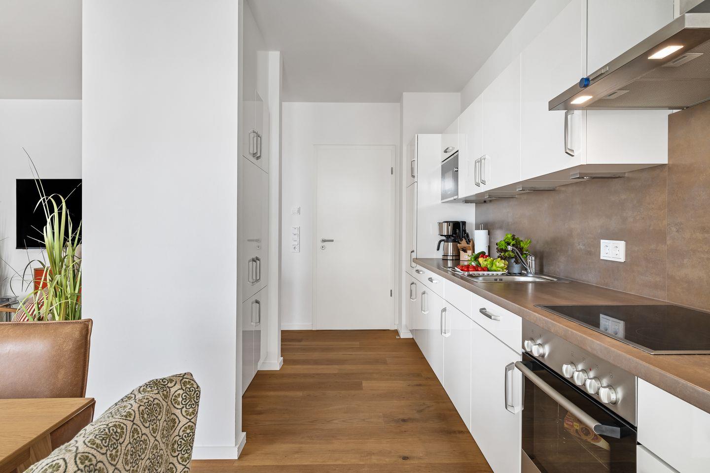 Vor dem Apartmenthaus sind ausreichend Parkplätze vorhanden. Die im ersten Obergeschoss gelegene Wohnung ist bequem mit dem Fahrstuhl erreichbar.