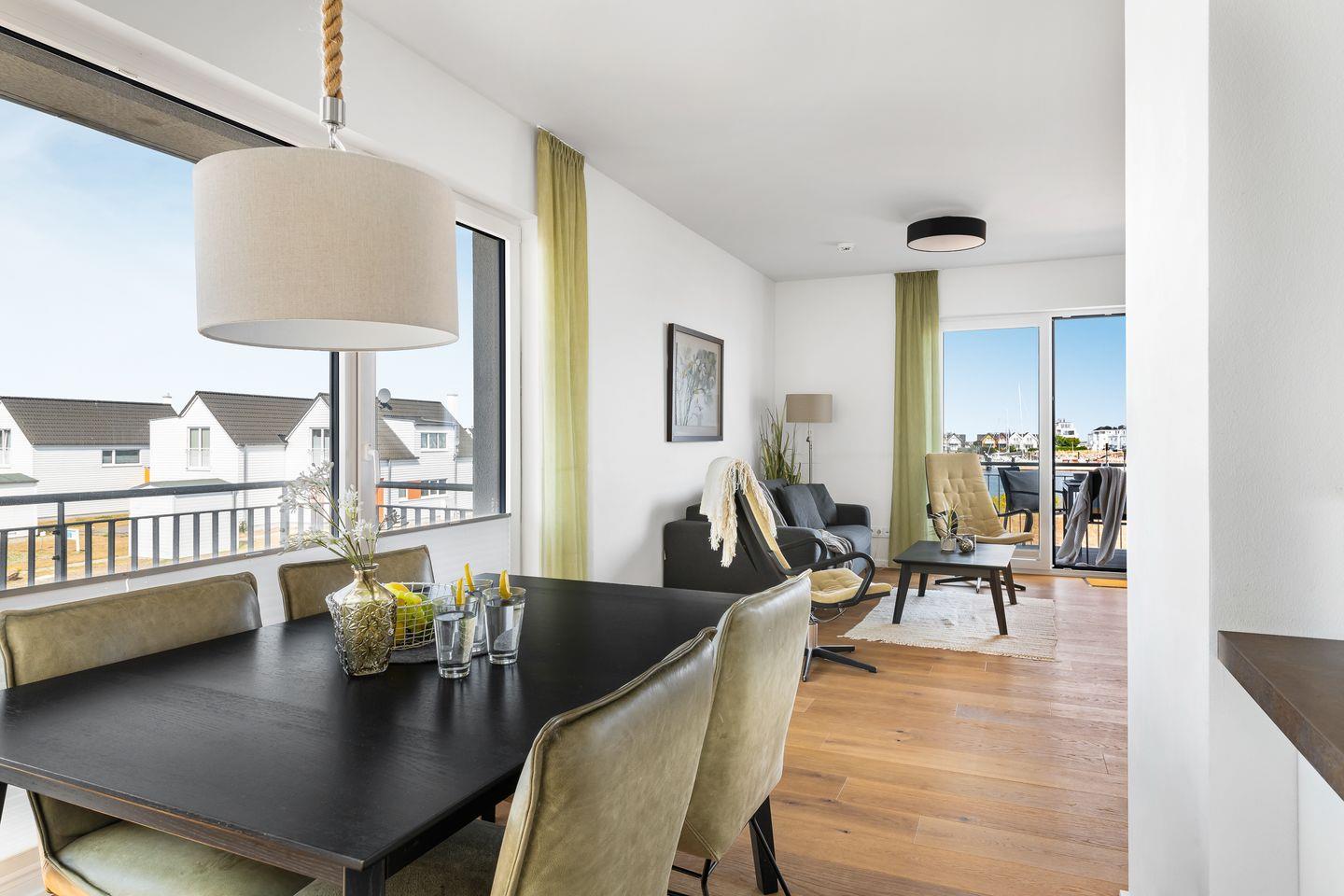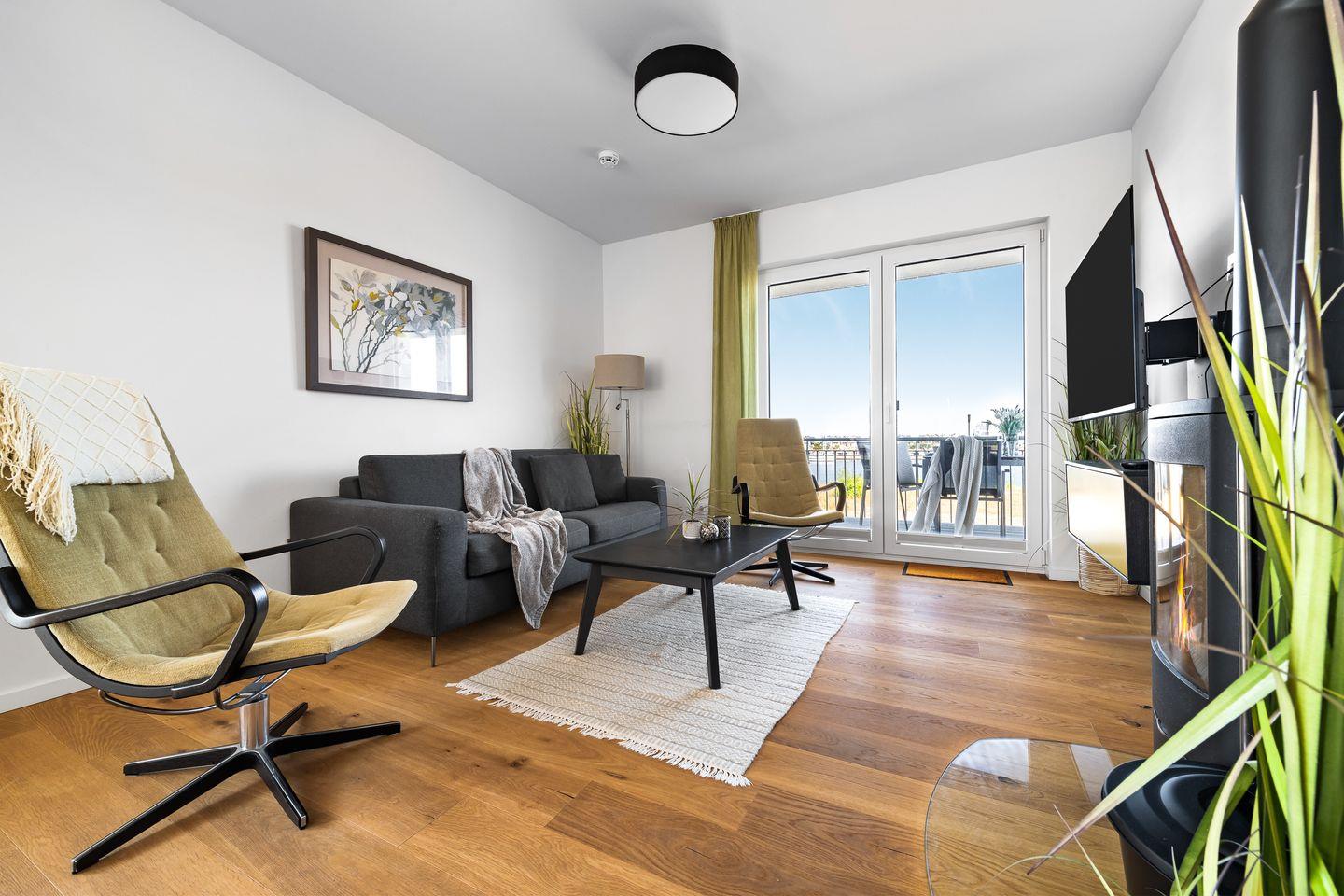 Das elegant-maritim eingerichtete Apartment besticht besonders durch den traumhaft freien Blick auf die Ostsee. Durch die verglaste Front des Koch- und Wohnbereichs fällt der Blick immer ins Blaue, während man es sich auf den bequemen Sitzmöbeln gemütlich macht. Ein Kamin trägt, besonders in der kalten Jahreszeit, zur wohligen Stimmung bei. Mit einem Glas Wein in der Hand vor knisterndem Kaminfeuer, während draußen die Ostsee tobt - was gibt es Schöneres?