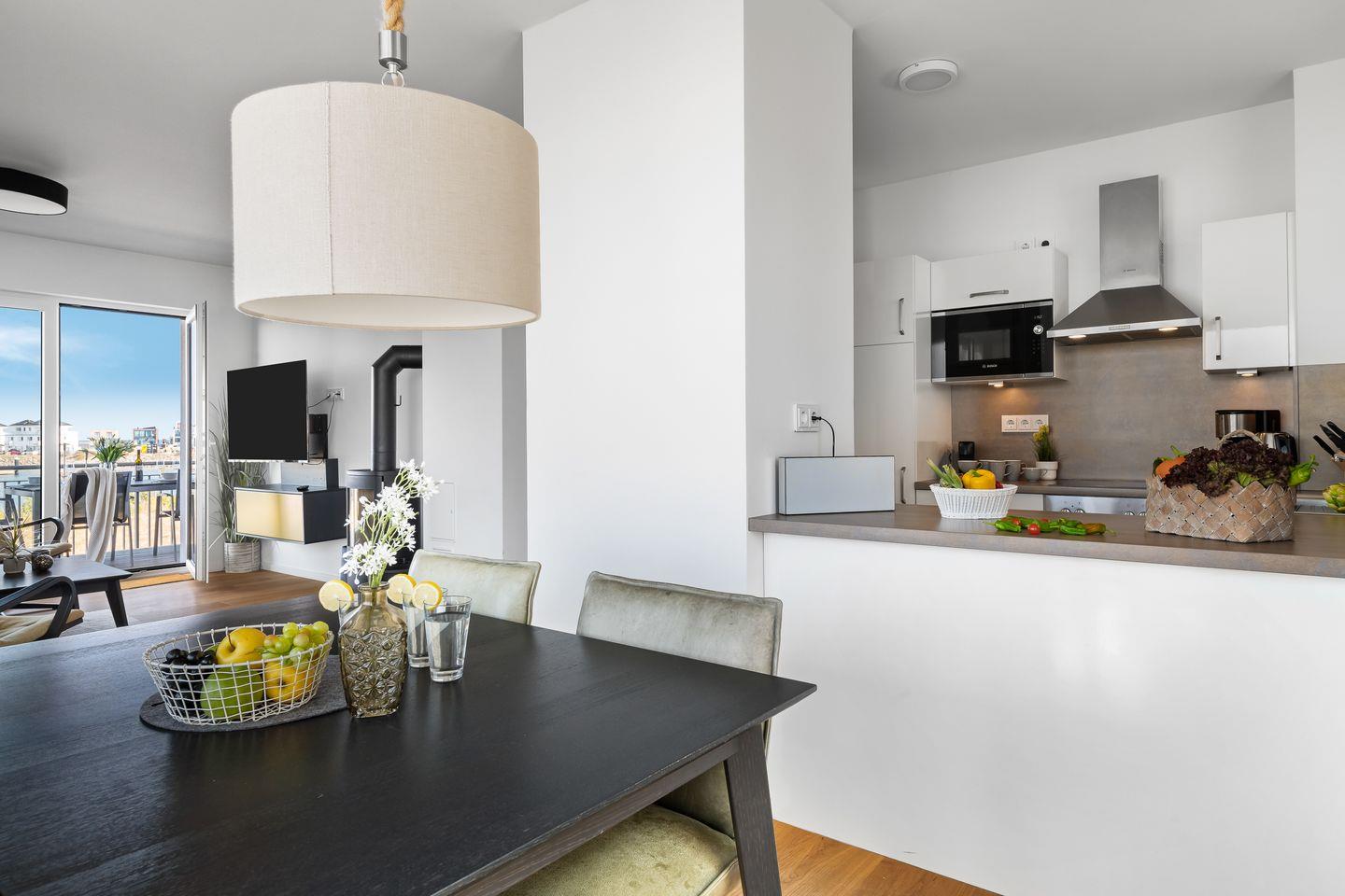 Die offene, moderne Einbauküche bietet alles, was das Hobbykoch-Herz begehrt! Die frisch zubereiteten Köstlichkeiten können im Anschluss am direkt angrenzenden Esstisch oder auf dem großzügigen Balkon verspeist werden. Außerdem bietet der Balkon den perfekten Ort für ein herrliches Sonnenbad. Hier ist Urlaubsstimmung vorprogrammiert!