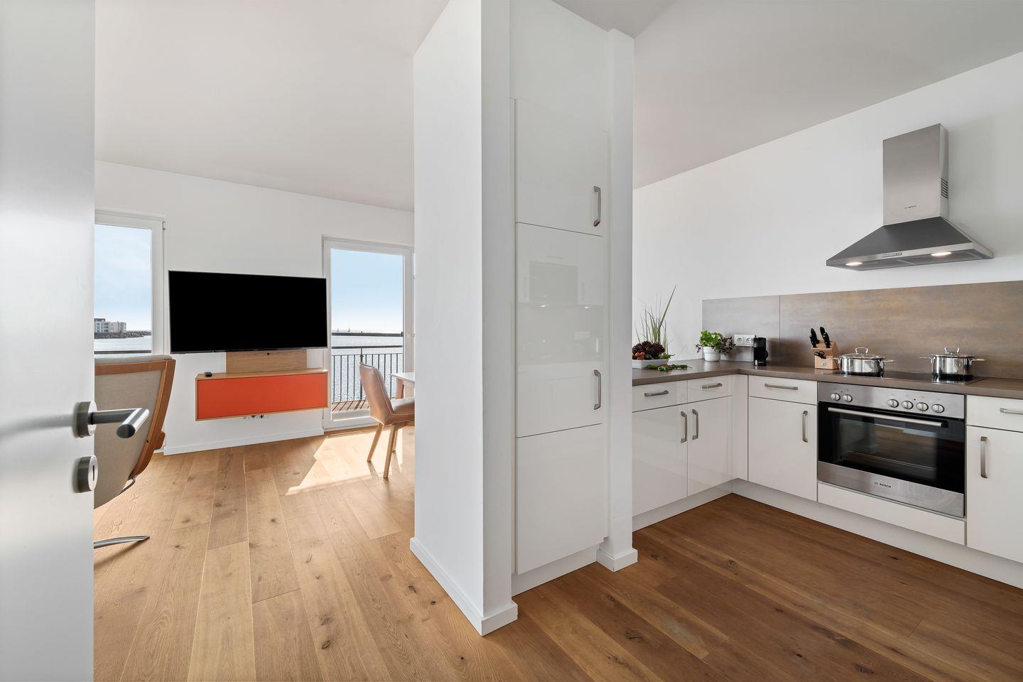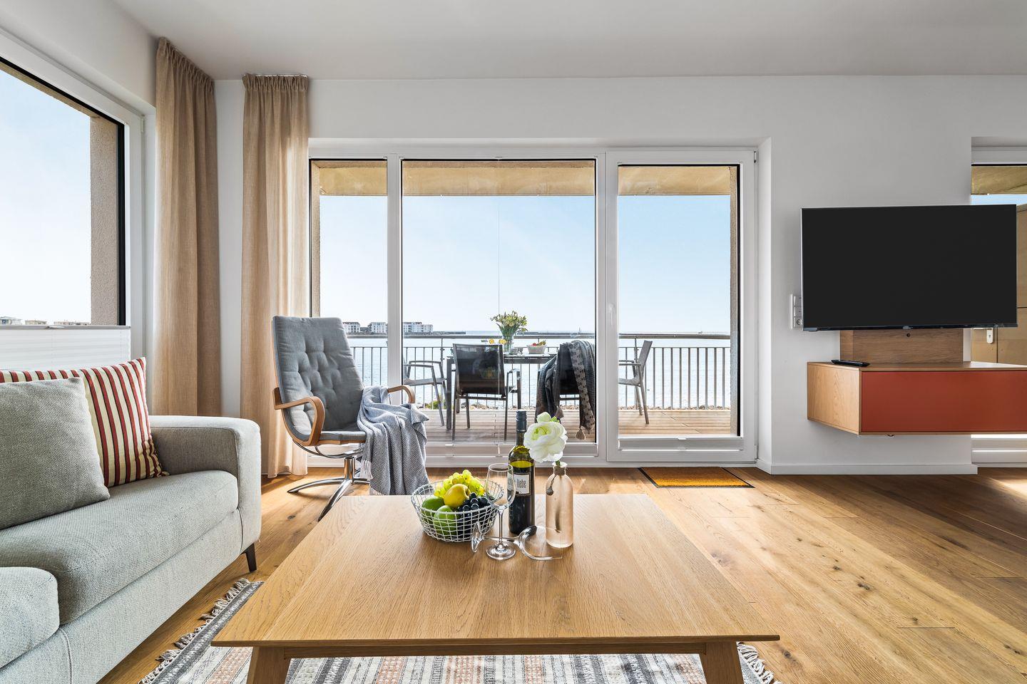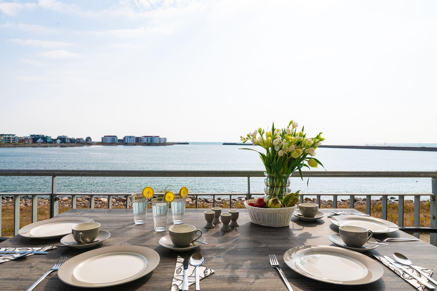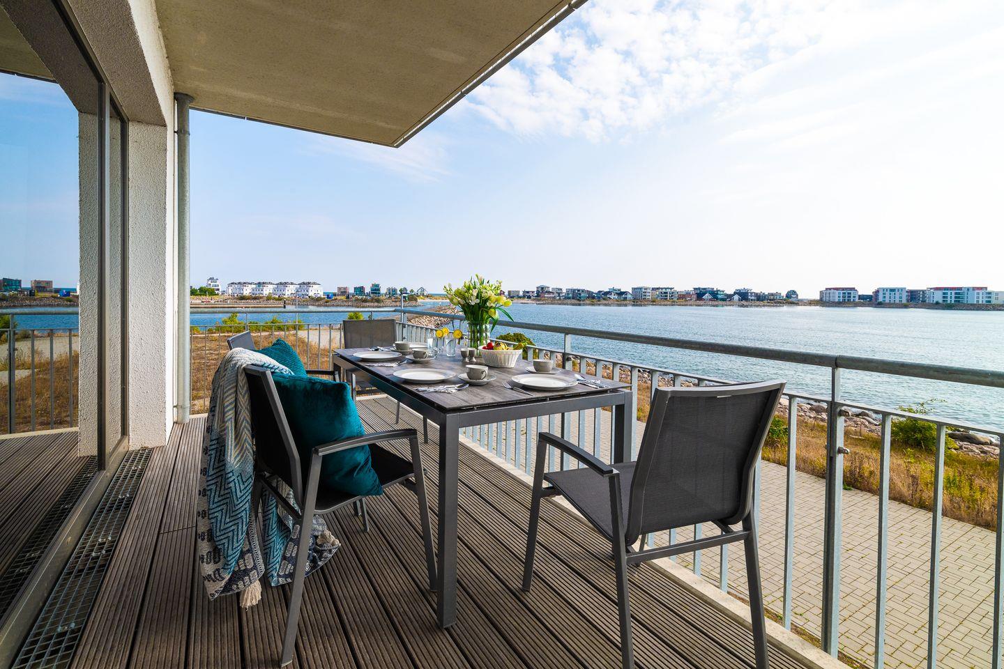 Der traumhafte Balkon bietet einen weiten Blick auf das Hafenkino und die vorbeiziehenden Segelschiffe. Eine hochwertige Sitzgarnitur sowie Sonnenliegen stehen bereit um erholsame Sonnenstunden zu genießen. Ob beim morgendliche Kaffee oder einer gemütlichen Grillerei, hier wird das Urlaubsfeeling perfekt.