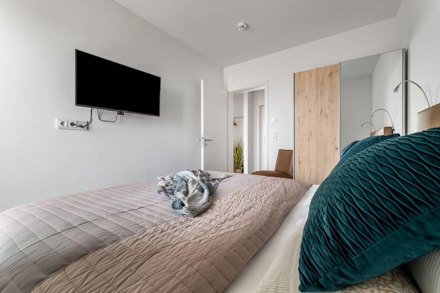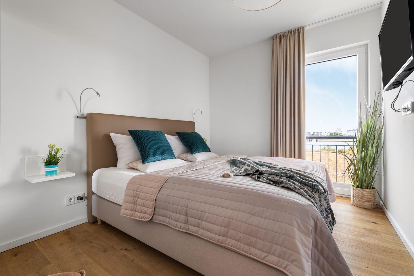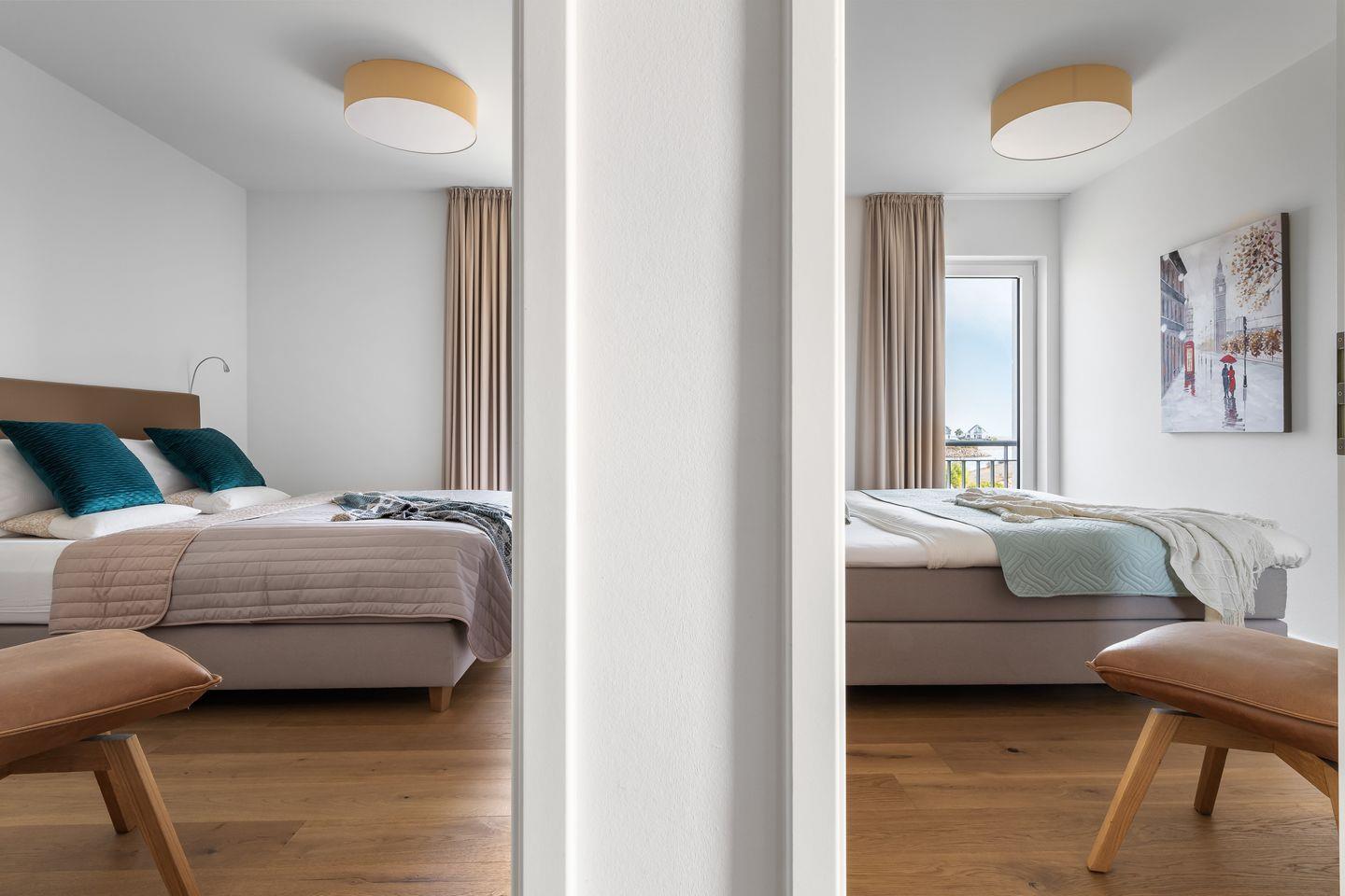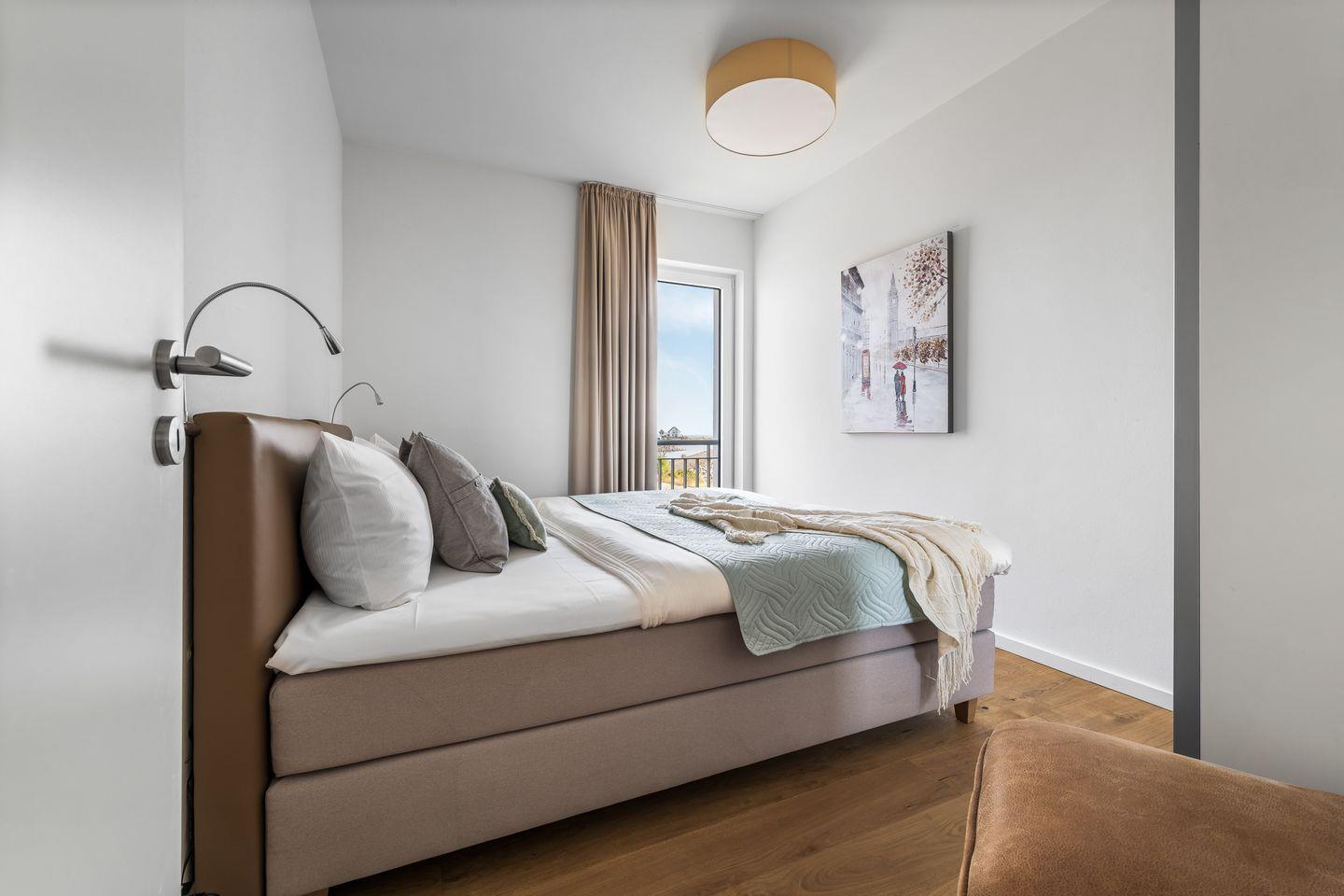 Zwei Schlafzimmer mit bodentiefen Fenstern, die sich durch Gardinen abdunkeln lassen, und bequemen Boxspringbetten garantieren geruhsame Nächte. Von hier aus haben unsere Gäste ebenfalls einen schönen Blick auf das Hafenkino.