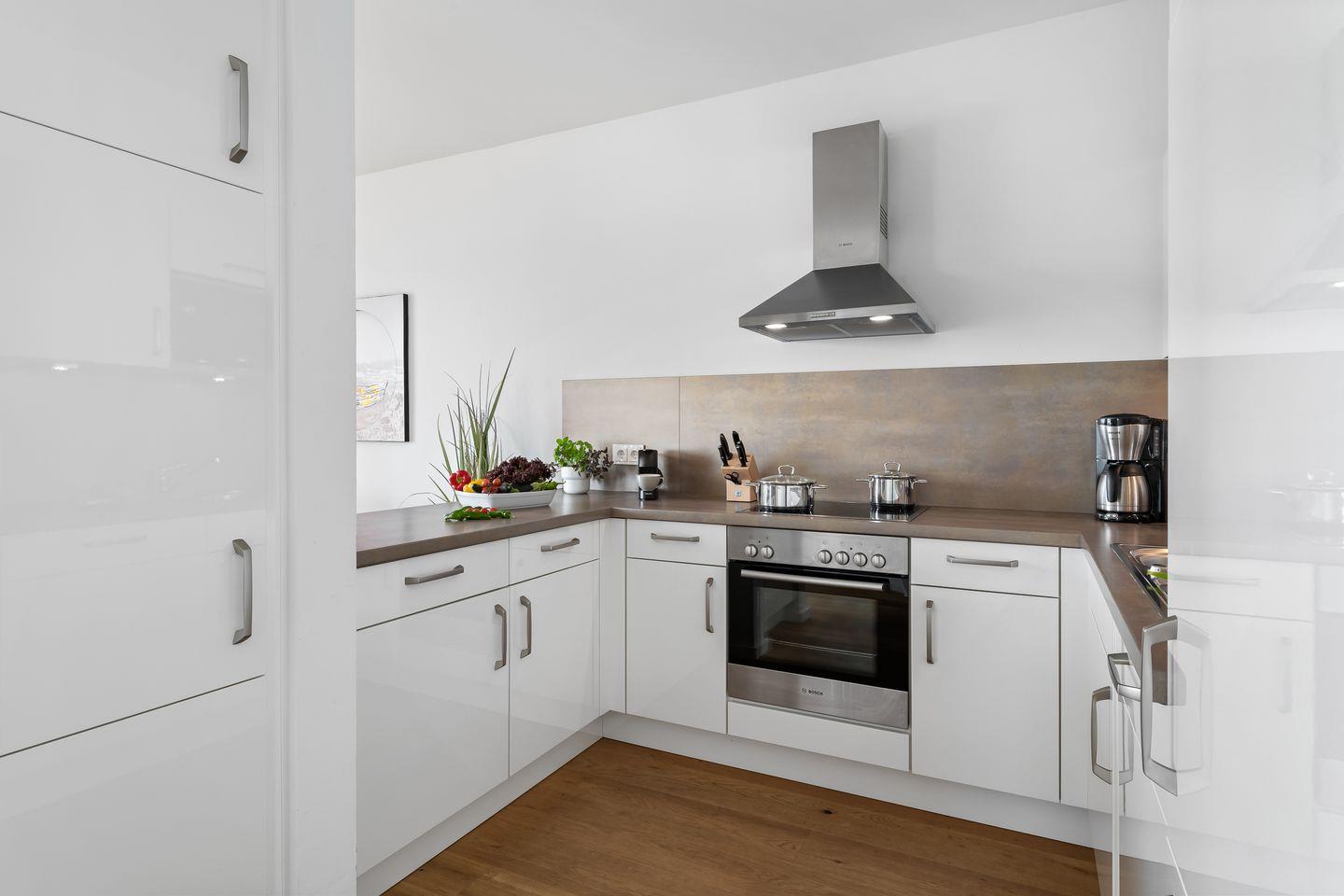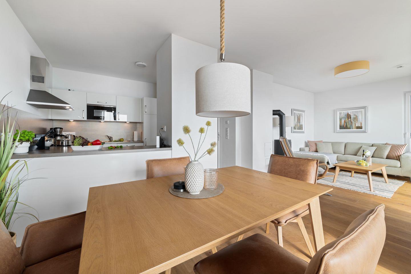 Auch die hochwertige und voll ausgestattete Einbauküche lässt keine Wünsche offen, „Kochen mit Blick ins Blaue" ist hier das Motto! Durch den direkt anschließenden Essbereich lassen sich gemütliches Beisammensein und das Zubereiten von Köstlichkeiten perfekt vereinbaren.