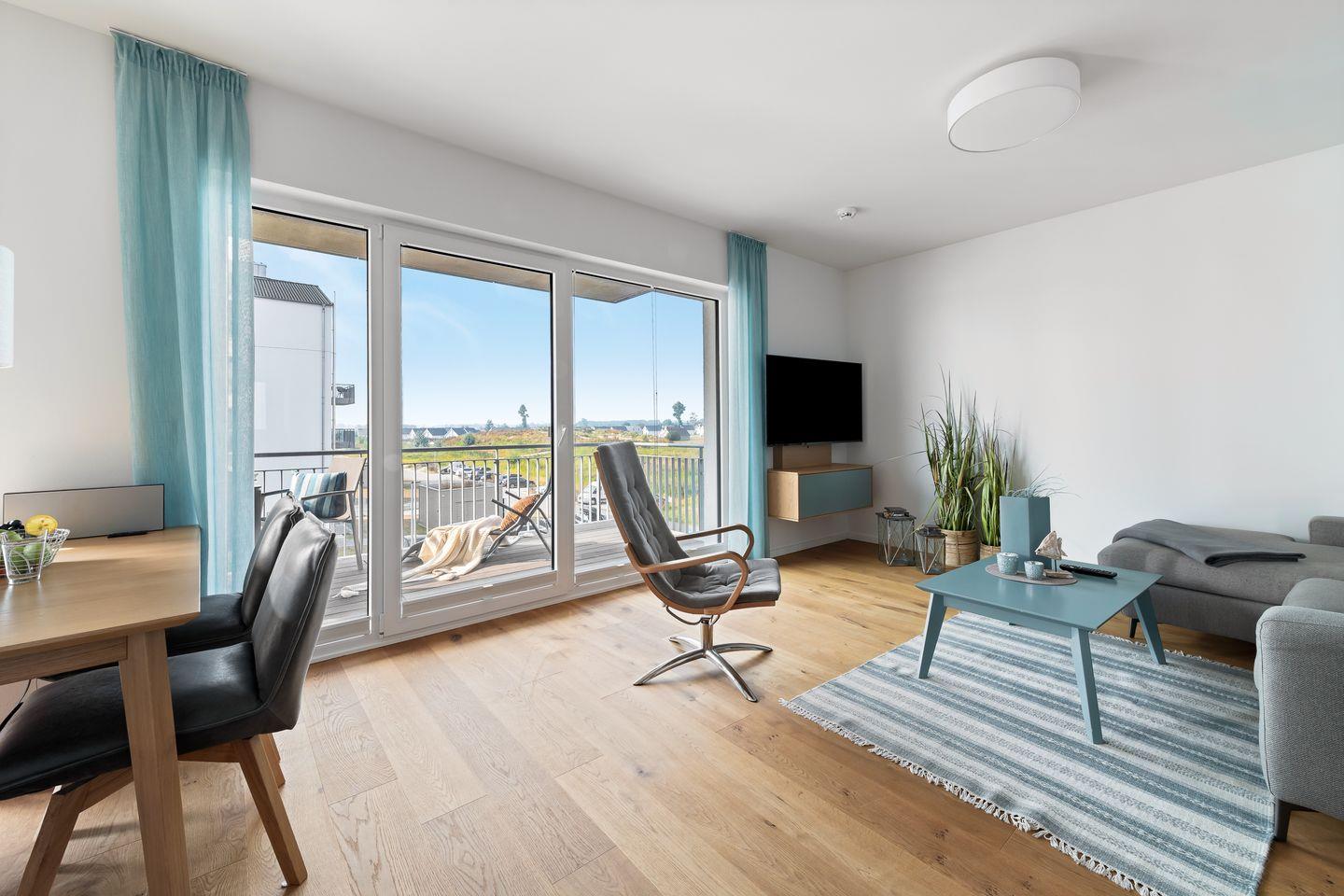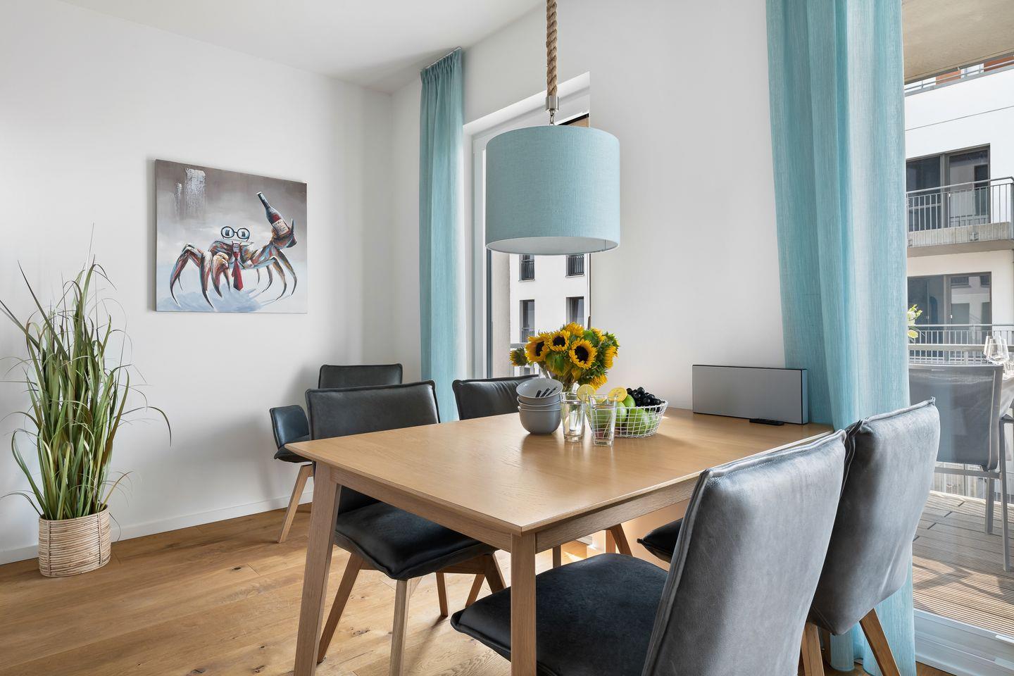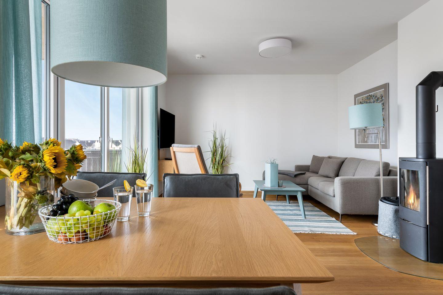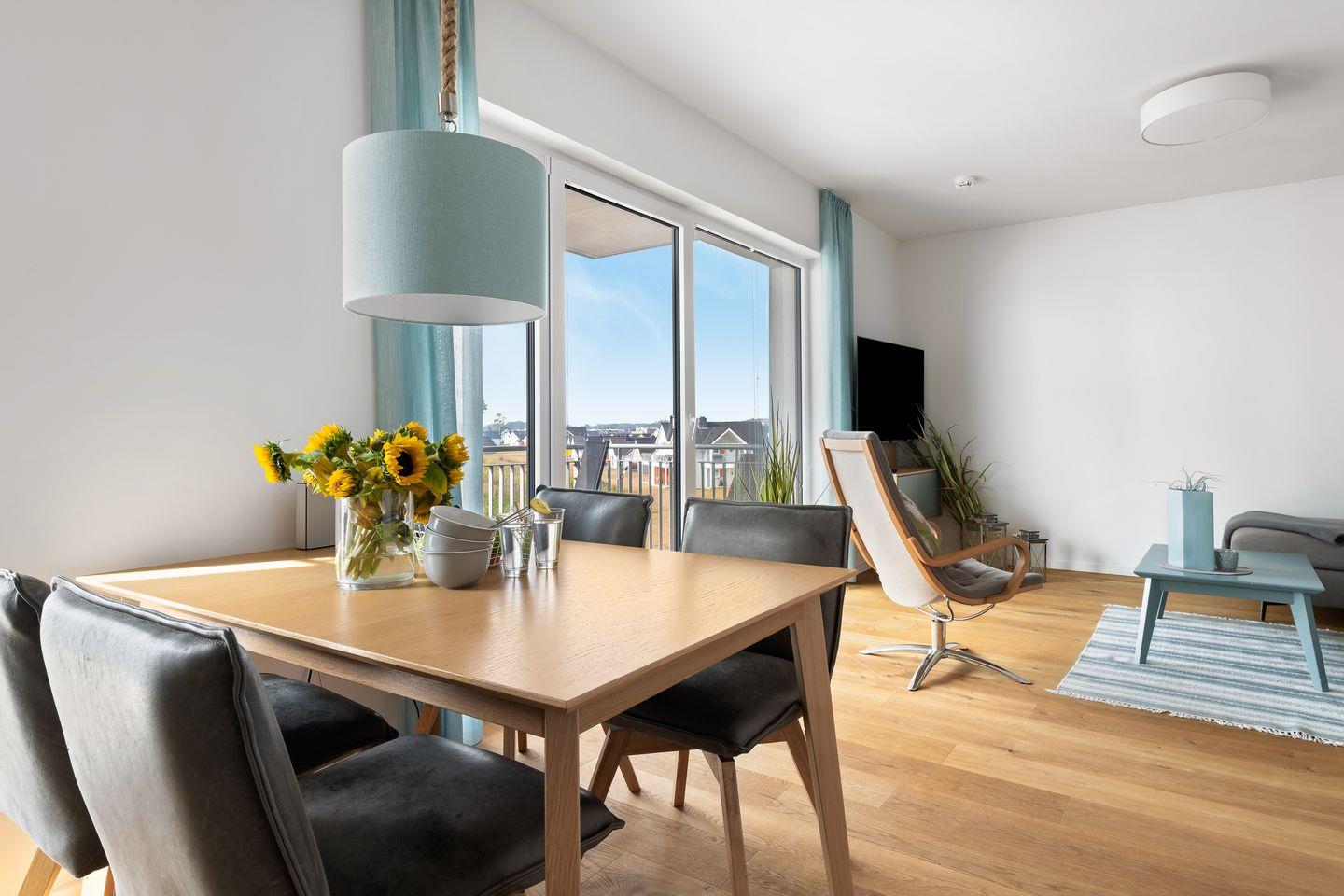 Über einen Flur gelangt man dann in den großzügig gestalteten Wohn- und Essbereich. Durch die bodentiefe Fensterfront wird das Apartment "Ocean Storm" mit Licht durchflutet.