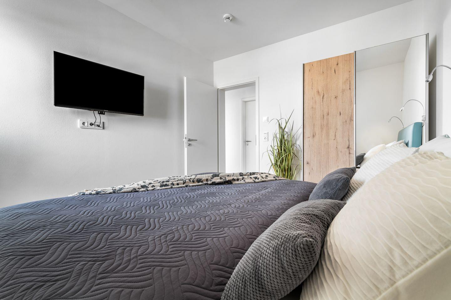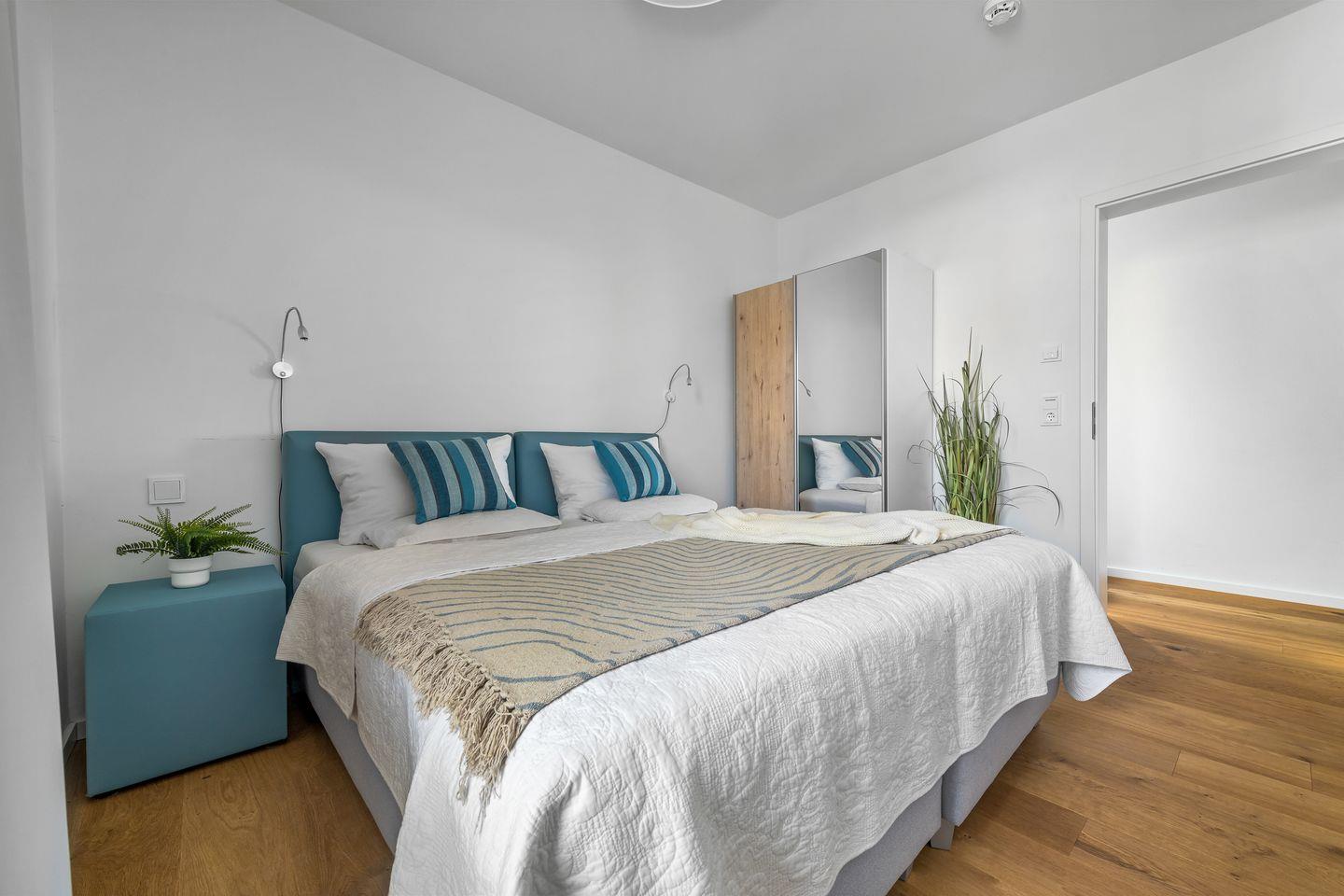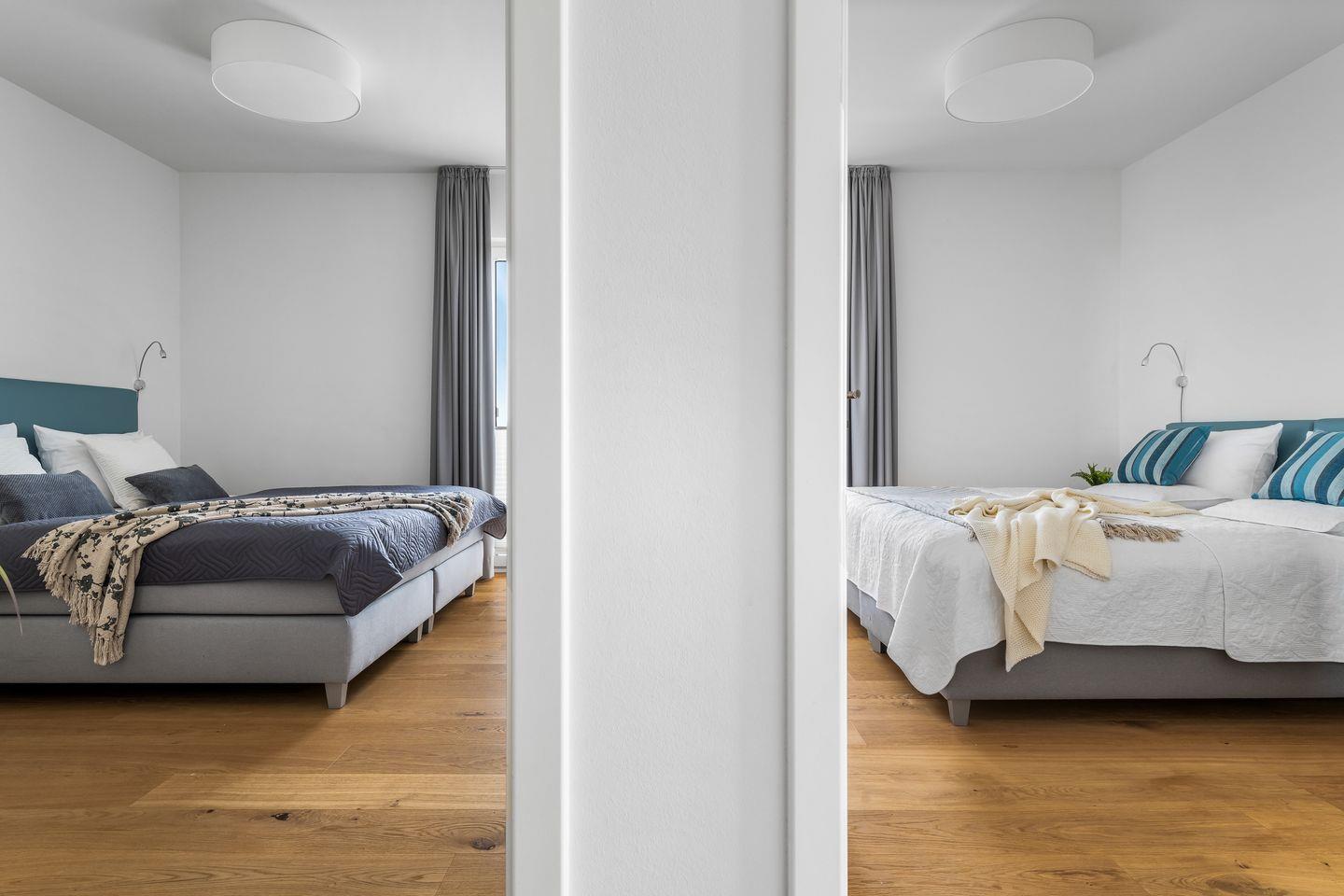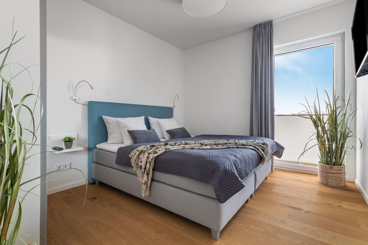Beide Schlafzimmer verfügen über bodentiefe Fenster, die sich durch Gardinen abdunkeln lassen und bequeme Boxspringbetten sorgen für einen erholsamen Schlaf und geruhsame Nächte.