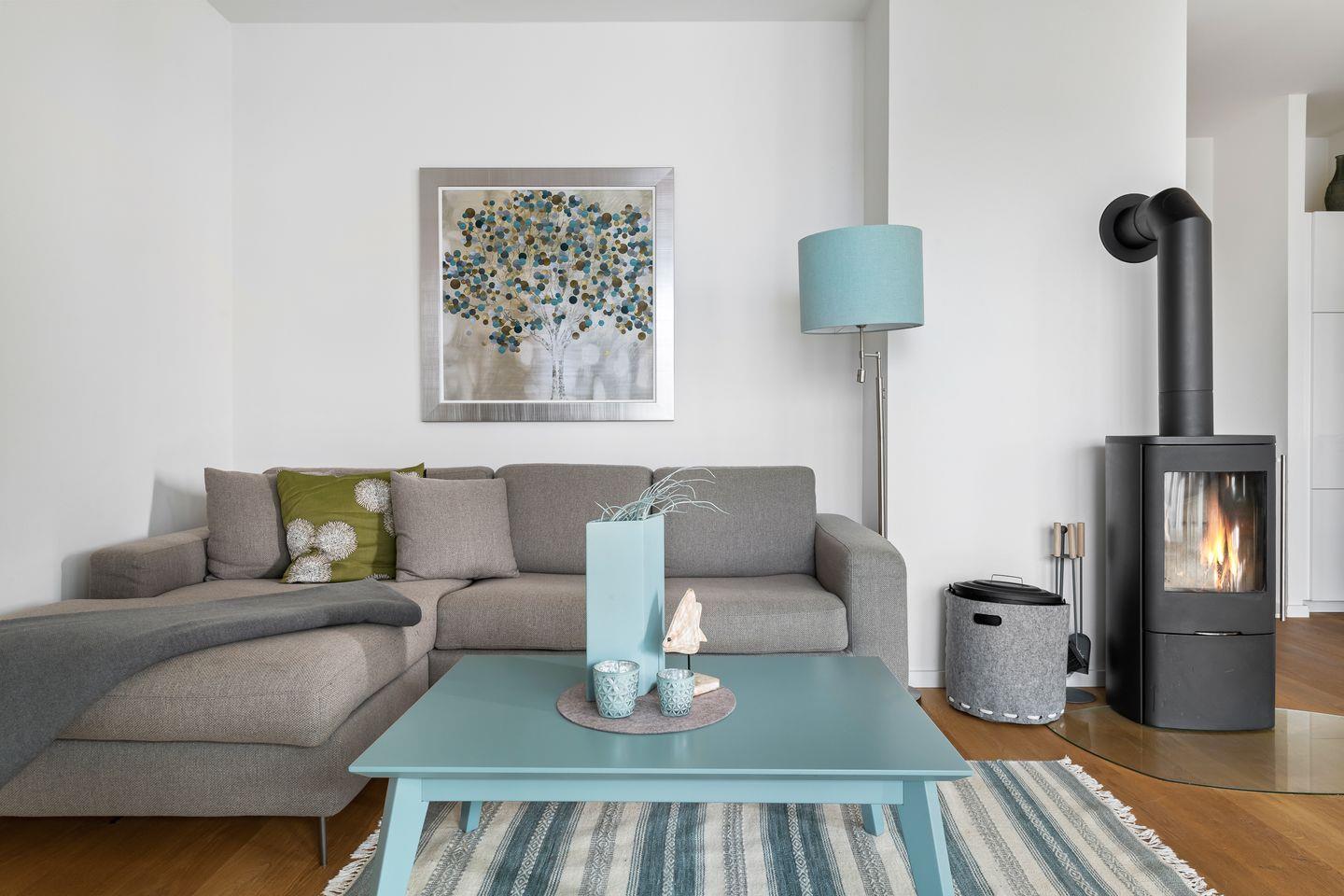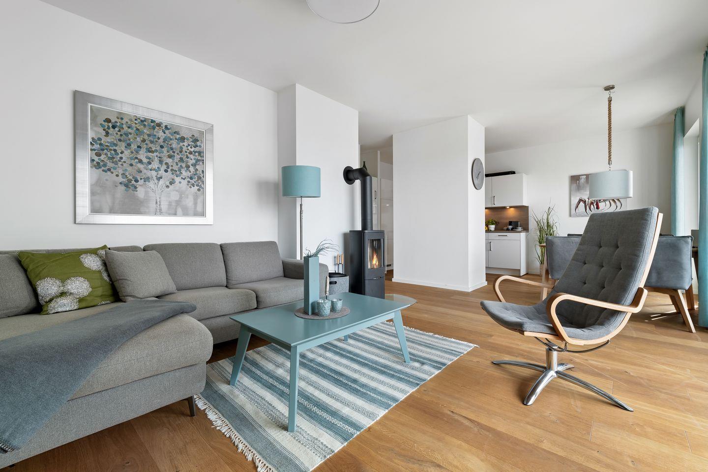 Das im skandinavisch-maritimen Stil gehaltene Interieur erhält durch seine Farbgestaltung eine zeitlos elegante Note, sodass man sich gleich wie zu Hause fühlen kann. Eine bequeme Sofalandschaft, Parkettfußböden, eine Fußbodenheizung in allen Bereichen sowie ein Kamin tragen hierzu mit bei. Mit einem guten Glas Wein und einem knisternden Kaminfeuer lassen sich auch Schlechtwettertage durchaus angenehm verbringen.