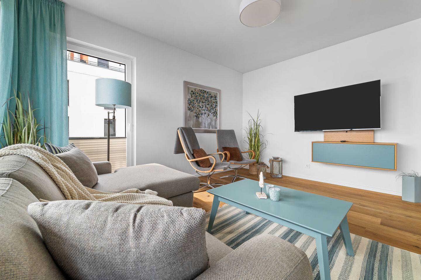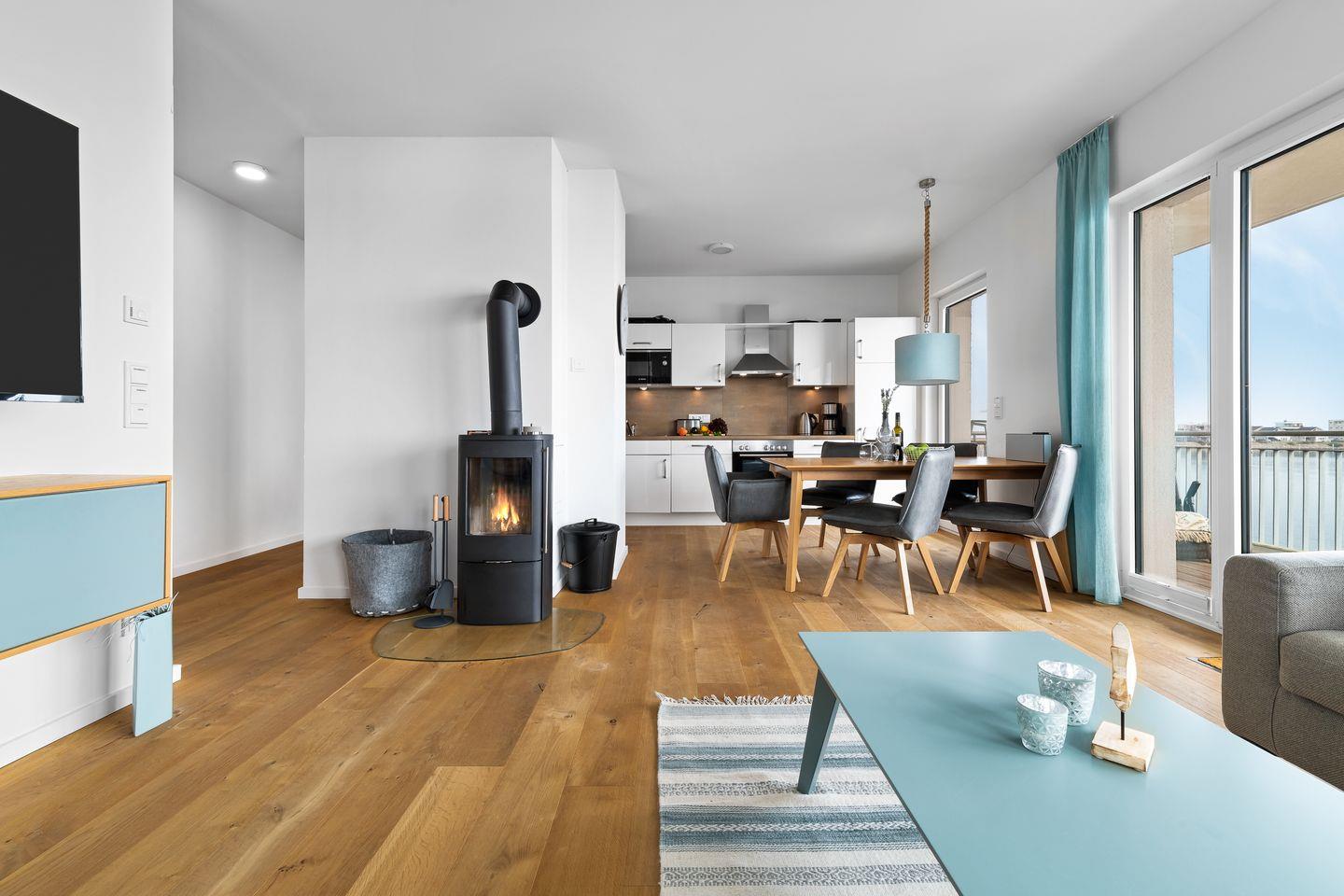 Das elegant maritim eingerichtete Apartment "Ocean Lodge2" besticht besonders durch den traumhaft freien Blick auf die Ostsee. Durch die verglaste Front des Koch- und Wohnbereichs fällt der Blick immer ins Blaue, während man es sich auf den bequemen Sitzmöbeln gemütlich macht. Ein Kamin trägt, besonders in der kalten Jahreszeit, zur wohligen Stimmung bei. Mit einem Glas Wein in der Hand vor knisterndem Kaminfeuer, während draußen die Ostsee tobt - was gibt es Schöneres?