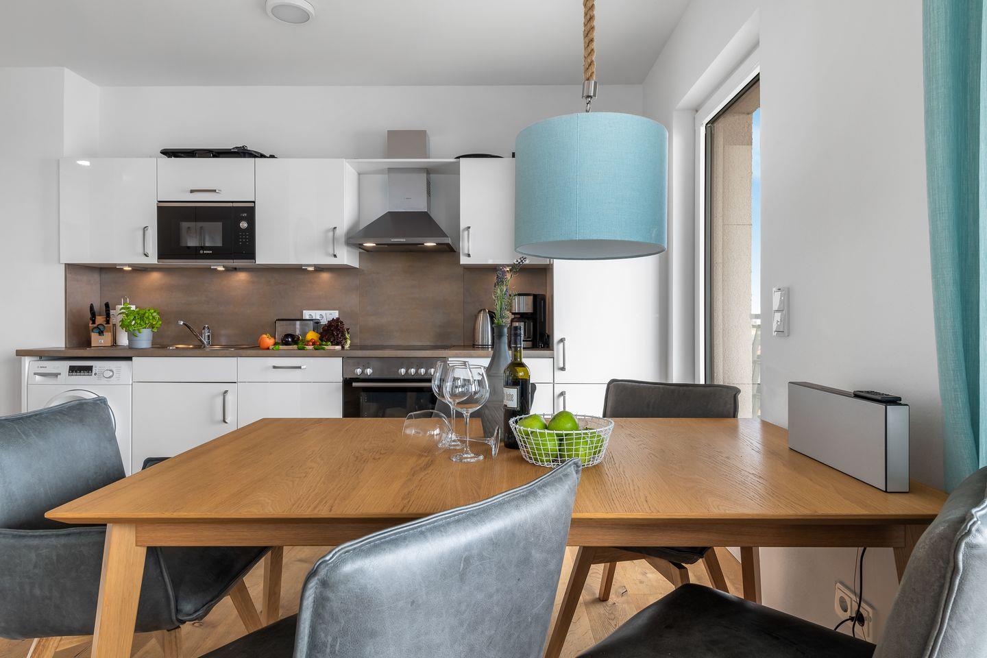 Die offene, moderne Einbauküche bietet alles, was das Hobbykoch-Herz begehrt! Die frisch zubereiteten Köstlichkeiten können im Anschluss mit herrlichem Meerblick am direkt angrenzenden Esstisch oder auf dem großzügigen Balkon verspeist werden. Außerdem bietet der Balkon den perfekten Ort für ein herrliches Sonnenbad. Hier ist Urlaubsstimmung vorprogrammiert!