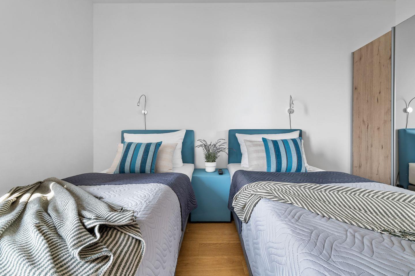 Die drei Schlafzimmer bieten Platz für sechs Personen und verfügen alle über hochwertige Boxspringbetten und bodentiefe Fenster, die sich mit Gardinen abdunkeln lassen. Eins der drei Schlafzimmer hält außerdem einen Flatscreen für Entertainment bereit.