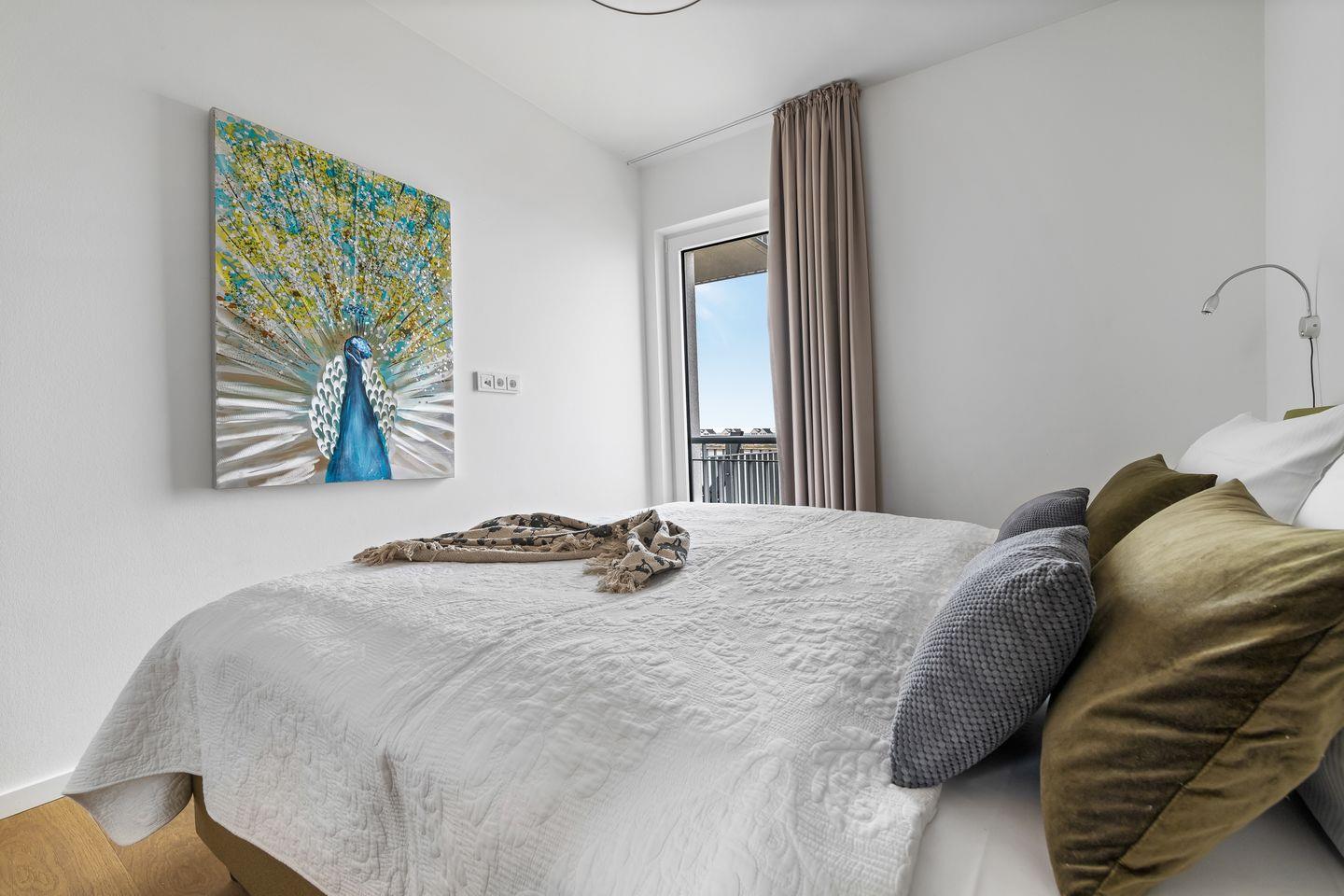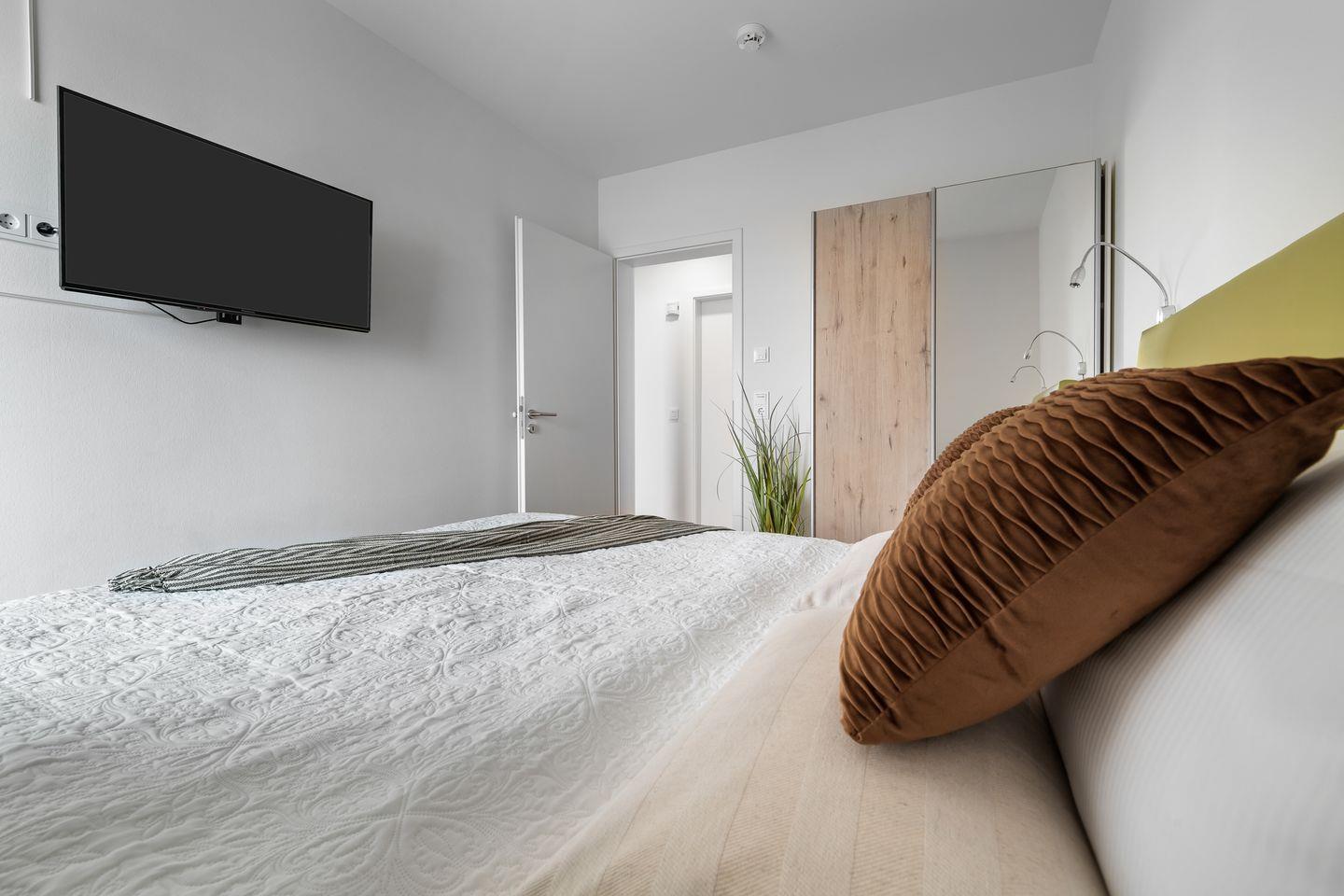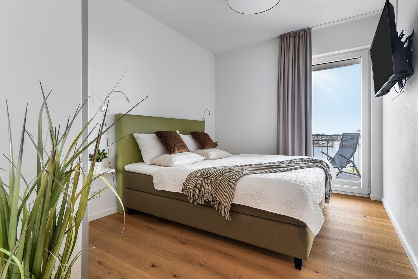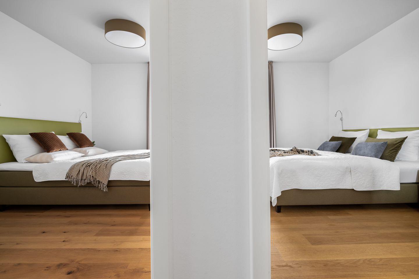 Die Schlafzimmer erwarten unsere Gäste in gemütlichen Grün- und Erdtönen. Sie verfügen über großzügige Boxspringbetten und bodentiefe Fenster, die sich durch Gardinen verdunkeln lassen. Eines der Schlafzimmer besitzt außerdem einen Smart-TV.