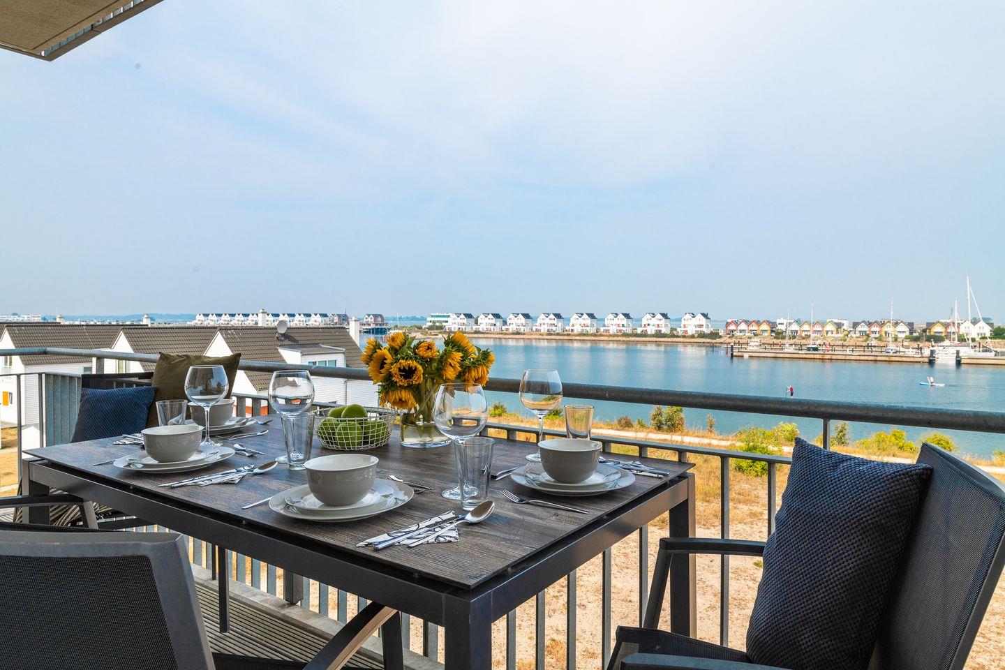Die hochwertig möblierte Ferienwohnung "Ocean Harbour" verfügt über zwei Balkone, der perfekte Ort für den morgendlichen Kaffee, eine Grillerei oder einen abendlichen Sundowner. Sonnenliegen sowie eine Sitzgarnitur stehen für unsere Gäste bereit.