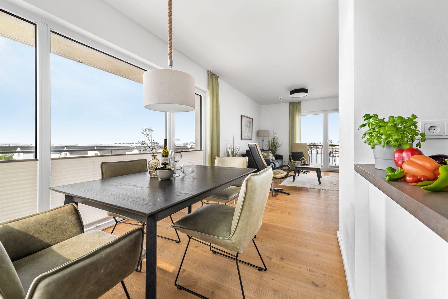 Der Koch- und Essbereich ist mit der voll ausgestatteten Einbauküche ein Traum für jeden Hobbykoch. Hier lässt sich das Zubereiten von Köstlichkeiten und das gemütliche Beisammensein herrlich vereinbaren.