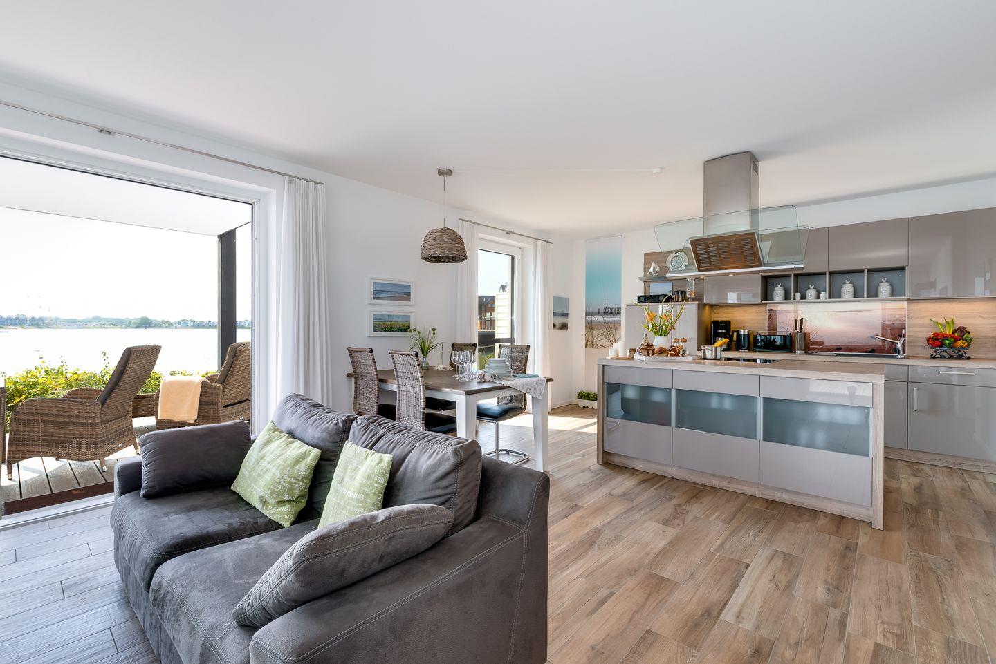 Der große lichtdurchflutete Wohn-und Essbereich mit großer Panoramaglasfront und integrierter Küche mit Kochinsel lässt jedes Urlauberherz höher schlagen. Ein Kaminofen und ein großer Fernseher garantieren kuschlige Stunden bei jedem Wetter. Die große Sofalandschaft bietet genügend Platz für bis zu 4 Personen.