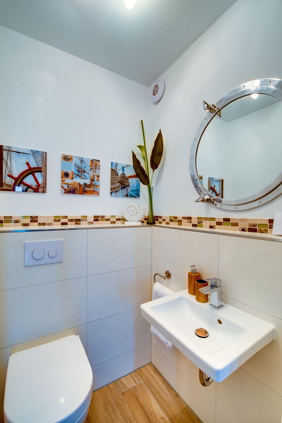 Das Badezimmer verfügt über eine finnische Sauna, Badewanne, Dusche, WC und Waschbecken. Und natürlich steht ein separates Gäste-WC mit Waschbecken zur Verfügung.