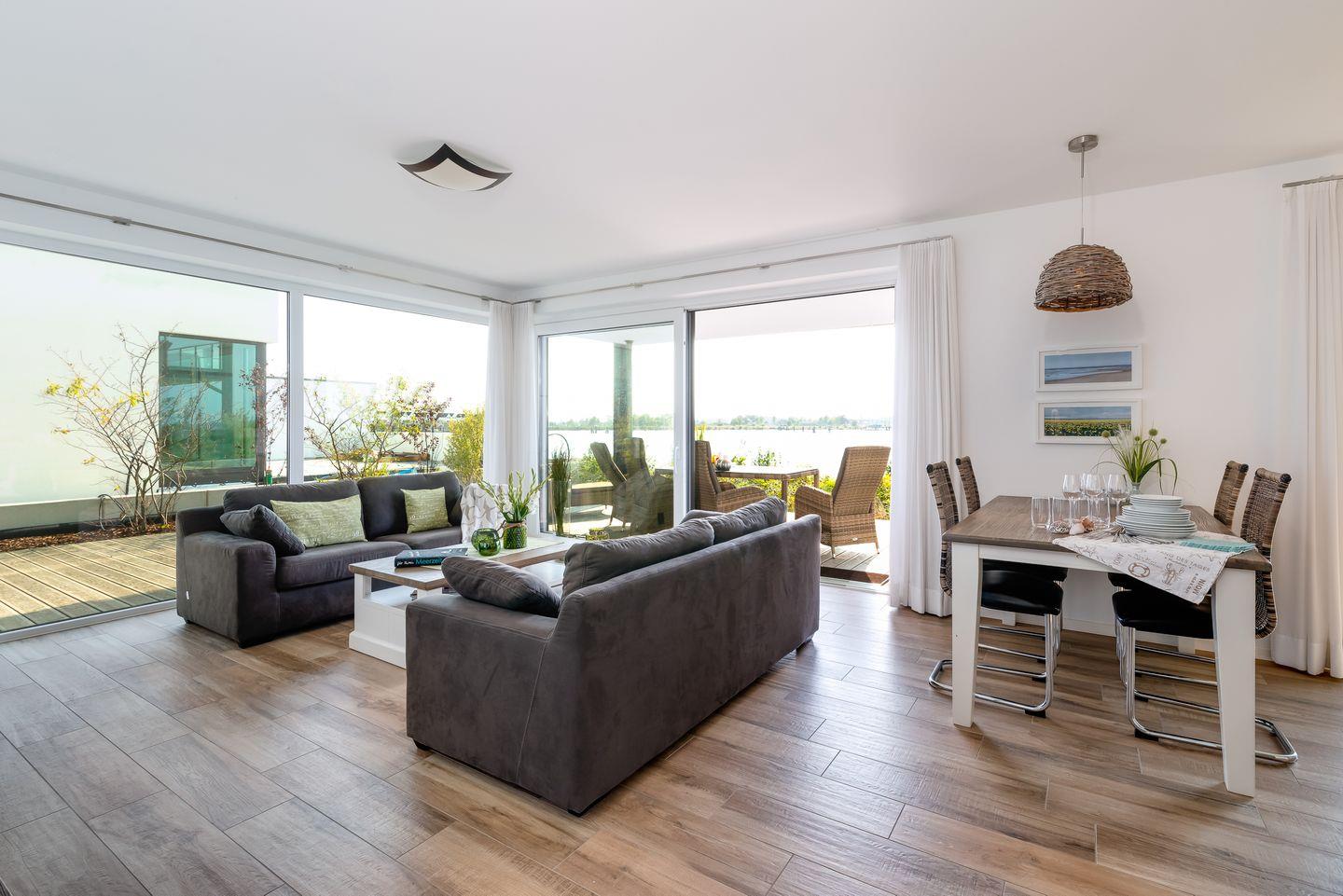 Ein Esstisch mit bequemer Bestuhlung macht auch diesen Wohnbereich zu einer Wohlfühloase. Der direkte Zugang zur großen teilüberdachten Terrasse rundet das Bild Ihres Heimathafens ab. Die Terrasse ist mit hochwertigen Möbeln und einem Grill ausgestattet. Hier lässt sich so manch lauschiger Abend verbringen.