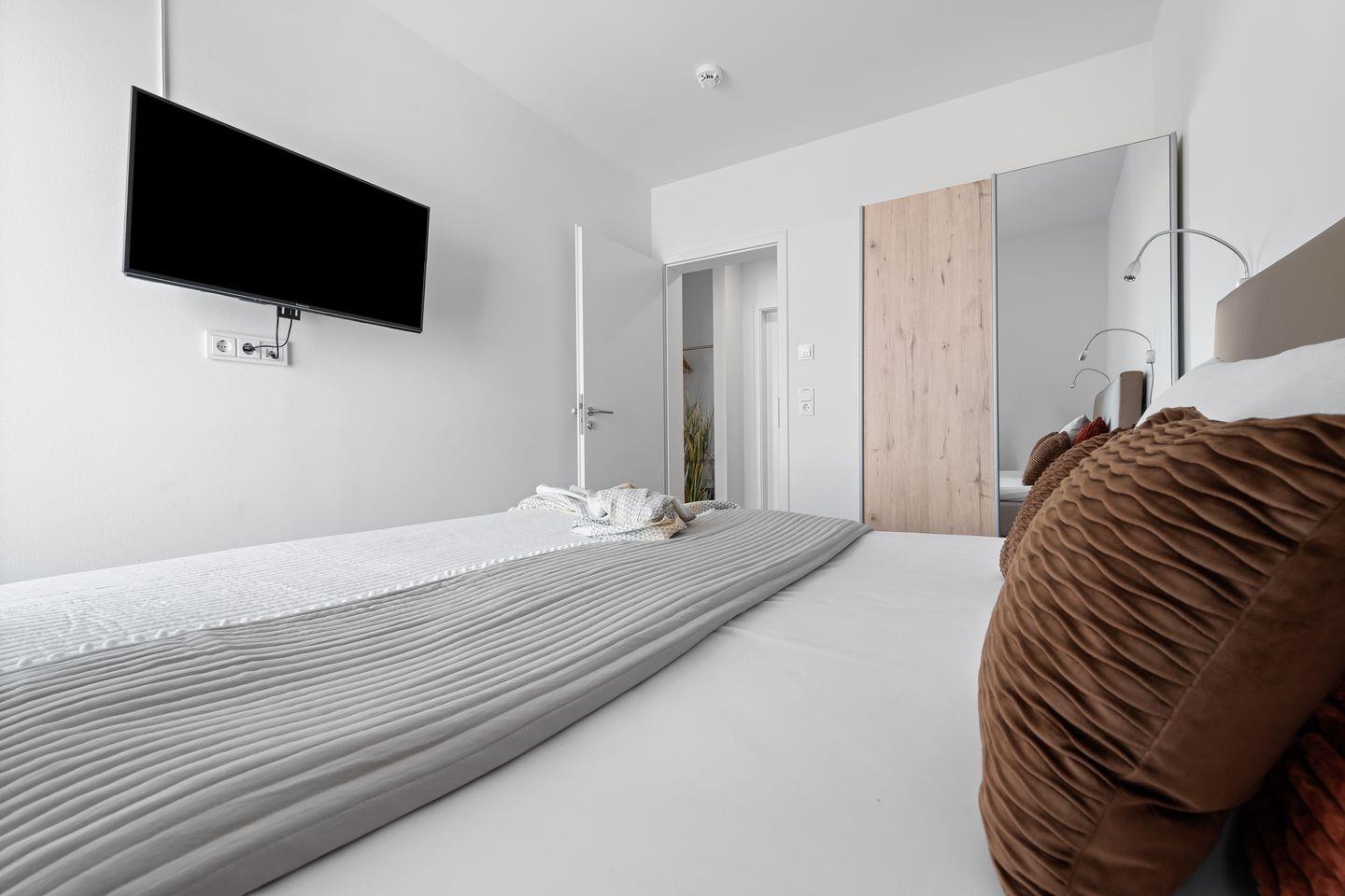 Die Schlafzimmer sind in hellen Erdtönen gestaltet und verfügen über große Boxspringbetten und bodentiefe Fenster, die sich durch Gardinen abdunkeln lassen. Auch von hier fällt der Blick ins Blaue.