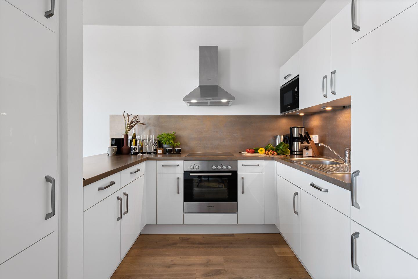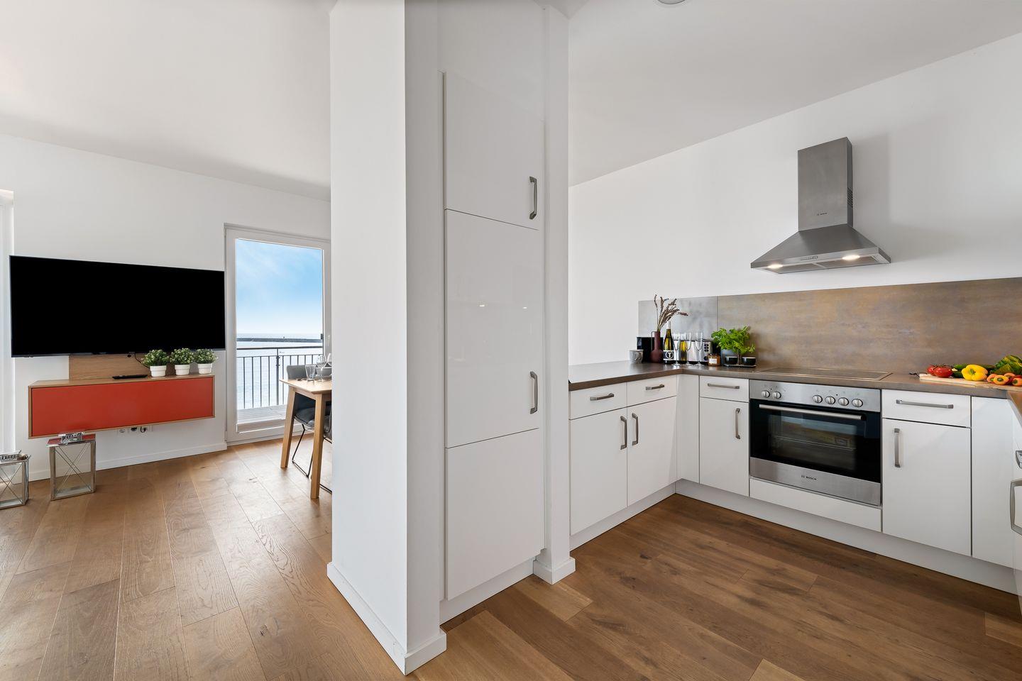 Vom Balkon lässt sich der Urlaubstag mit Meeresbrise in der Nase und einem dampfenden Kaffee in der Hand starten, während Segelschiffe vorbeiziehen. Der offen gestaltete Wohn- und Essbereich mit integrierter Küche und Panoramafront bietet den idealen Platz zum Beisammensein und Erholen.