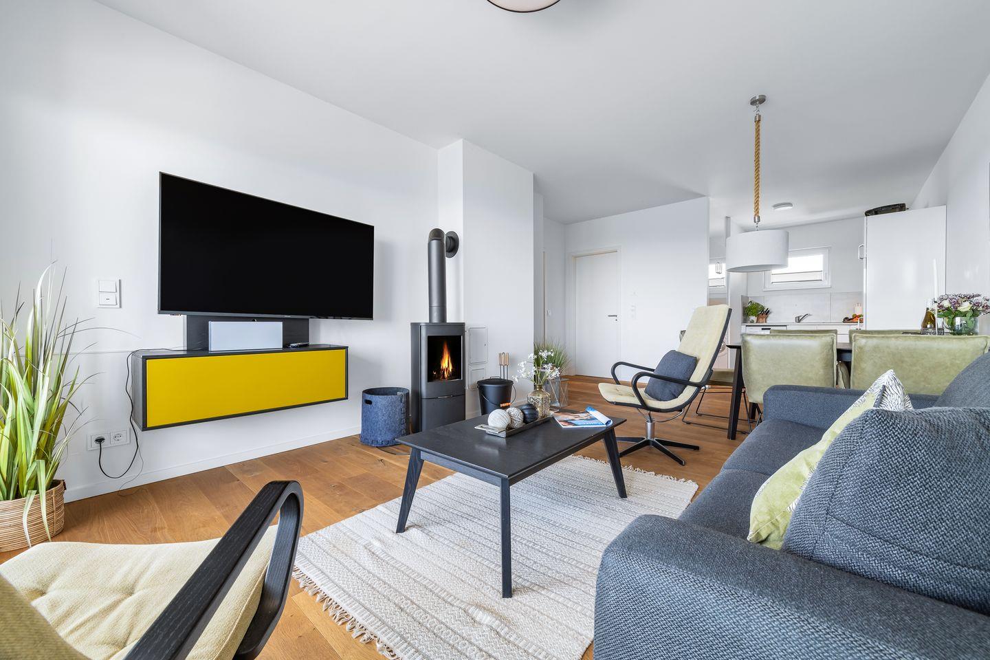 Ein wahrer Wohlfühlort ist der stilvoll möblierte Wohnbereich mit hellem Parkettboden, der durch die Panoramafront einen herrlichen Blick auf die Ostsee bietet. Für Gemütlichkeit sorgt außerdem ein Kaminofen und bequeme Sitzmöbel. Direkt an den Wohnbereich schließt die hochwertige Einbauküche an, sie ist mit allem ausgestattet, was das Hobbykoch-Herz begehrt. Während das Kochens blickt man auf die vorbeiziehenden Segelschiffe - was will man Meer?