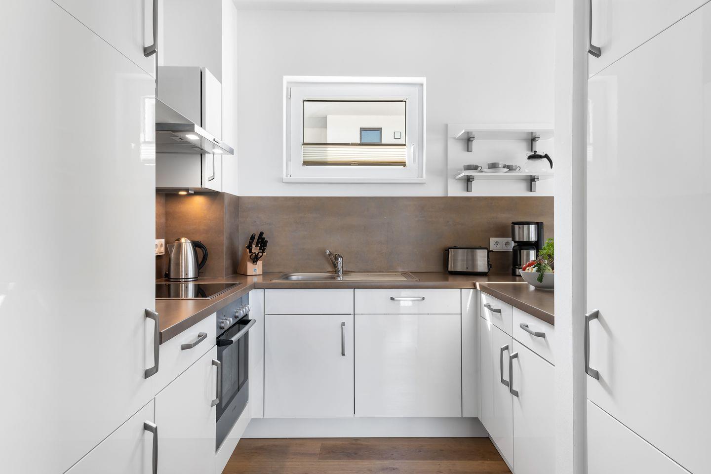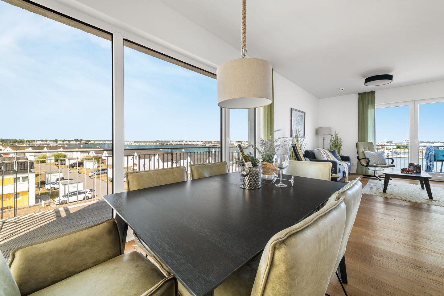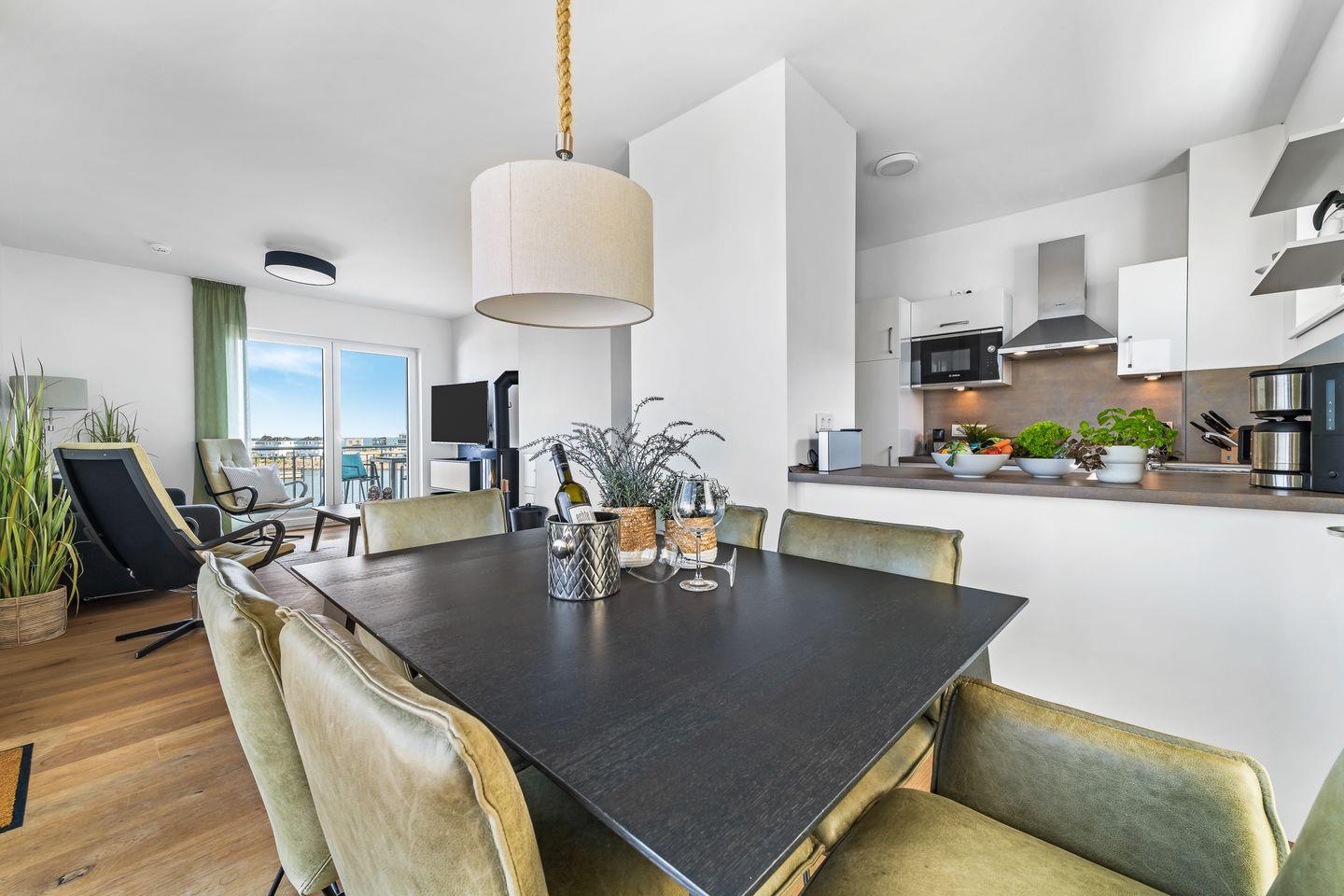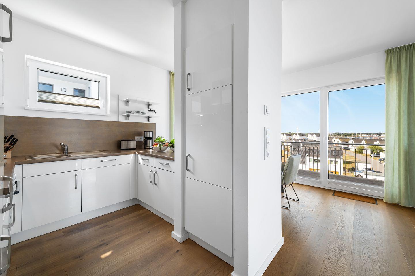 Die U-förmige Einbauküche ist voll ausgestattet und ist mit dem anschließenden Essbereich der ideale Ort für gemütliche Kochabende. Mit frisch zubereiteten Köstlichkeiten, einem Glas Rotwein und dem Blick auf das Hafenkino ist der Urlaubsgenuss garantiert.
