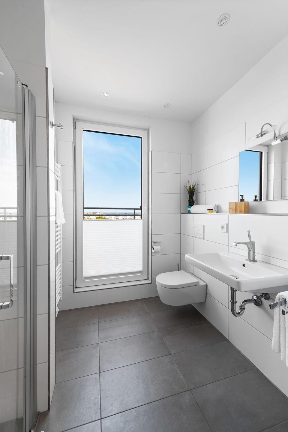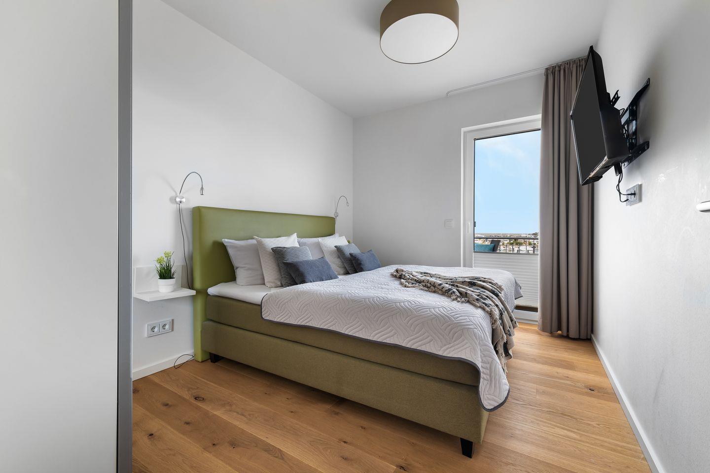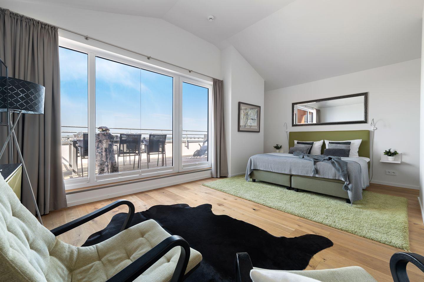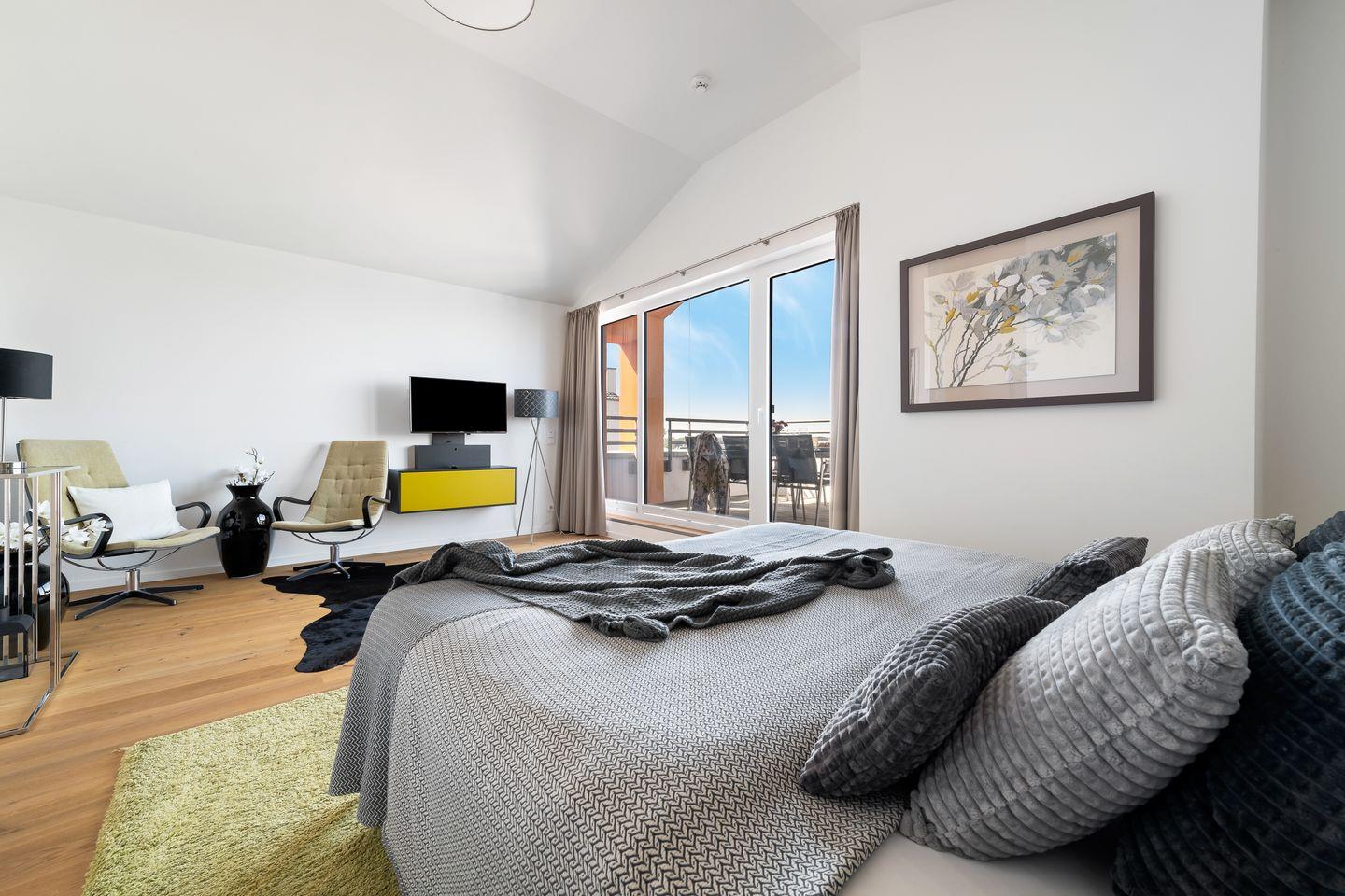 Ein besonderes Schmuckstück, der Wohnung "Ocean Sky", ist der Masterbedroom in der oberen Etage, der durch einen eigenen Balkon erweitert wird, der perfekte Platz für den morgendlichen Kaffee. In der oberen Etage befindet sich ein weiteres helles Badezimmer mit bodengleicher Dusche.