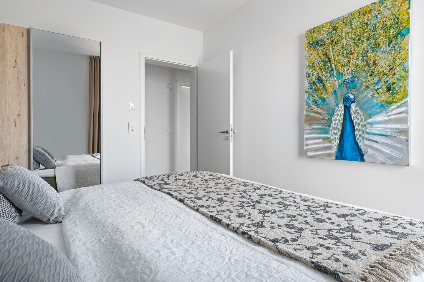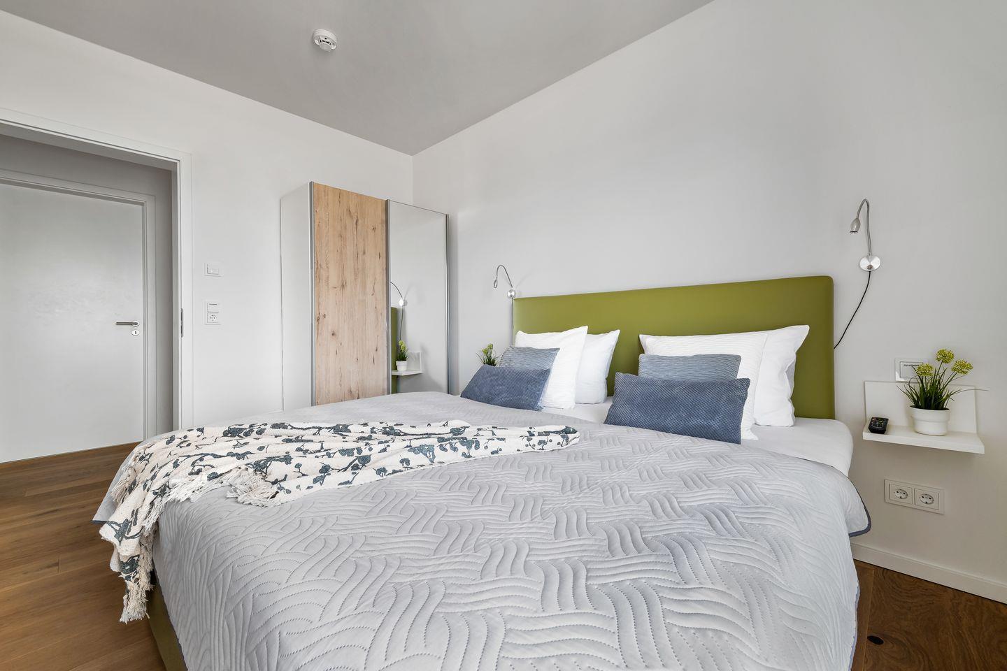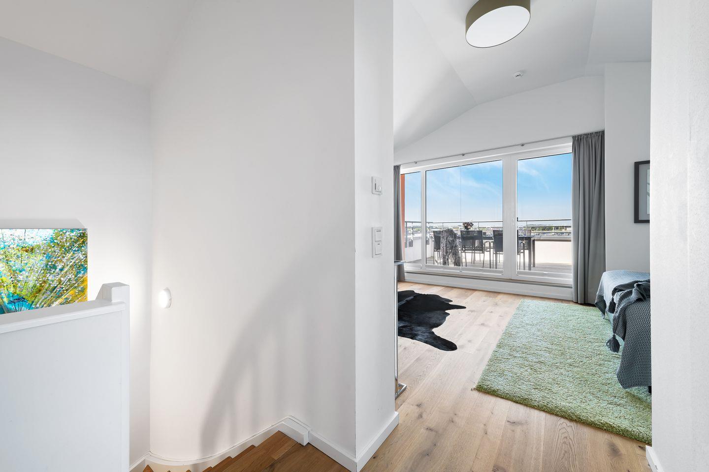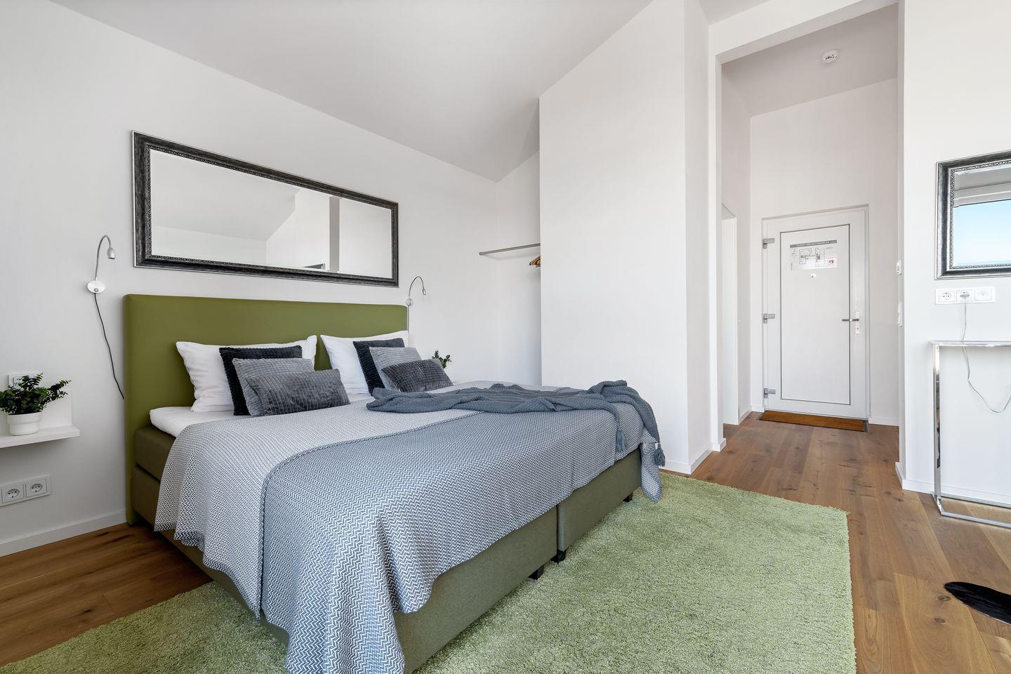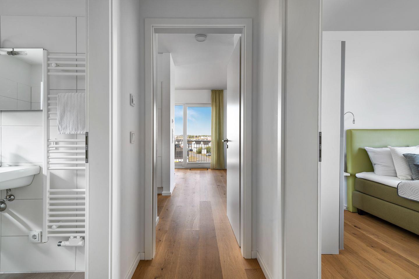 Ein besonderes Schmuckstück, der Wohnung "Ocean Sky", ist der Masterbedroom in der oberen Etage, der durch einen eigenen Balkon erweitert wird, der perfekte Platz für den morgendlichen Kaffee. In der oberen Etage befindet sich ein weiteres helles Badezimmer mit bodengleicher Dusche.