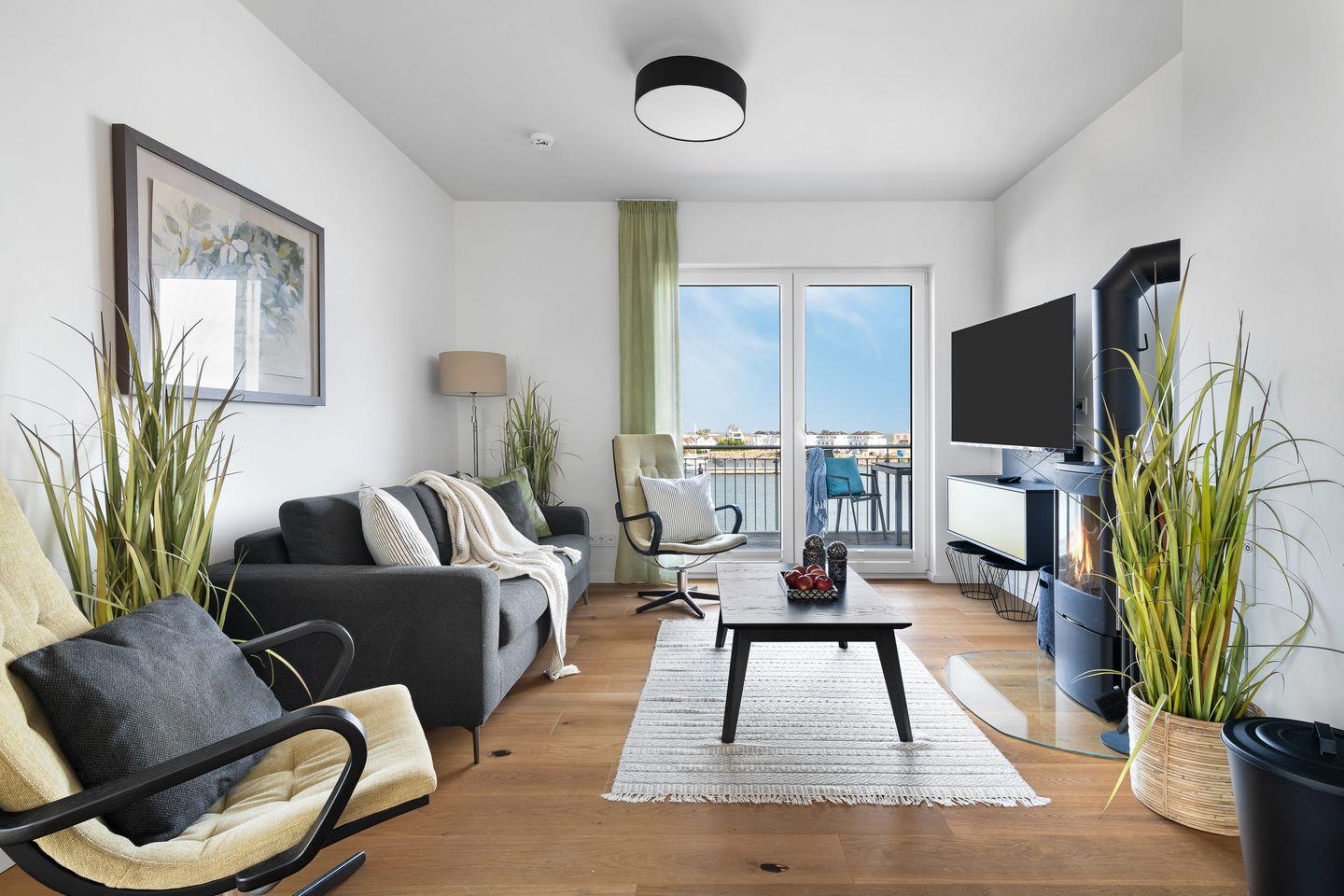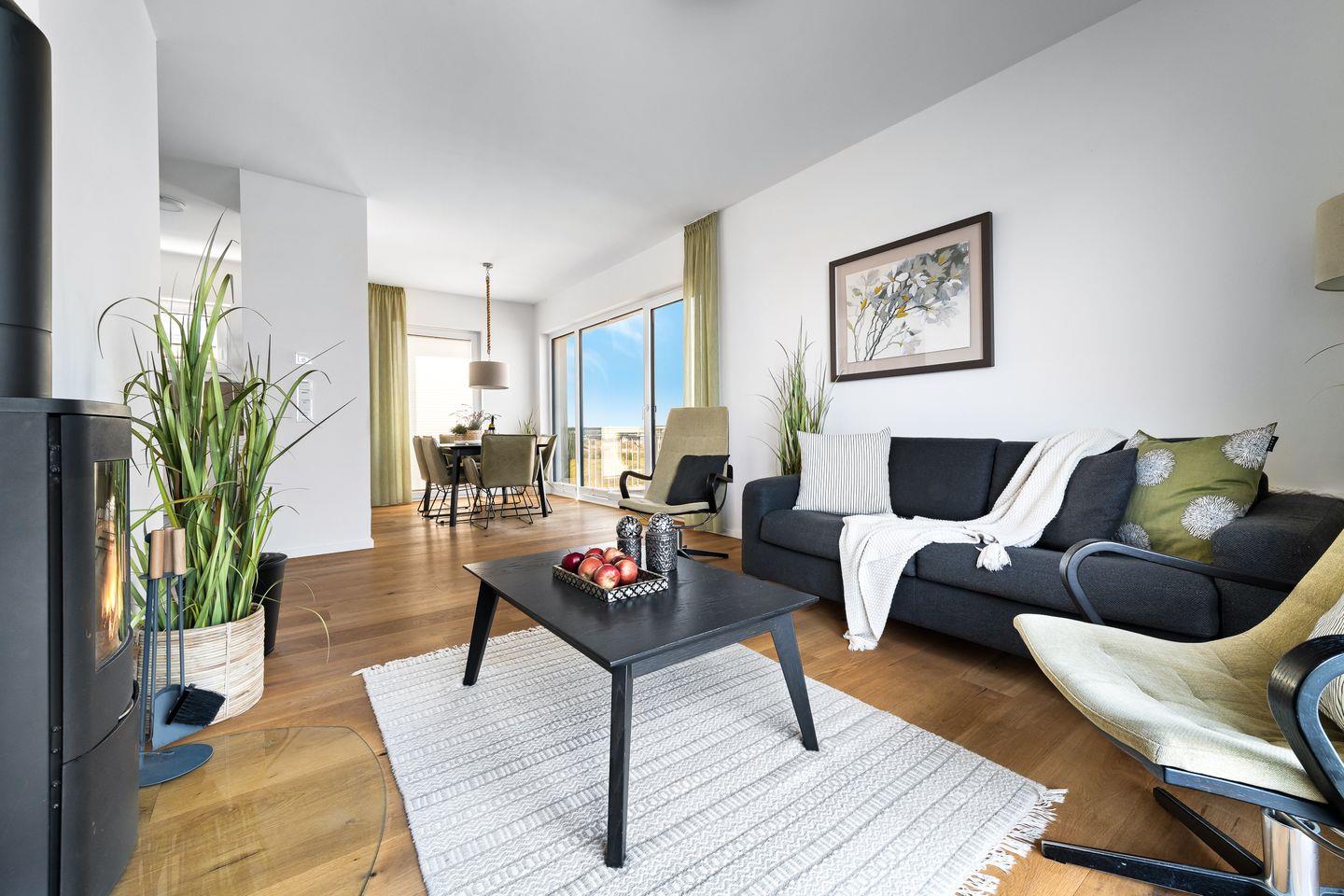 Das schöne Apartment "Ocean Sky" empfängt unsere Gäste mit einem hellen, modernen Interieur. Durch die Panoramafront sowie die bodentiefen Fenster sind alle Räume lichtdurchflutet, besonders der Wohn- und Kochbereich. Ein gemütliches Sofa, bequeme Sessel und Kaminfeuer laden hier zum Entspannen ein.