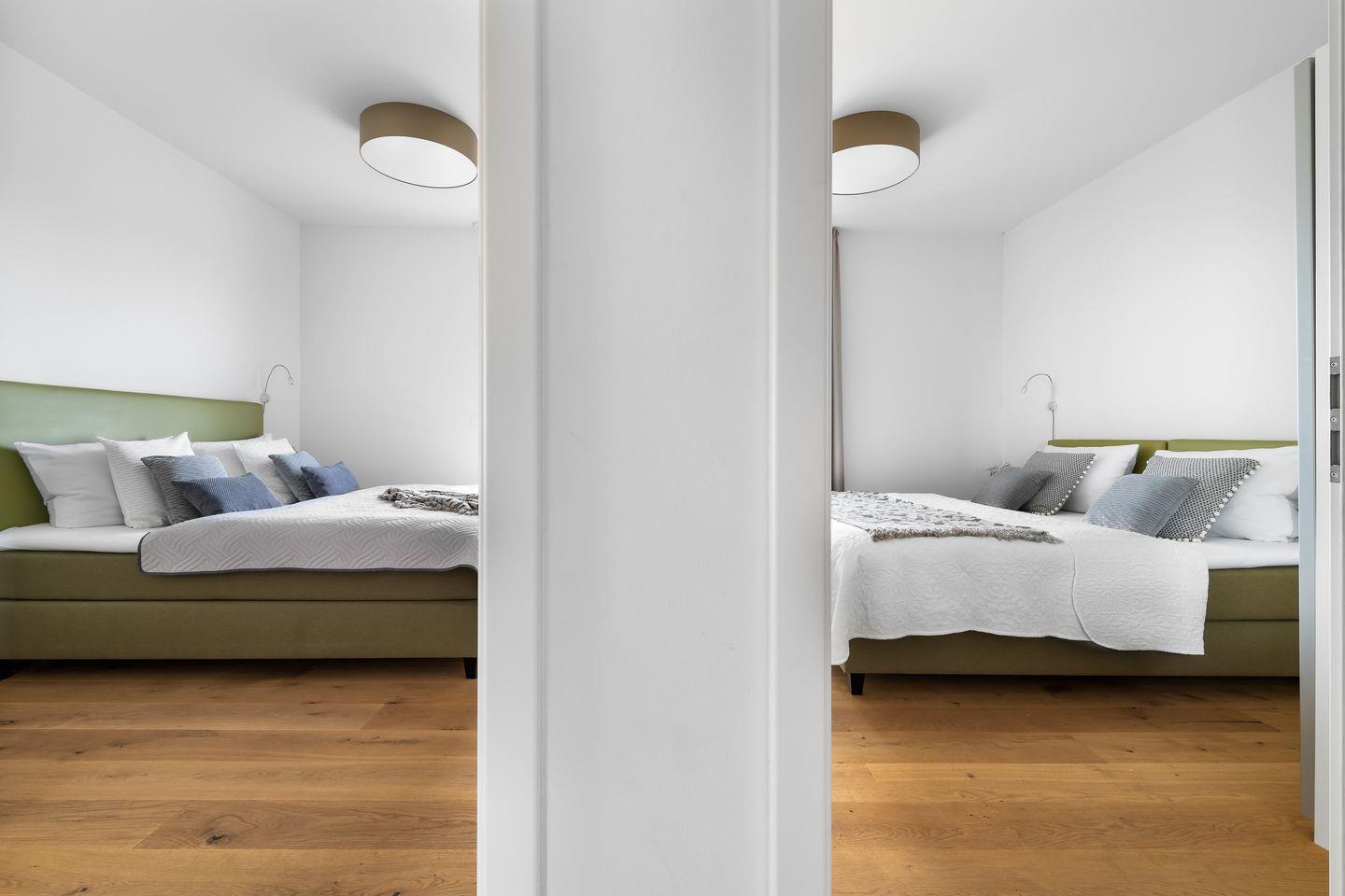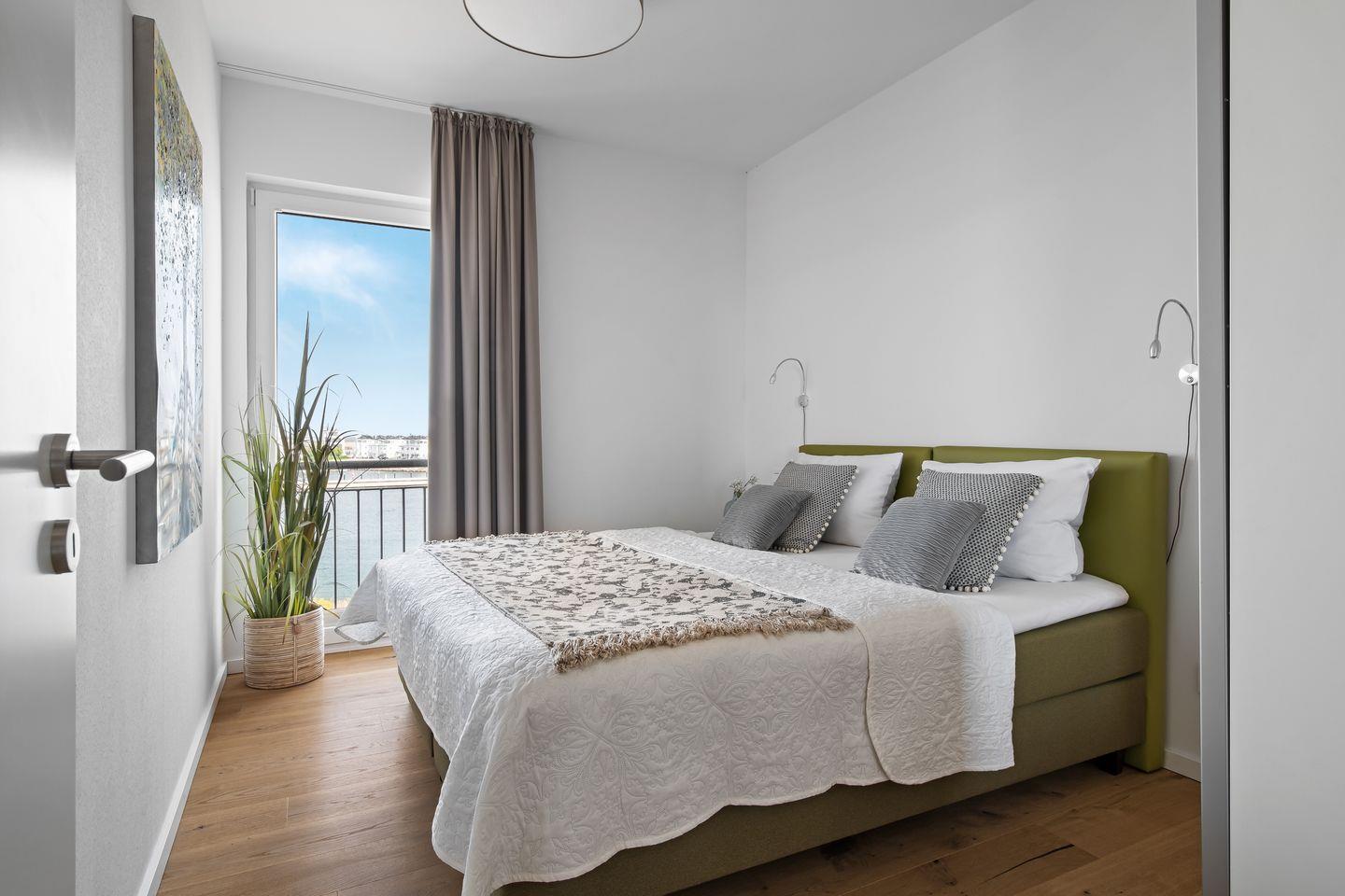 In der unteren Etage befinden sich zwei Schlafzimmer, diese sind mit Boxspringbetten ausgestattet, außerdem ermöglichen die bodentiefen Fenster einen traumhaften Blick auf die vorbeiziehenden Segelschiffe.