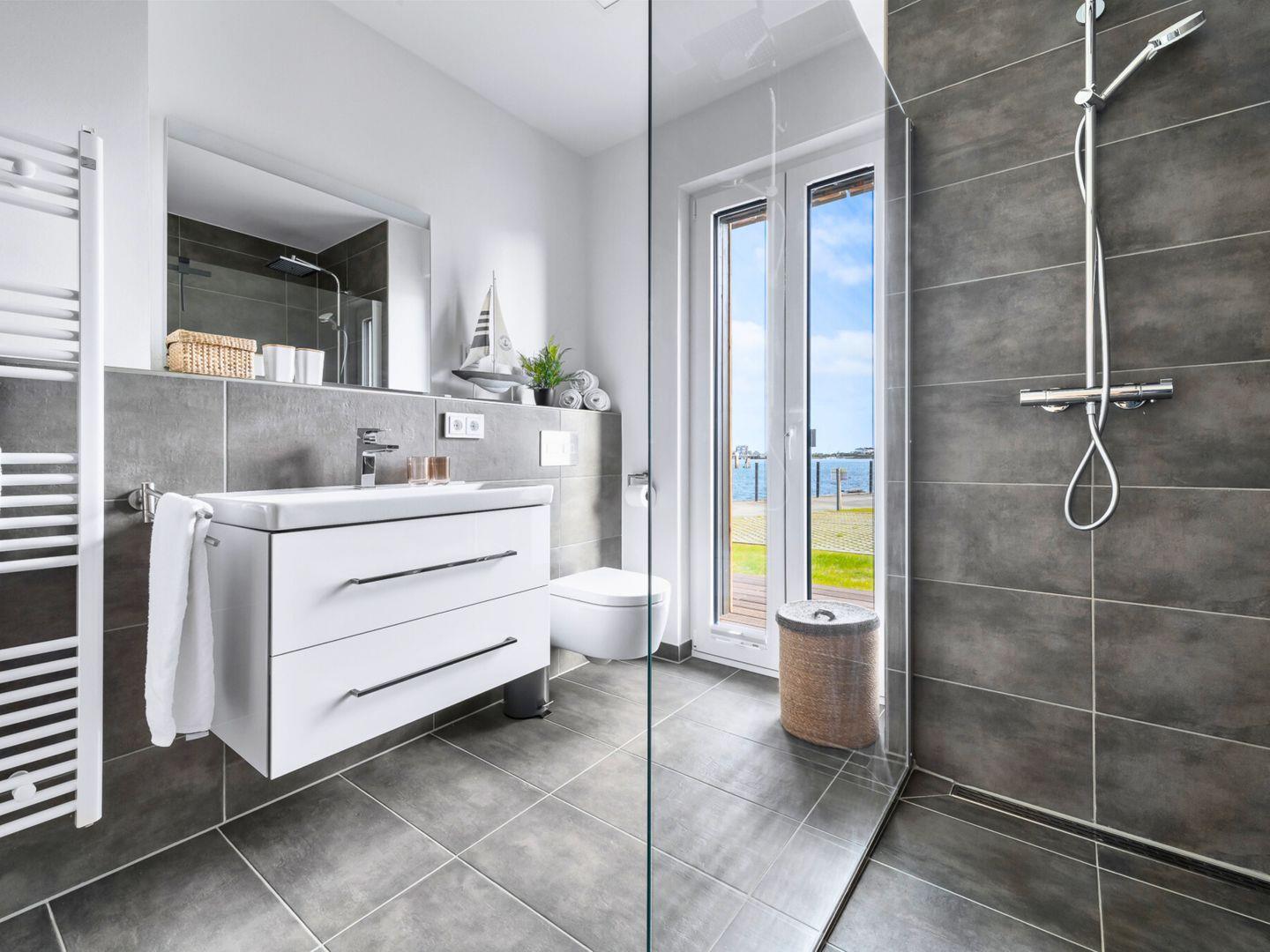 Auch das Badezimmer der Ferienwohnung im Ostsee Resort Olpenitz lässt keine Wünsche offen. Es verfügt über eine exklusive Ausstattung, zu der eine Infrarotsauna und eine Regendusche gehören. Hier finden Sie alles, um Ihren erholsamen Ostseeurlaub perfekt zu machen.
