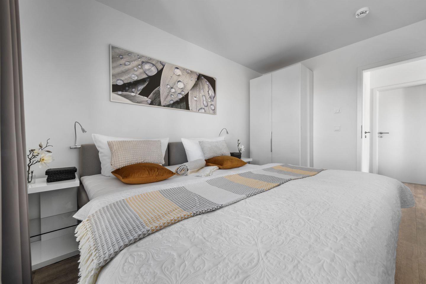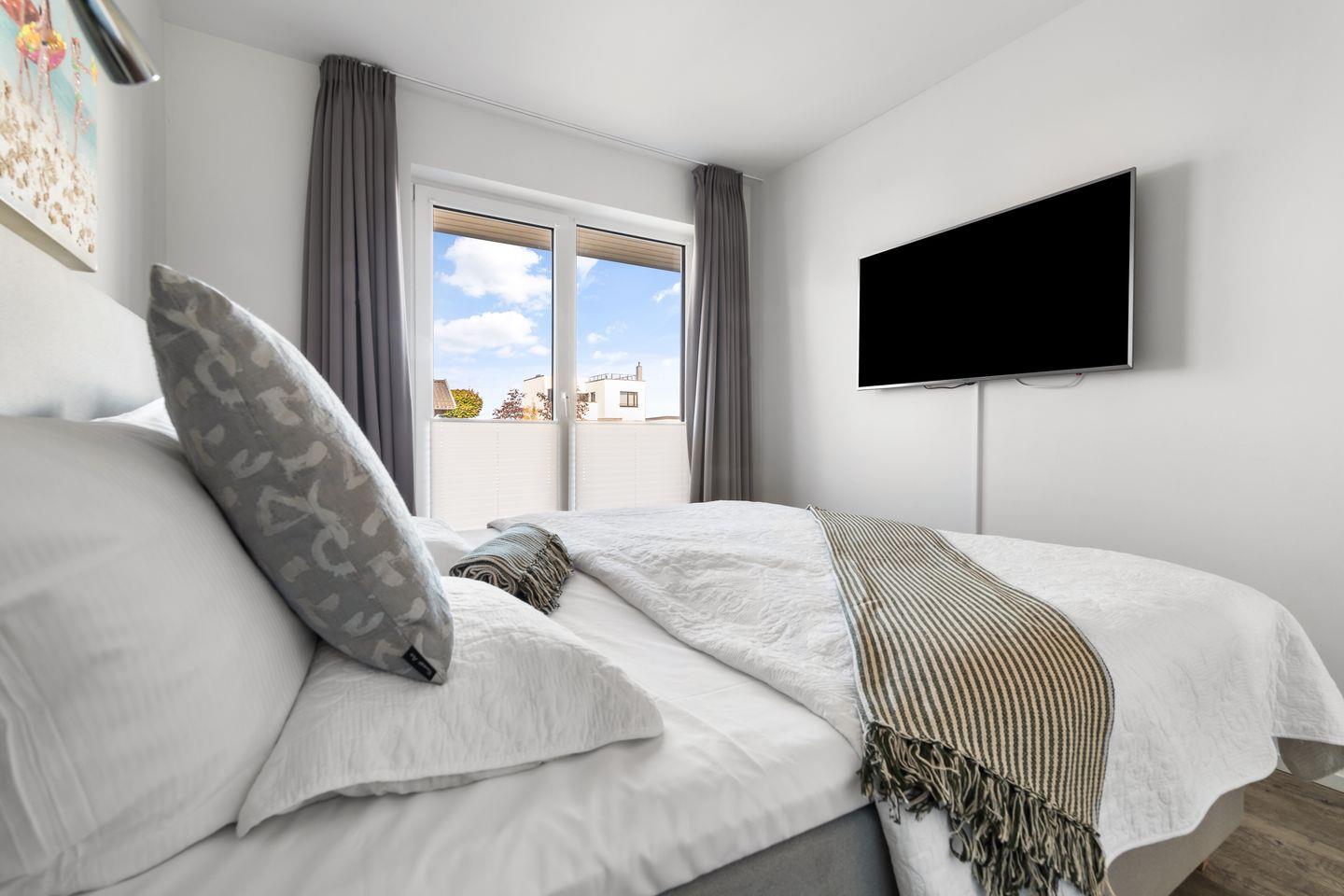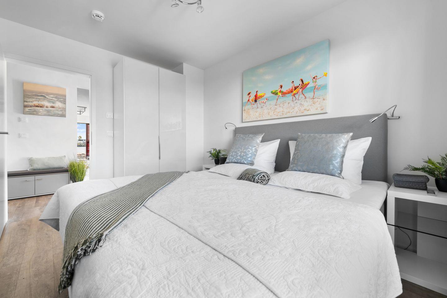 Eine Besonderheit des Ferienhauses ist es, dass beide Schlafzimmer mit großem Doppel- Boxspringbett Zugang zu einer zweiten Terrasse haben. Beide Schlafzimmer verfügen über einen eigenen Kleiderschrank, Nachttischchen und im Hauptschlafzimmer bietet ein zweiter TV zusätzliche Unterhaltung.