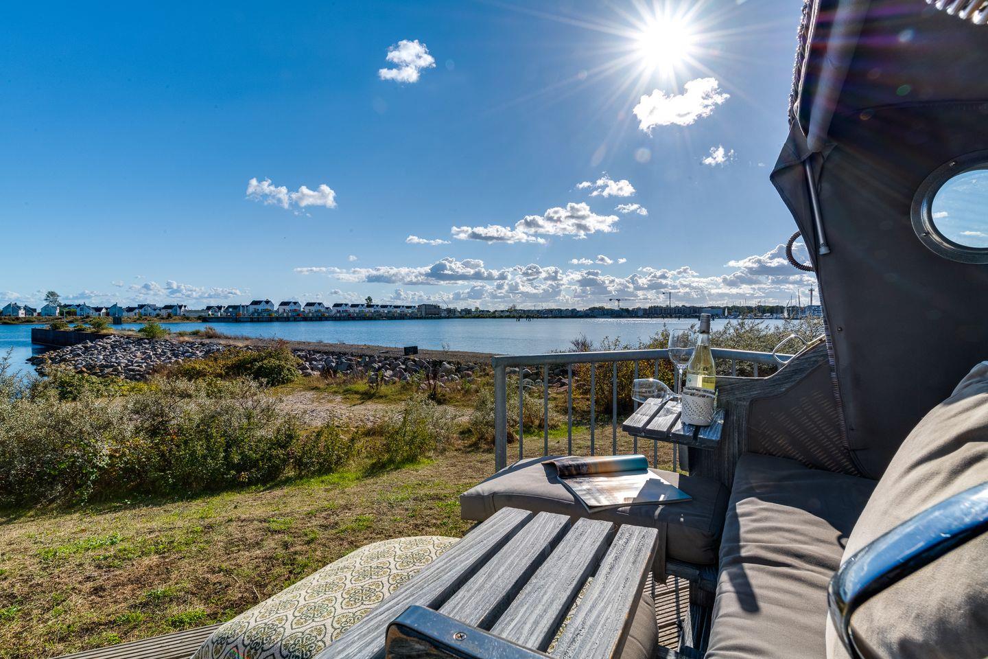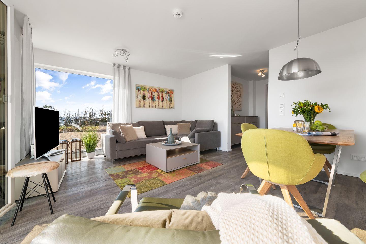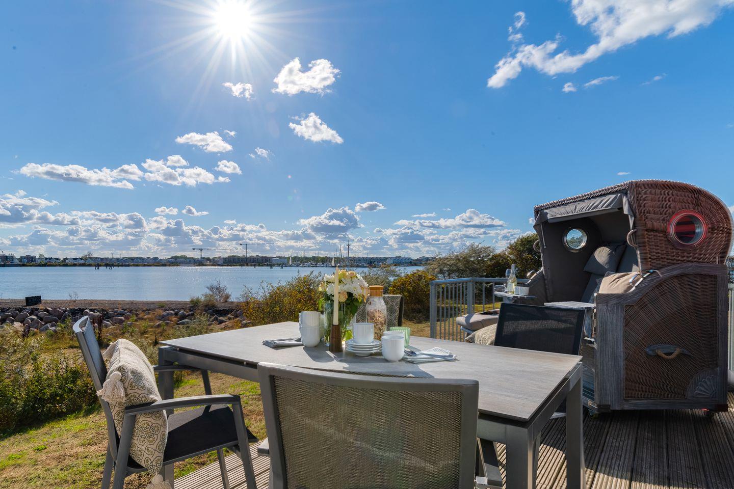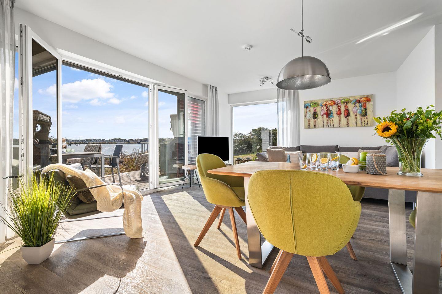 Der helle und freundliche Wohn- und Essbereich verfügt über bodentiefe Fensterfronten mit wunderbarem Blick auf die Terrasse und den davorliegenden Yachthafen. Die nach Süden ausgerichtete Terrasse ist direkt von dem Wohnbereich zugänglich und lädt ganztags zum Entspannen im eigenen Strandkorb oder einem gemütlichen Essen beim Sonnenuntergang ein.
