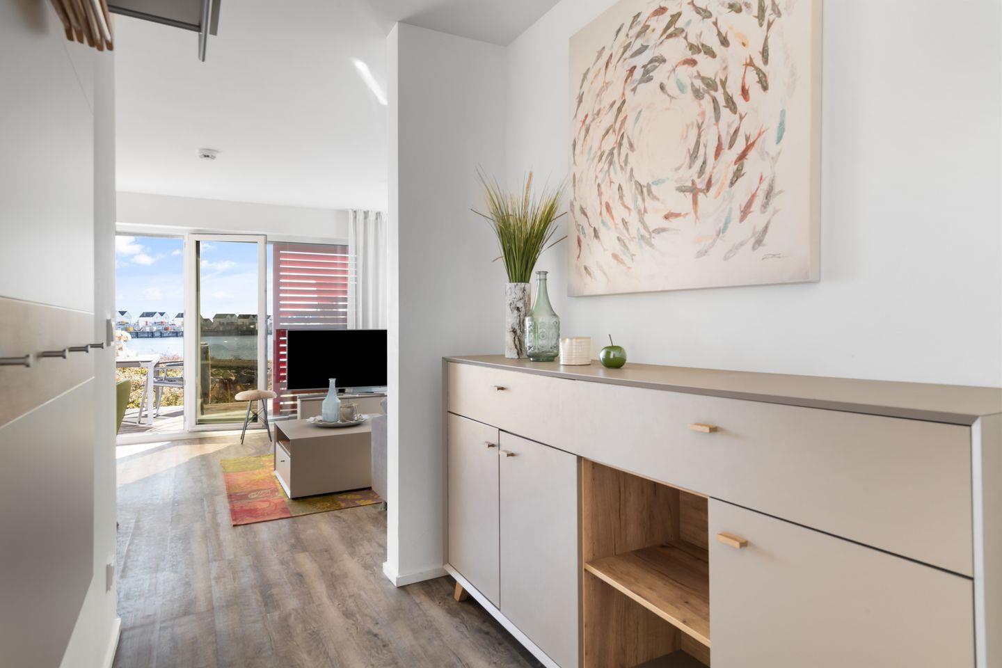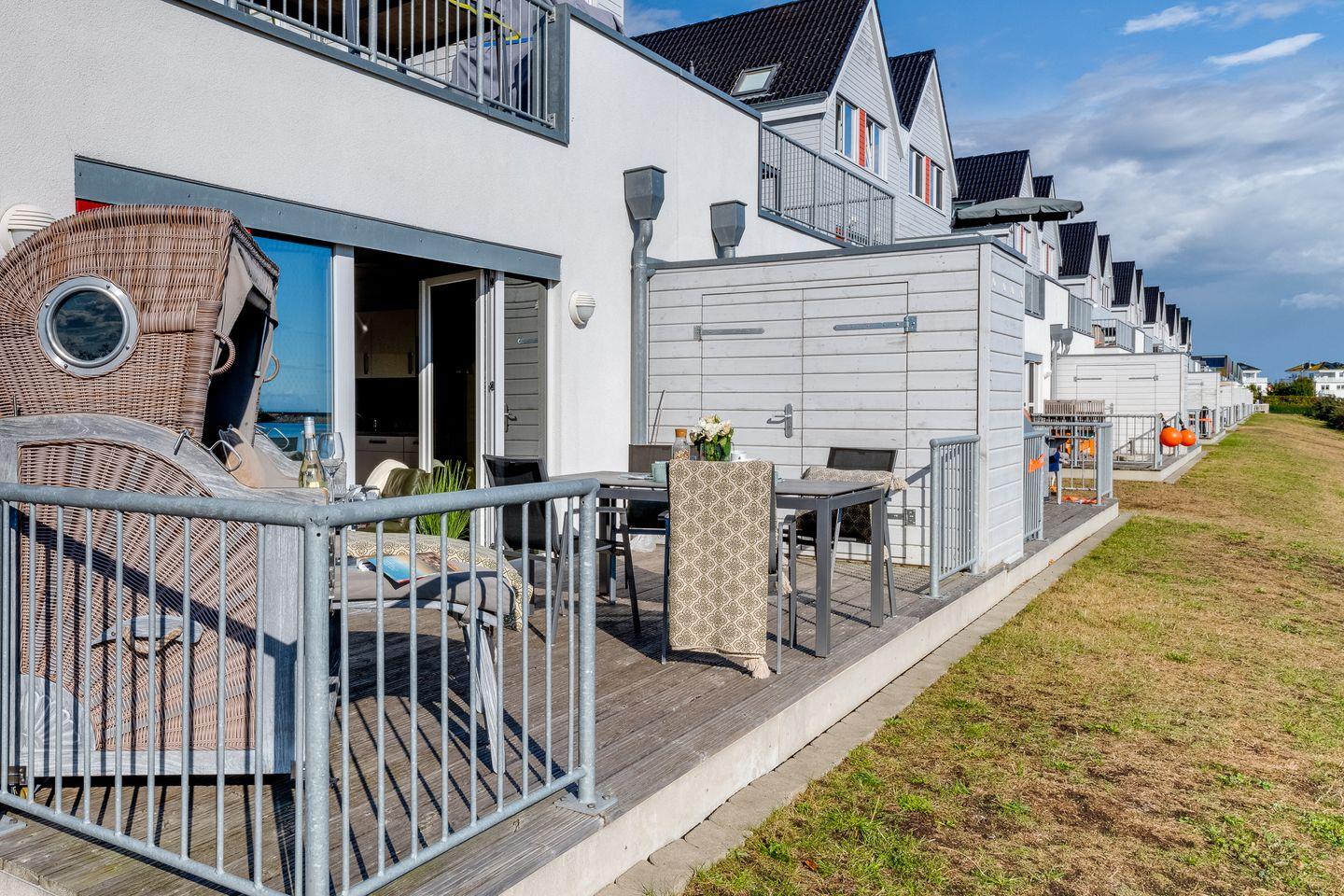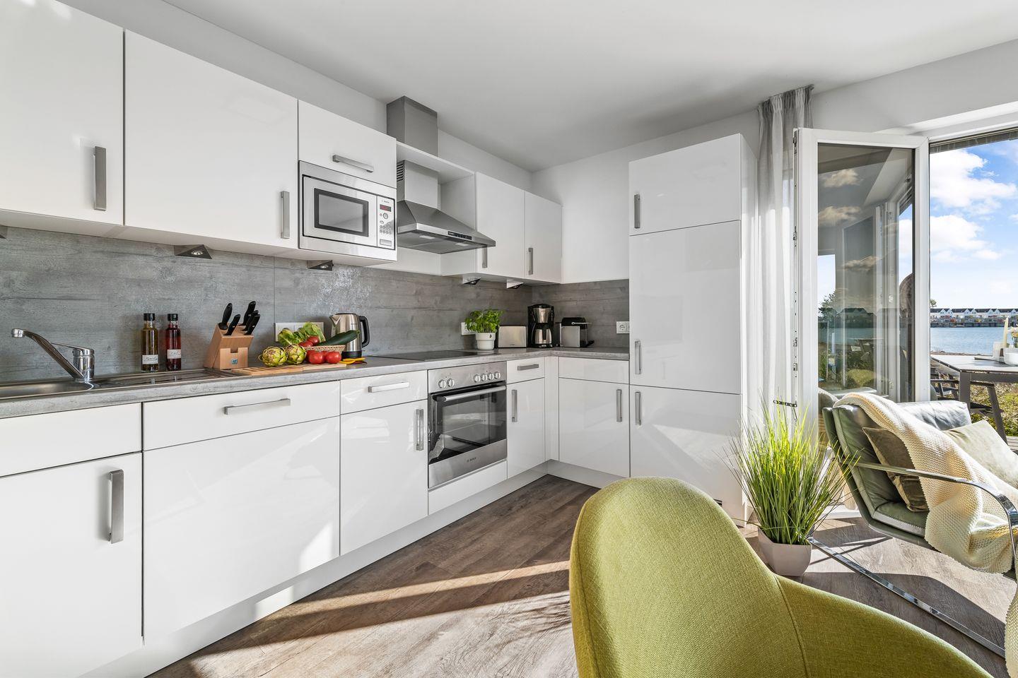 Der helle und freundliche Wohn- und Essbereich verfügt über bodentiefe Fensterfronten mit wunderbarem Blick auf die Terrasse und den davorliegenden Yachthafen. Die nach Süden ausgerichtete Terrasse ist direkt von dem Wohnbereich zugänglich und lädt ganztags zum Entspannen im eigenen Strandkorb oder einem gemütlichen Essen beim Sonnenuntergang ein.