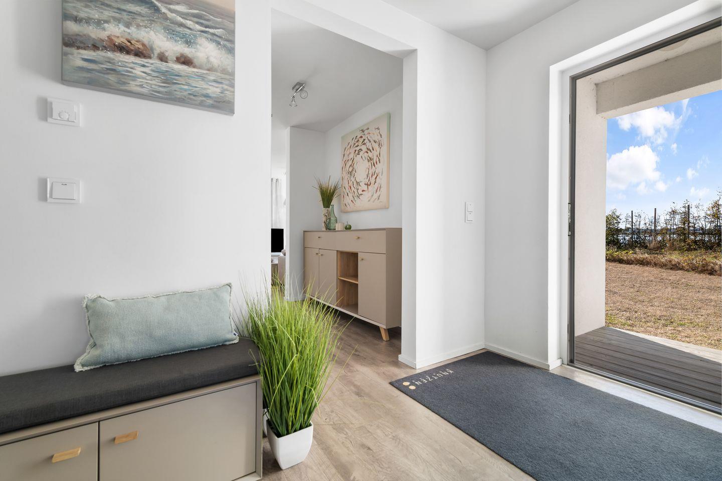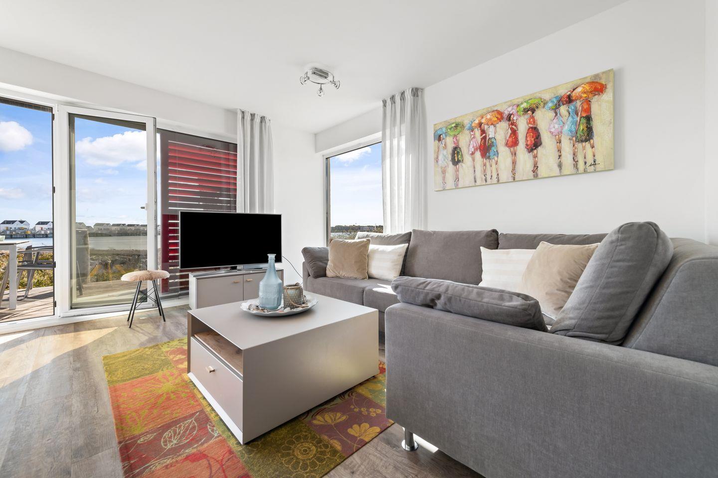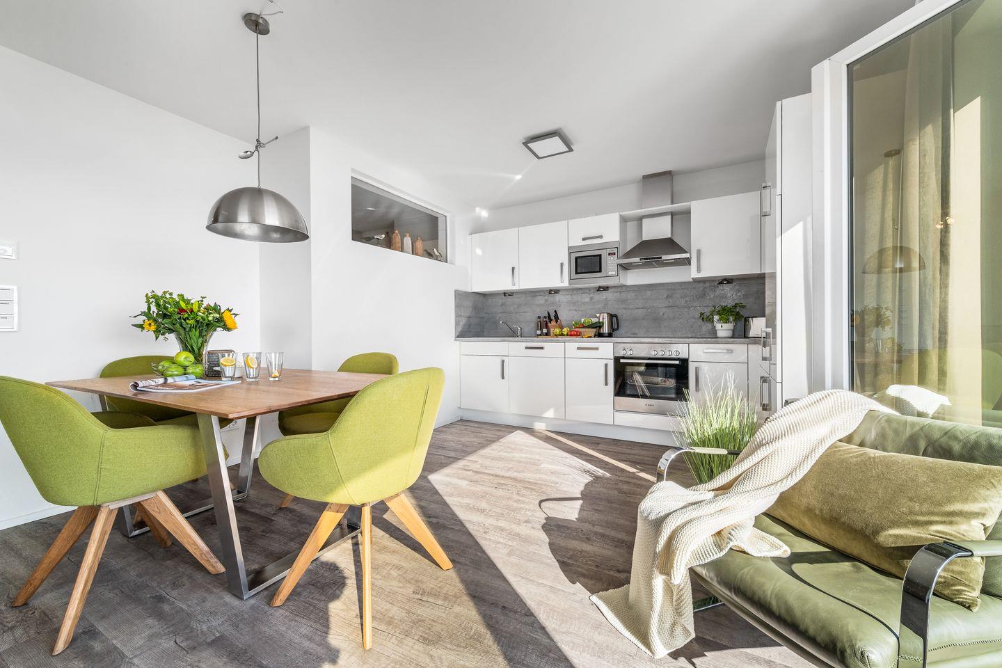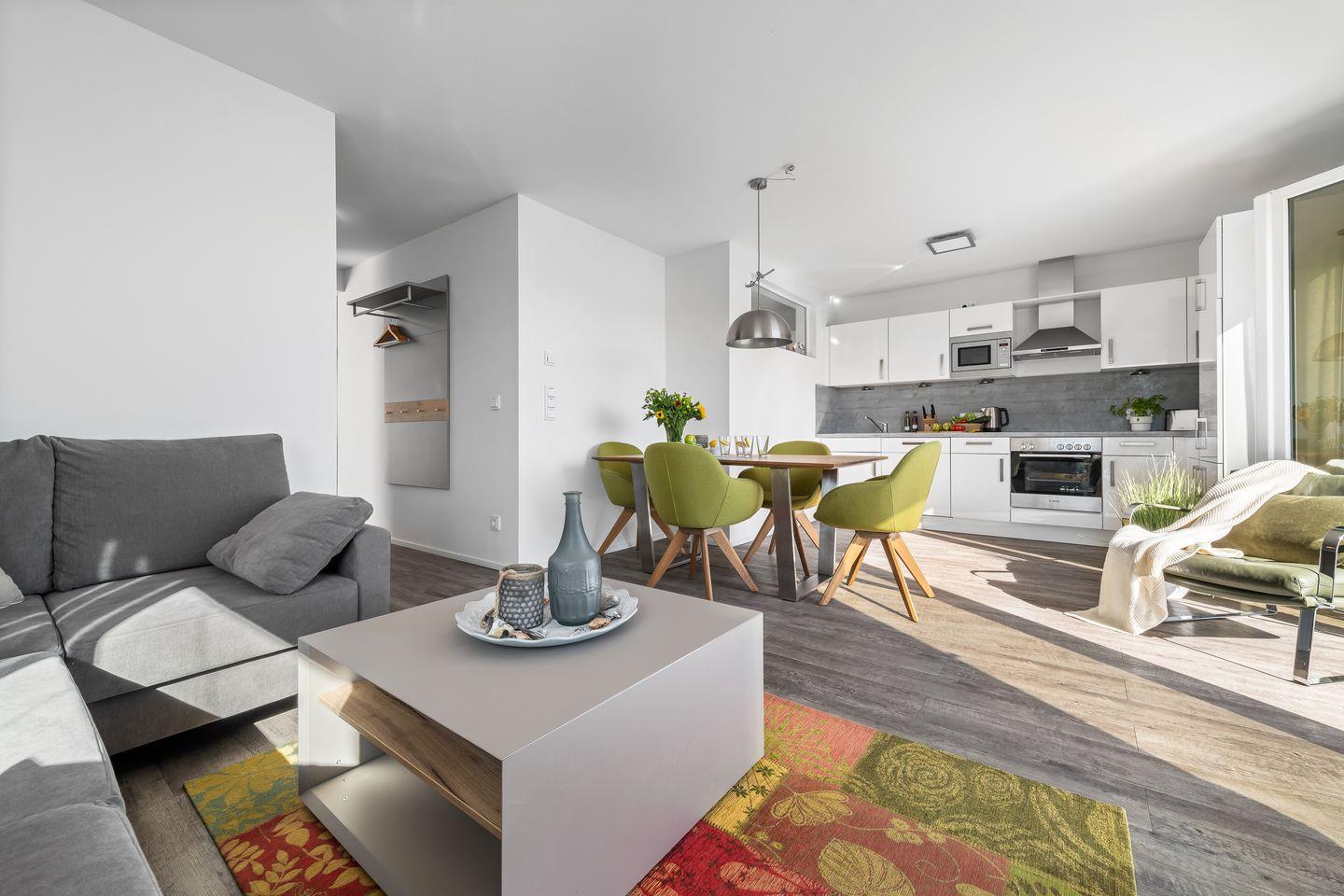 Der helle und freundliche Wohn- und Essbereich verfügt über bodentiefe Fensterfronten mit wunderbarem Blick auf die Terrasse und den davorliegenden Yachthafen. Die nach Süden ausgerichtete Terrasse ist direkt von dem Wohnbereich zugänglich und lädt ganztags zum Entspannen im eigenen Strandkorb oder einem gemütlichen Essen beim Sonnenuntergang ein.