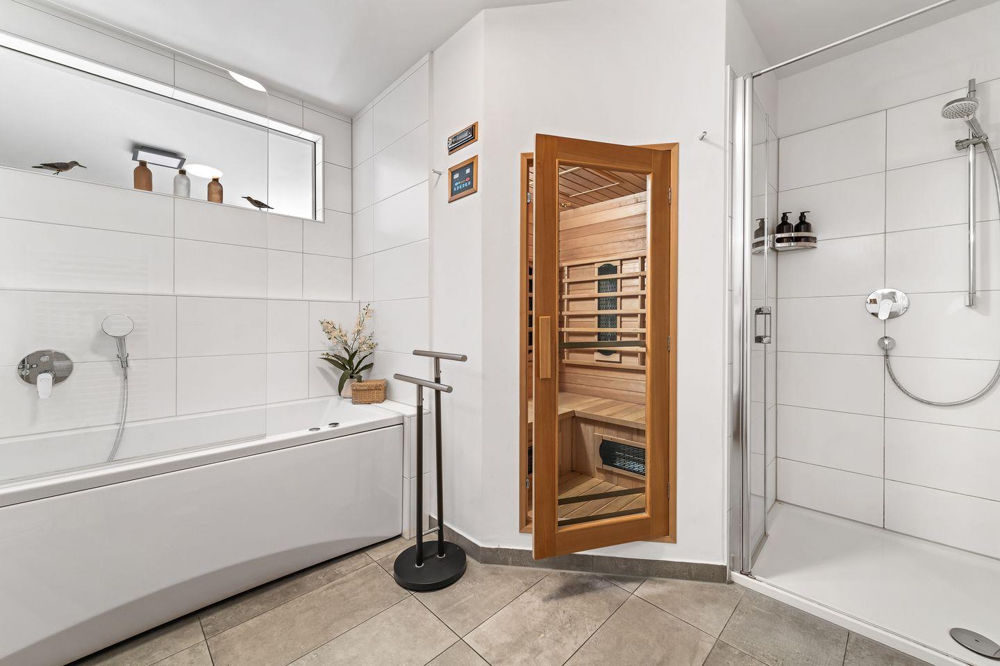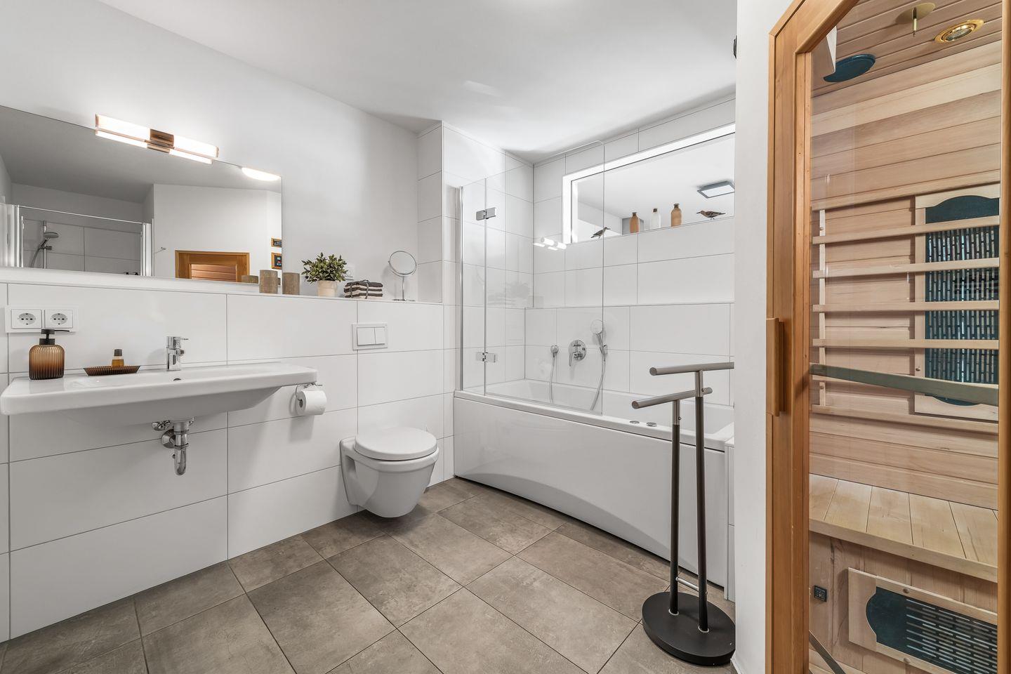 Auch Ruhesuchende und Genießer kommen auf Ihre Kosten. Die Infrarot-Wärmekabine mit Hifi-Sound-System und LED-Farblichttherapie bietet eine kleine Wellnessoase zum Entspannen nach einem langen Tag am Meer. Des Weiteren ist das Badezimmer ausgestattet mit ebenerdiger Dusche, Whirlwanne, einem WC, großen Waschbecken und einem Handtuchtrockner, welcher für zusätzliche Wärme sorgt.