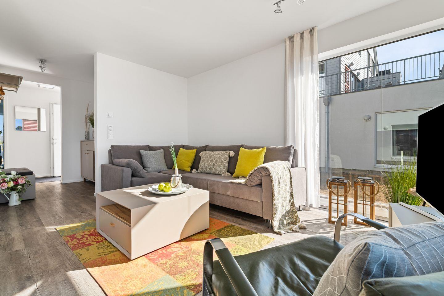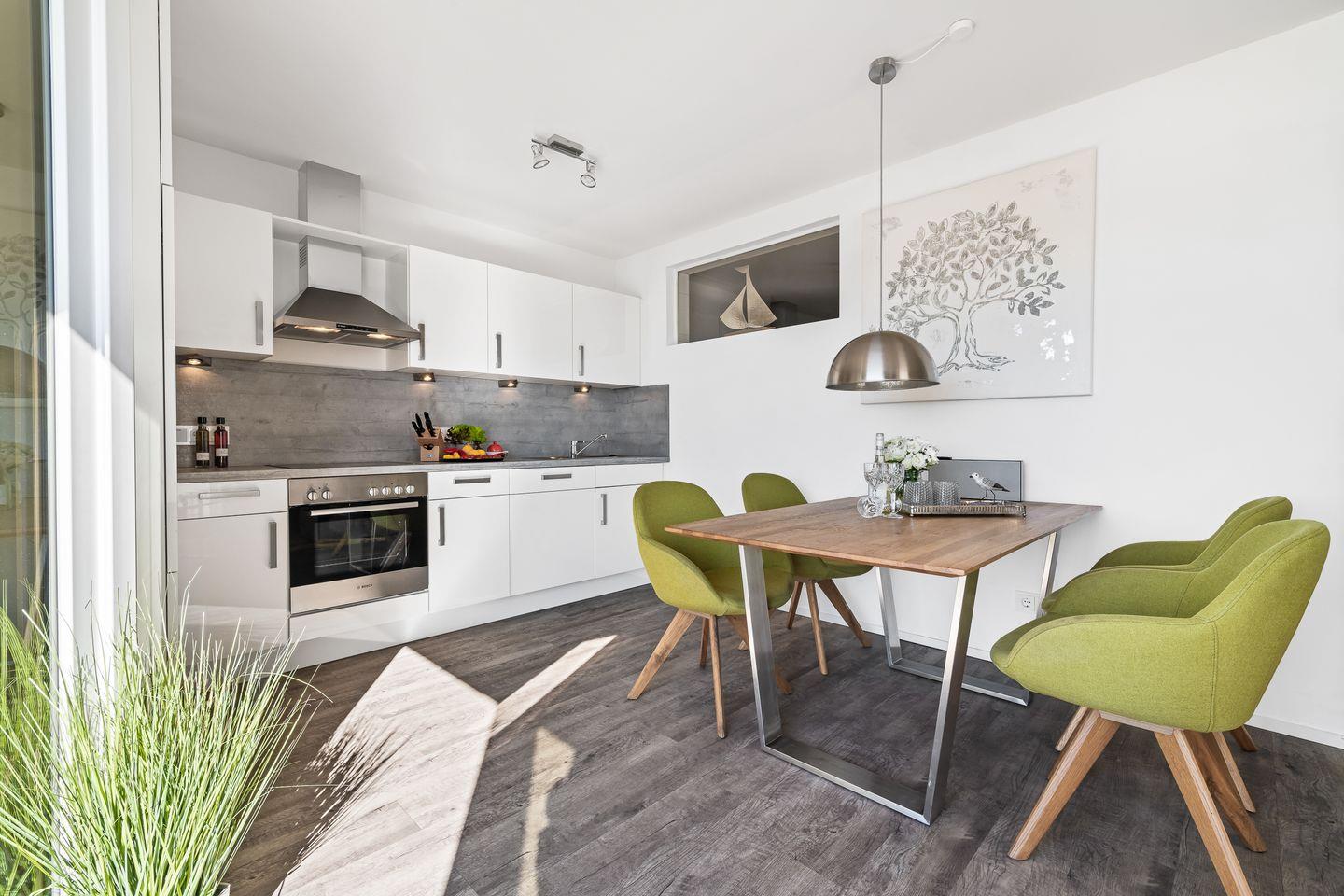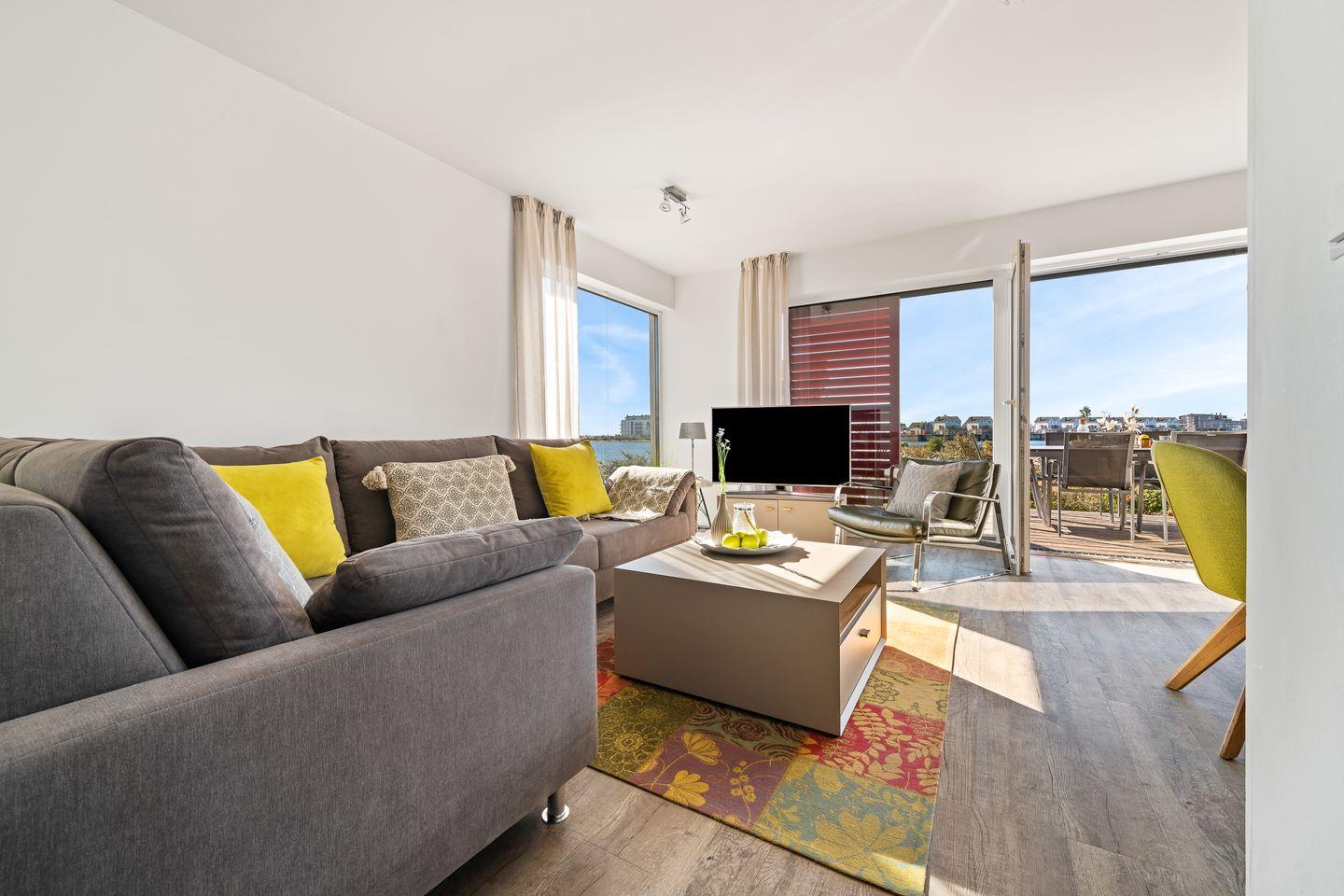 Der helle und freundliche Wohn- und Essbereich verfügt über bodentiefe Fensterfronten mit wunderbarem Blick auf die Terrasse und den davorliegenden Yachthafen. Die nach Süden ausgerichtete Terrasse ist direkt von dem Wohnbereich zugänglich und lädt ganztags zum Entspannen im eigenen Strandkorb oder einem gemütlichen Essen beim Sonnenuntergang ein.