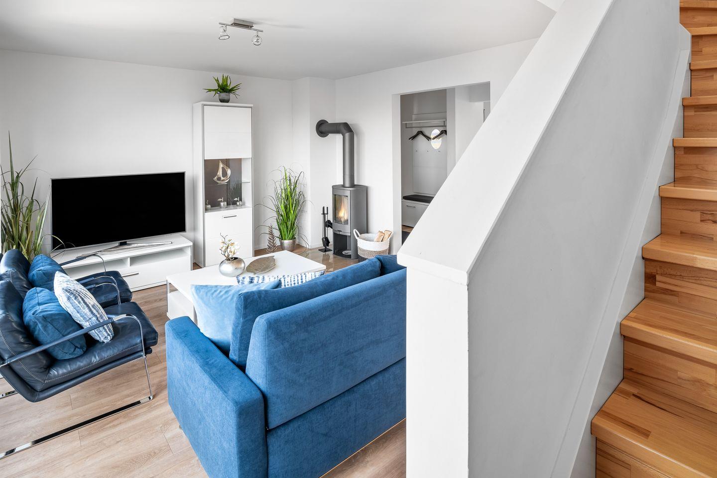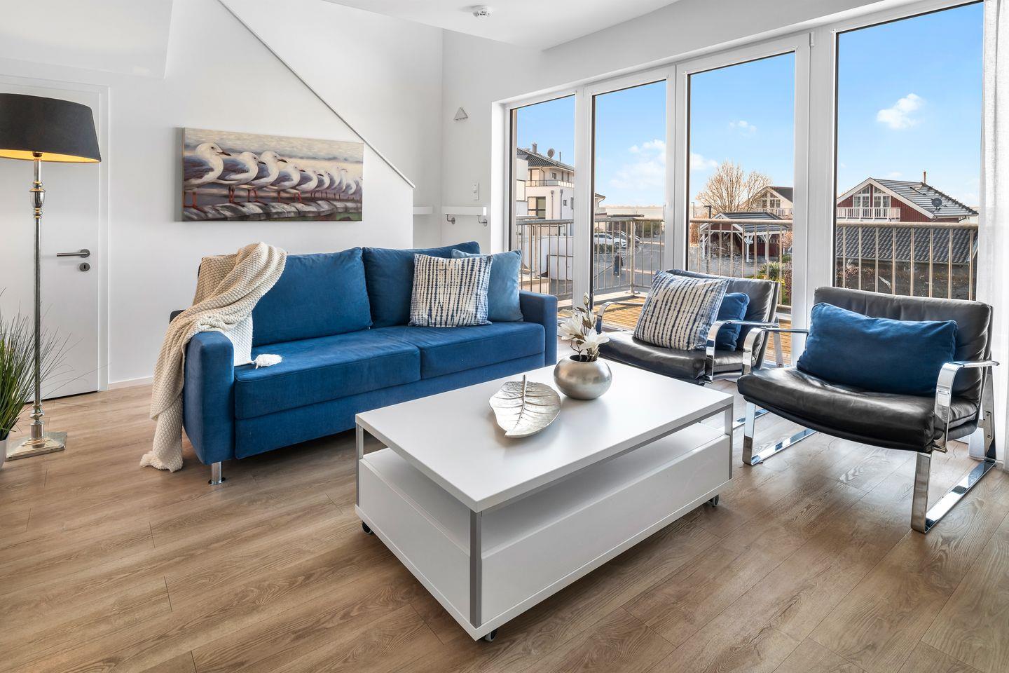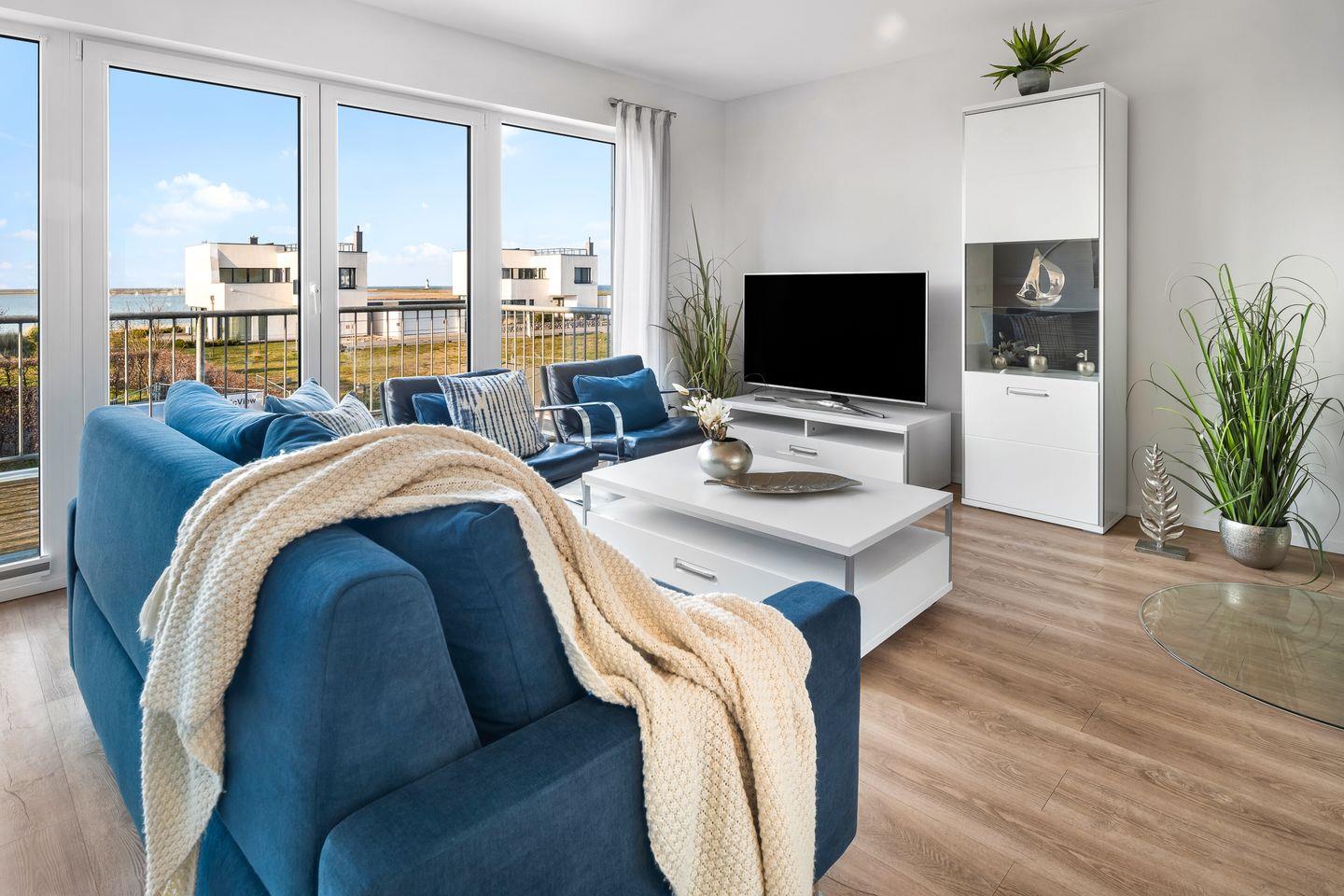 Im Wohnzimmer verlockt ein großer Smart-TV, ein Kaminofen und ein gemütliches Zweier-Stoffsofa und zwei lederbezogenen Clubsesseln, zum längeren Verweilen und Ausspannen. Das Wohnzimmer, wie auch der Balkon, sind der Landseite hin zugewandt. Von hier aus kann man in Sichtweite die auf der Schlei vorbeiziehenden Segelschiffe und Ausflugsdampfer beobachten.