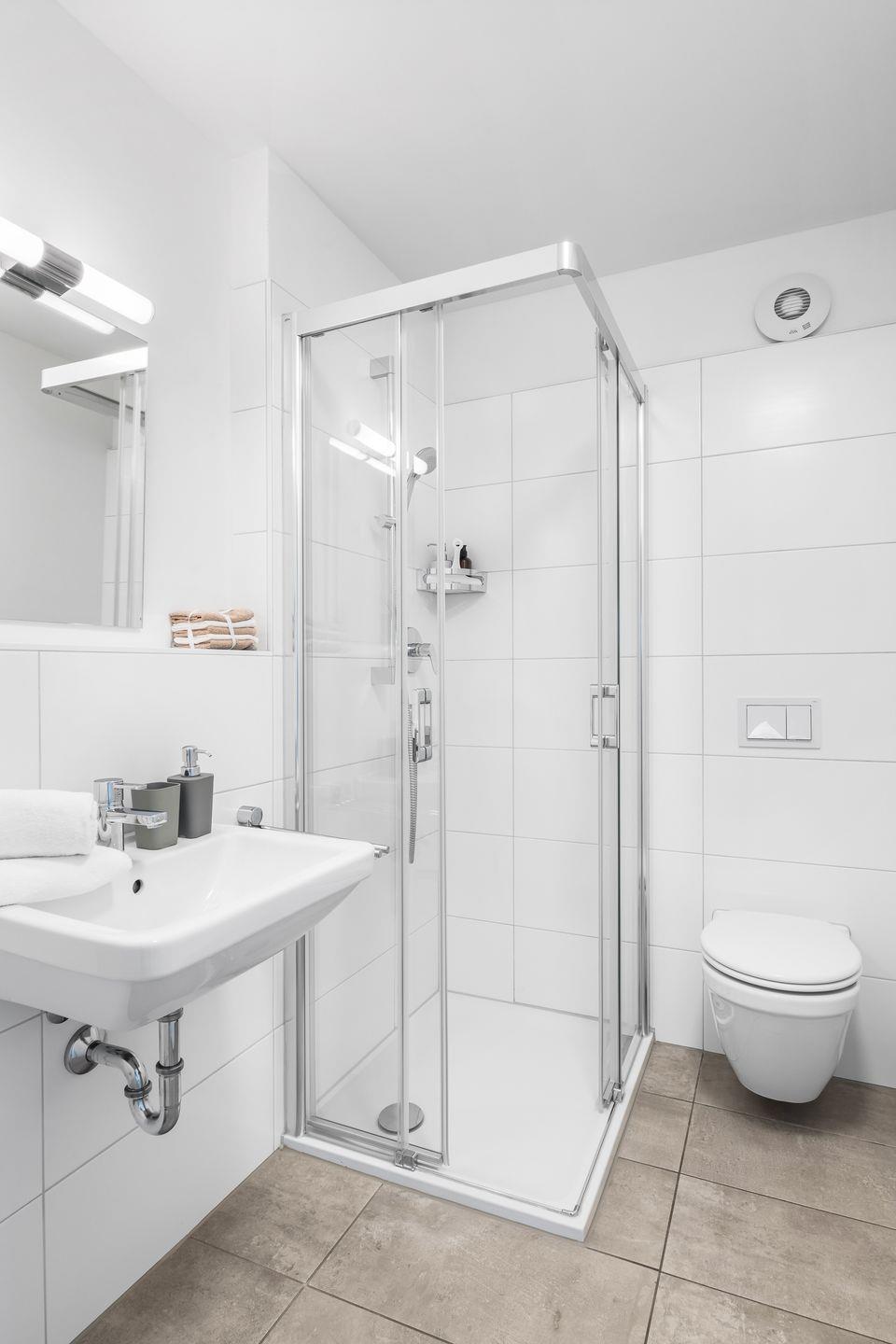 Nach einem ereignisreichen Urlaubstag verspricht das geräumige Bad mit einer bodengleichen, verglasten Rainshowerdusche, der großen Eck-Whirlbadewanne und der Infrarot-Wärme-Kabine Wellness pur. Ein Handtuchheizkörper, Waschbecken mit Spiegel, sowie ein WC vervollständigen hier die Einrichtung.
