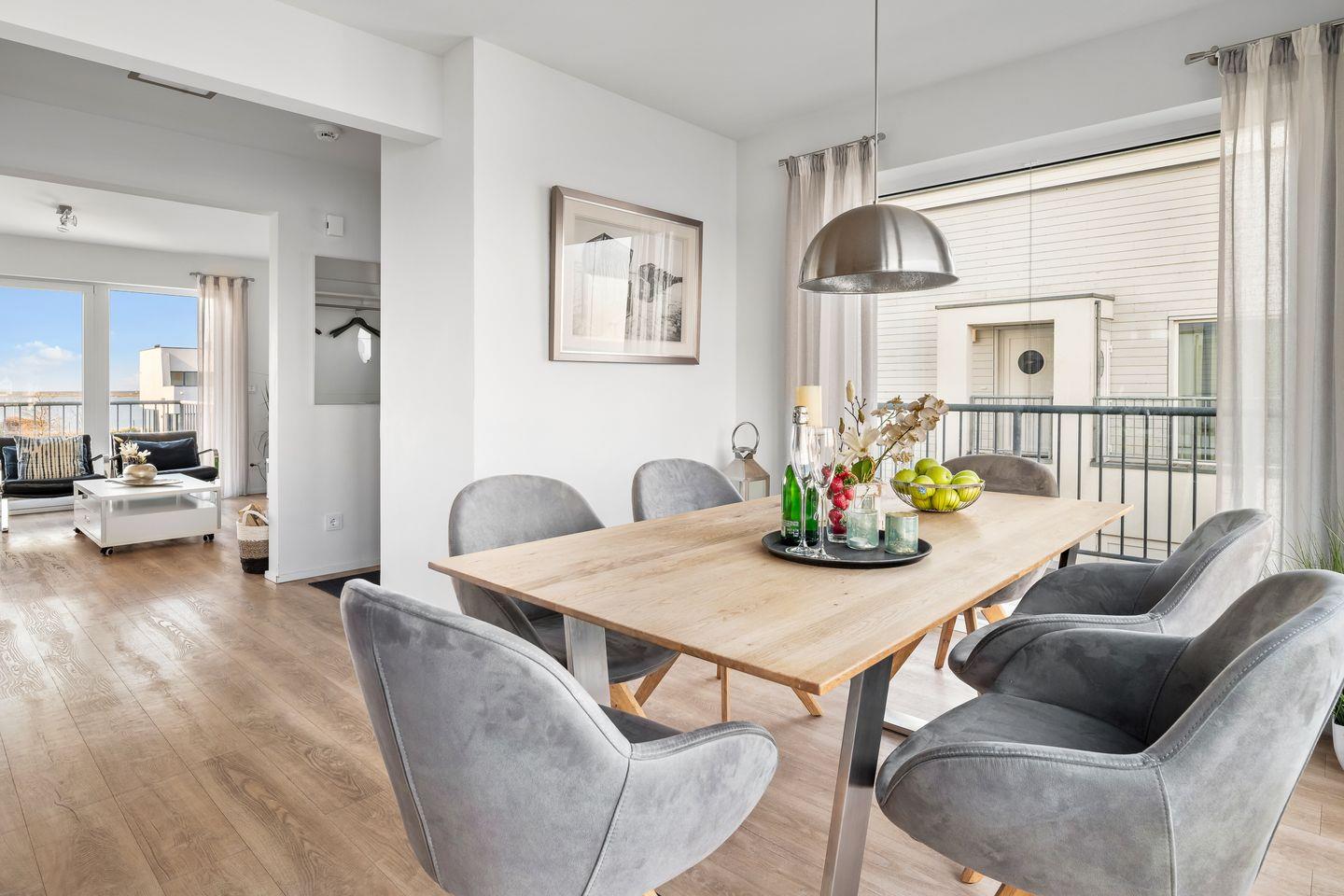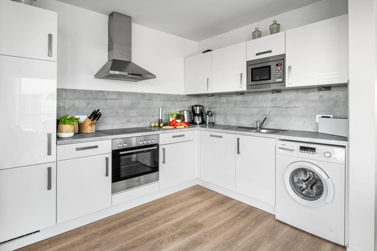Auf der gegenüberliegenden Seite wartet die modern und voll ausgestattete Küche mit allem auf, was kreatives Kochen auch im Urlaub möglich macht. Die dort zubereiteten Köstlichkeiten können dann gemeinsam im nebenan liegenden Esszimmer verzehrt werden. Der große Esstisch mit seinen sechs gemütlichen Stühlen spiegelt die eleganten Farben der Küche wider und dürfte mit Sicherheit auch längeren Spieleabenden standhalten.