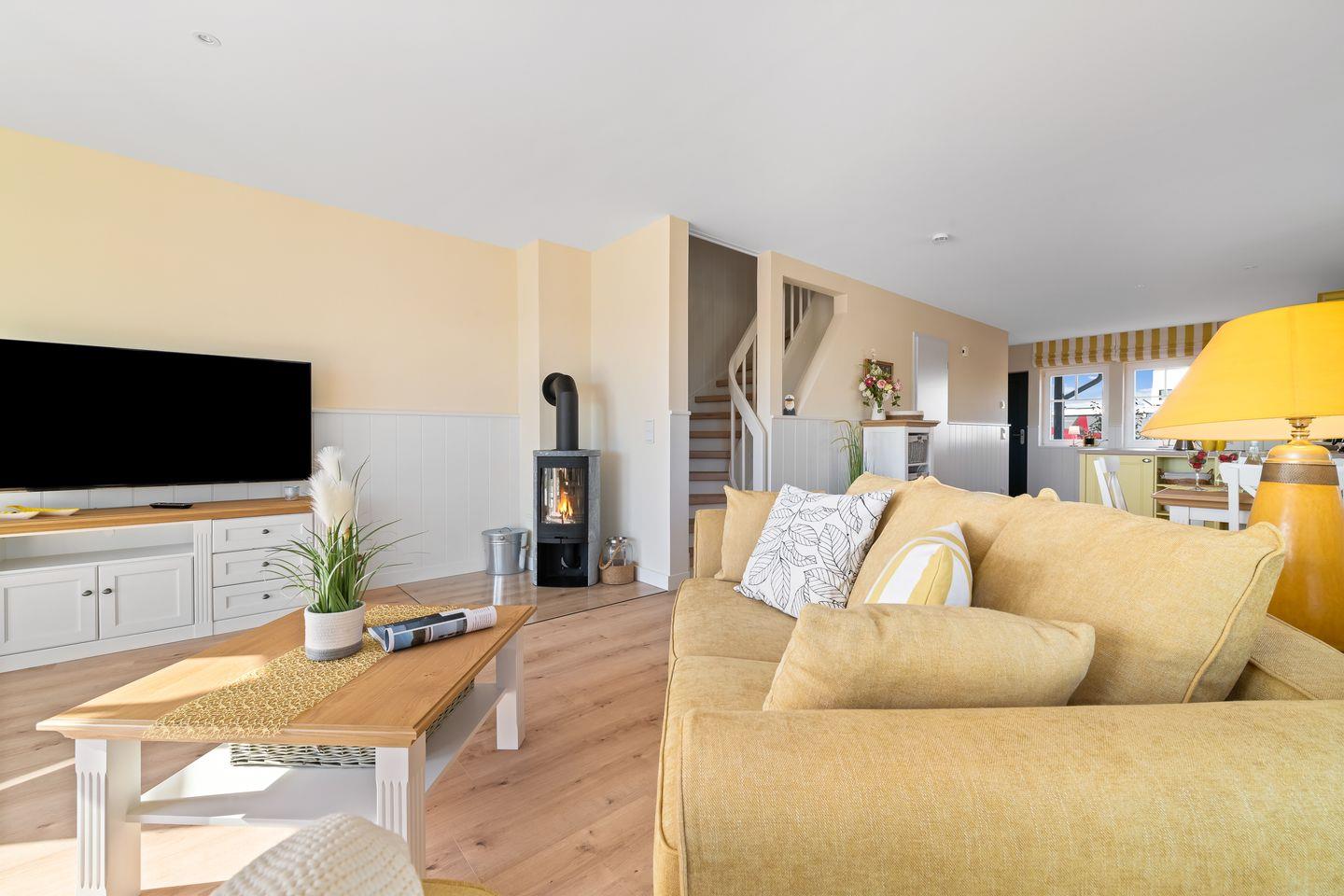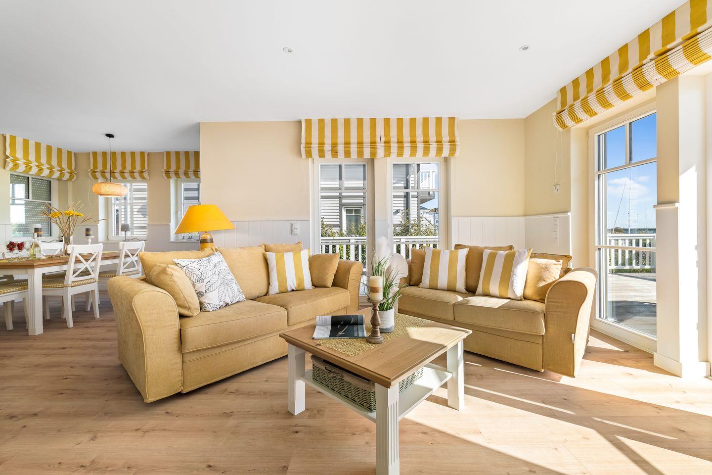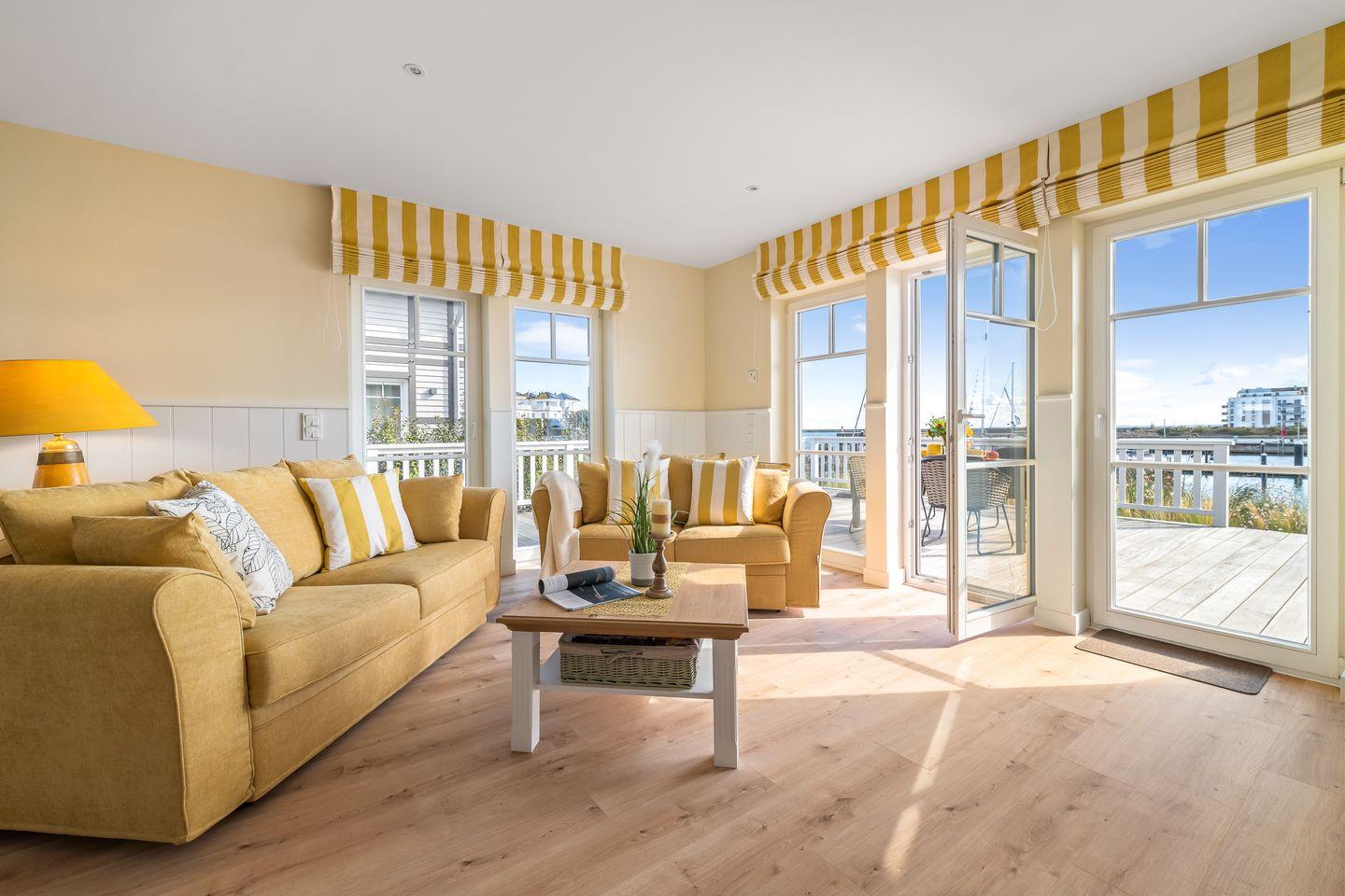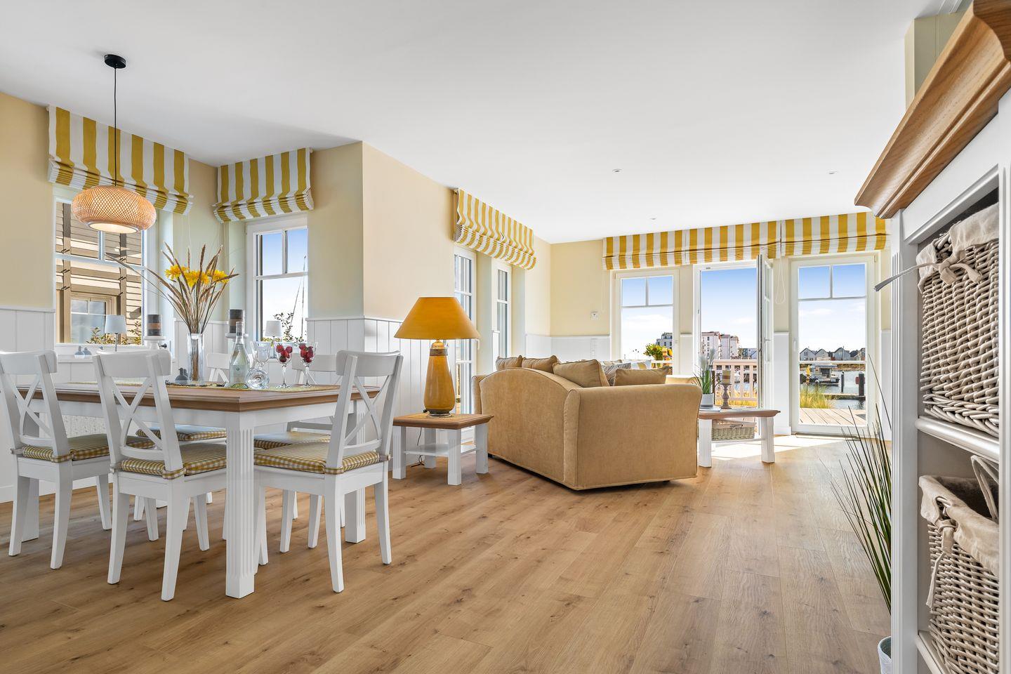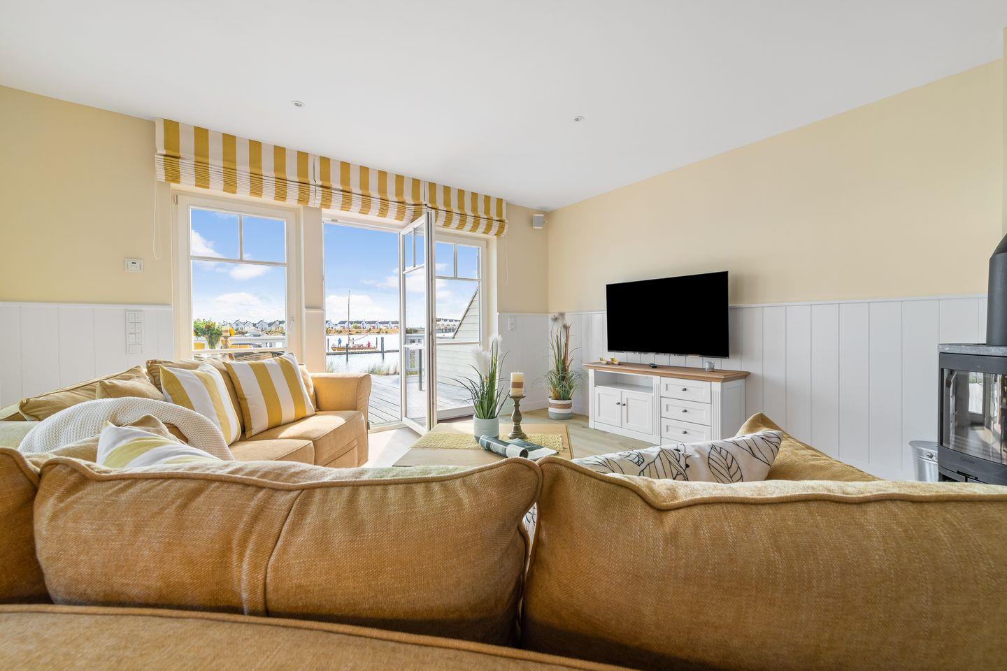 Das Ferienhaus „Hafenglück" zeichnet sich durch einen behaglichen Landhausstil aus. Der Wohn- und Essbereich im Erdgeschoss ist zur Wasserseite ausgerichtet. Bodentiefe Panoramafenster eröffnen einen weiten Blick auf den Segel- und Sportboothafen sowie die Ostsee. Das helle Wohnzimmer ist mit zwei Sofas, einem großen Smart-TV und einem Kamin ausgestattet.