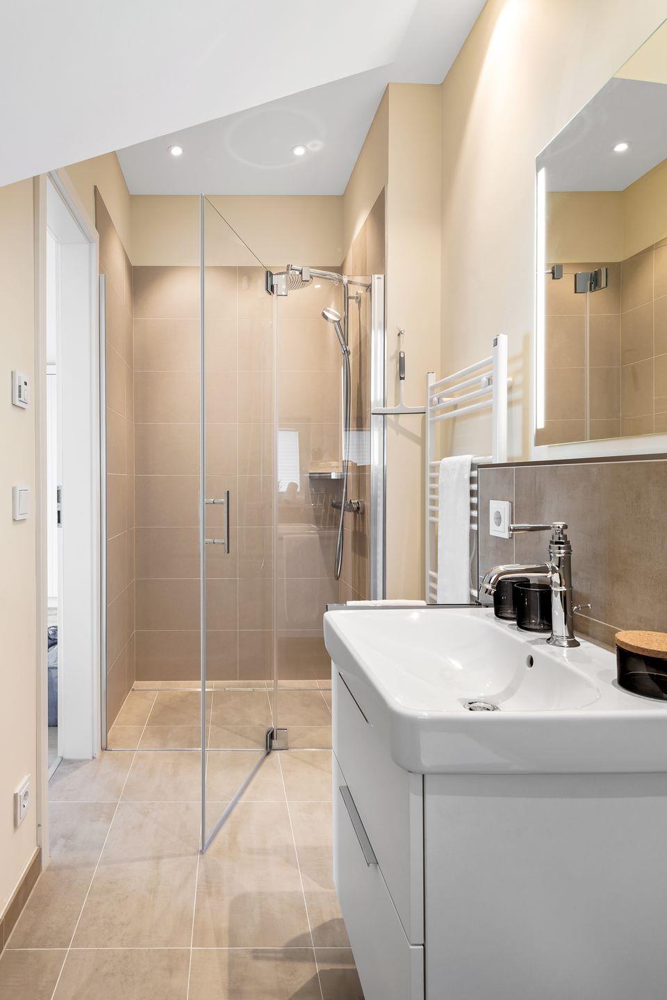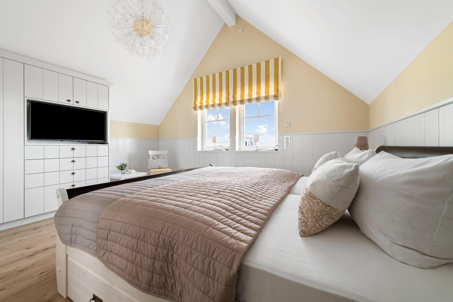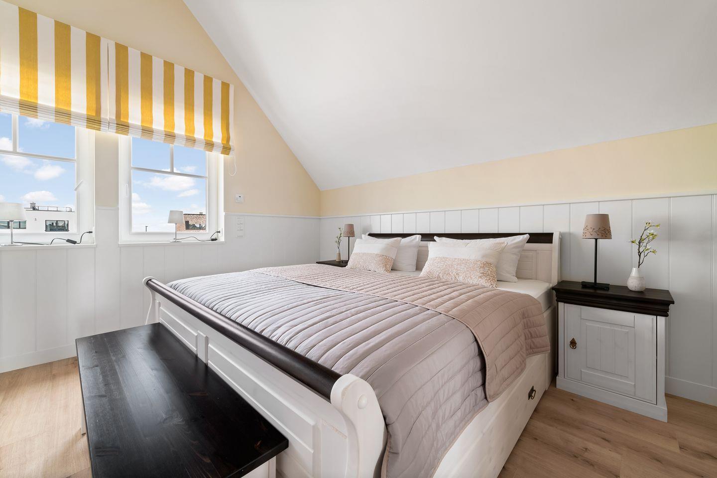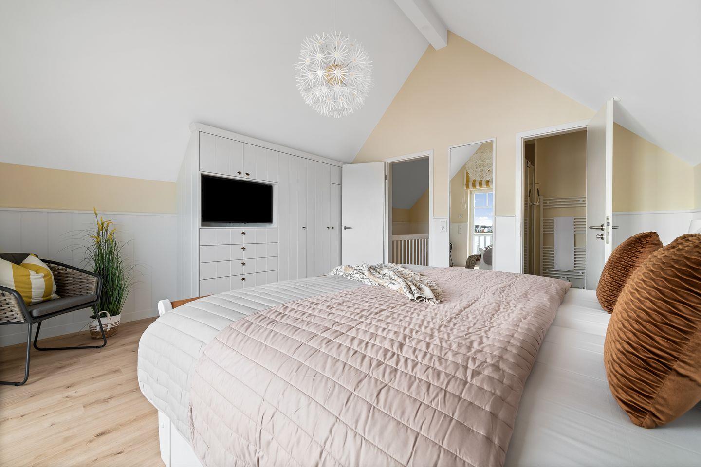 Im Obergeschoss befinden sich zwei Schlafzimmer mit jeweils einem Doppelbett (1,80m x 2,00m), einem Flatscreen-TV, einem geräumigen Kleiderschrank und einem Sessel. Jedes Zimmer verfügt über ein eigenes Badezimmer mit WC, Waschbecken, Spiegel und einer bodengleichen Dusche oder Badewanne. Das Schlafzimmer auf der Wasserseite bietet zudem einen Balkon mit Panoramablick auf den Hafen und die Ostsee.